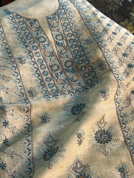 Sea Mist Shade Rasm Silk Chikankari With Ari Work Unstitched Kurta Dupatta Set