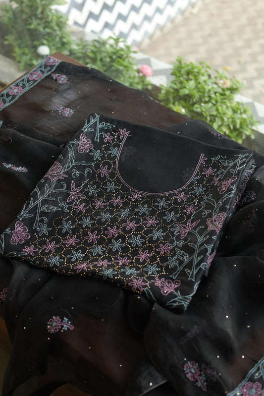 Noor Organza Silk Chikankari Mukaish Kamdani Unstitched Fabric