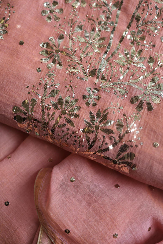 Peach Roheen Tissue Silk Mukaish Badla Fabric