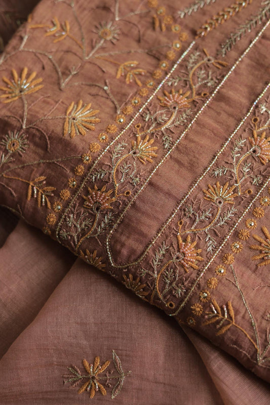 Peach Paper Tussar Resham Chikankari Unstitched Kurta Dupatta Set