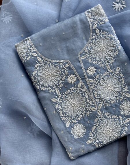 Powder Blue Noor Organza Silk Chikankari Unstitched Kurta Dupatta Set