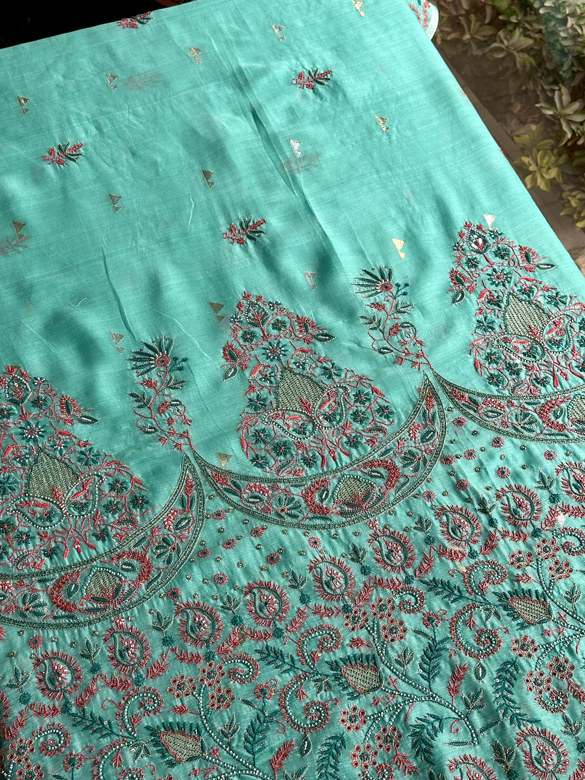 This exquisite aqua green Chanderi fabric is adorned with all-over handcrafted Chikankari buties, enhanced with delicate Ari work for added depth and elegance. The intricately embroidered motifs are complemented by a subtle tissue-finished border, giving the fabric a soft shimmer and refined charm