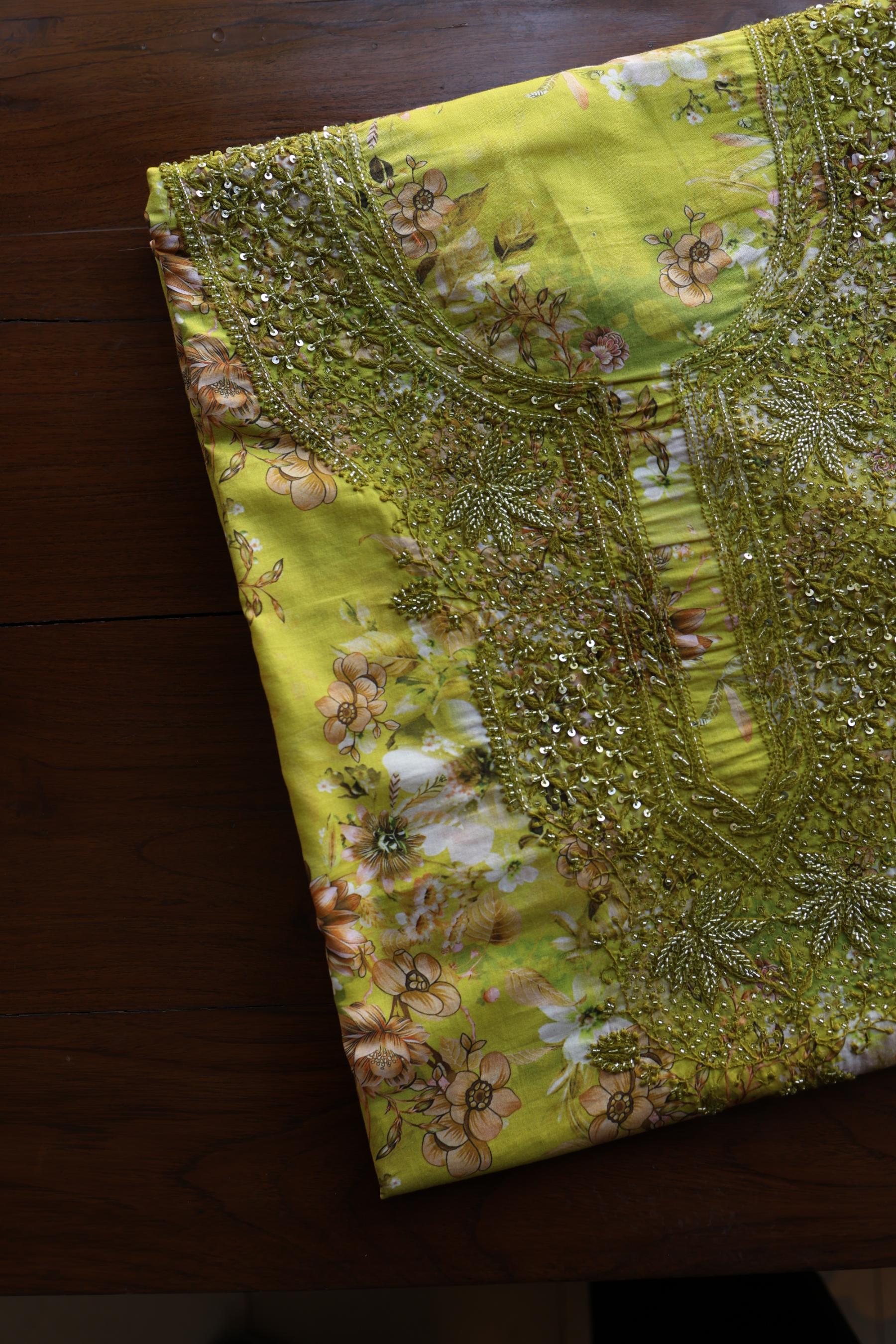 Avocado Green Floral Cotton Kurta Fabric with Chikankari & Sequin Work
