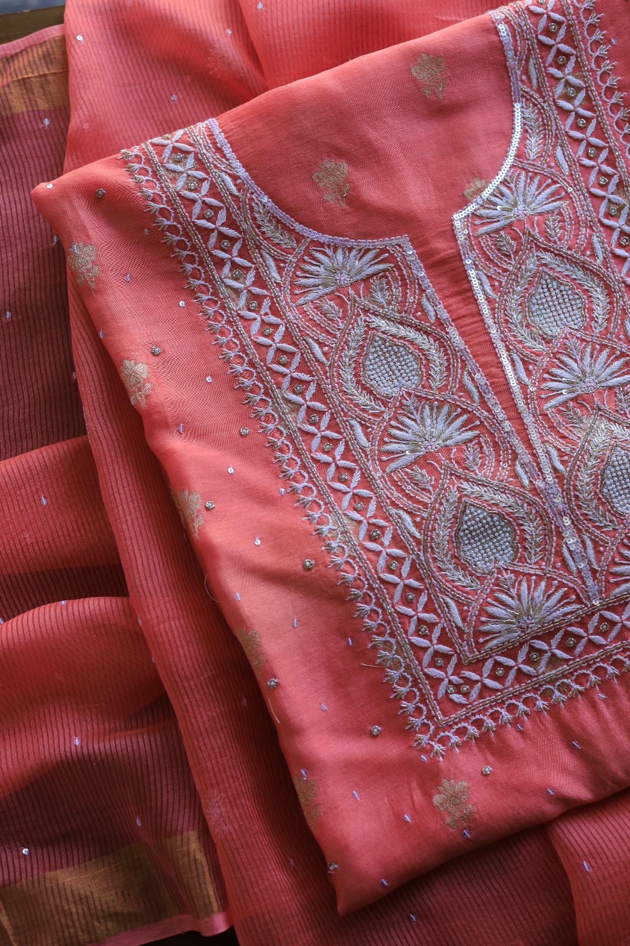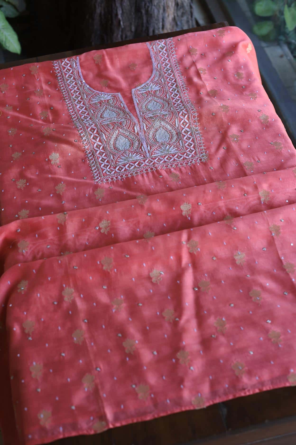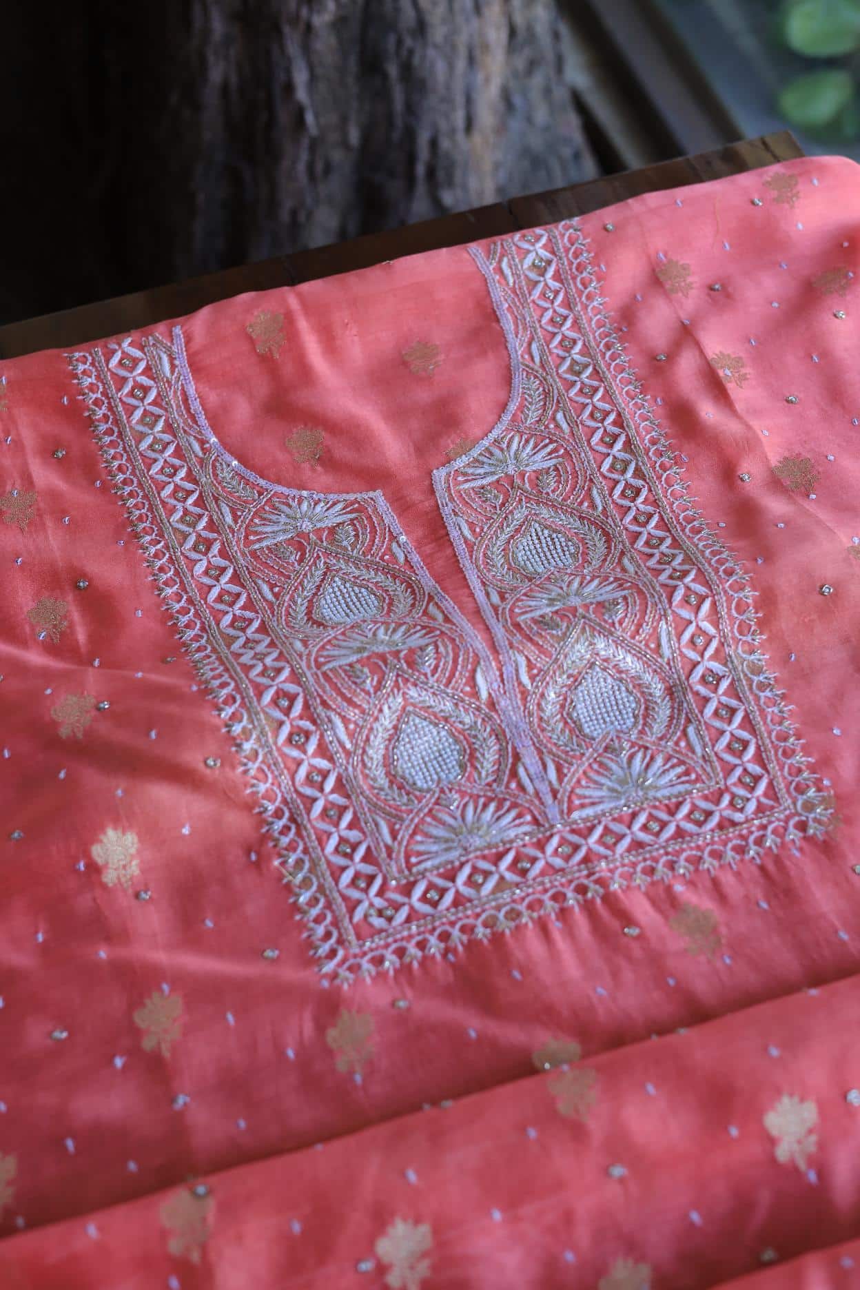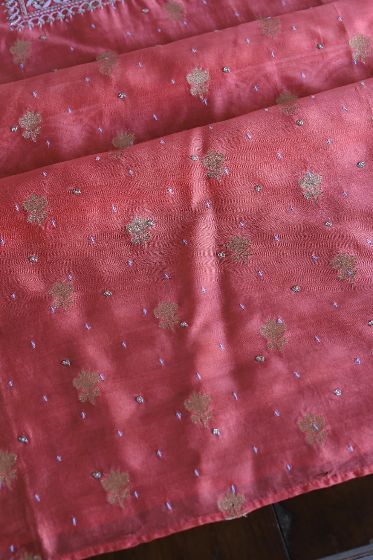 Carrot Pink Banarasi Zari Chanderi Unstitched Chikankari Fabrics