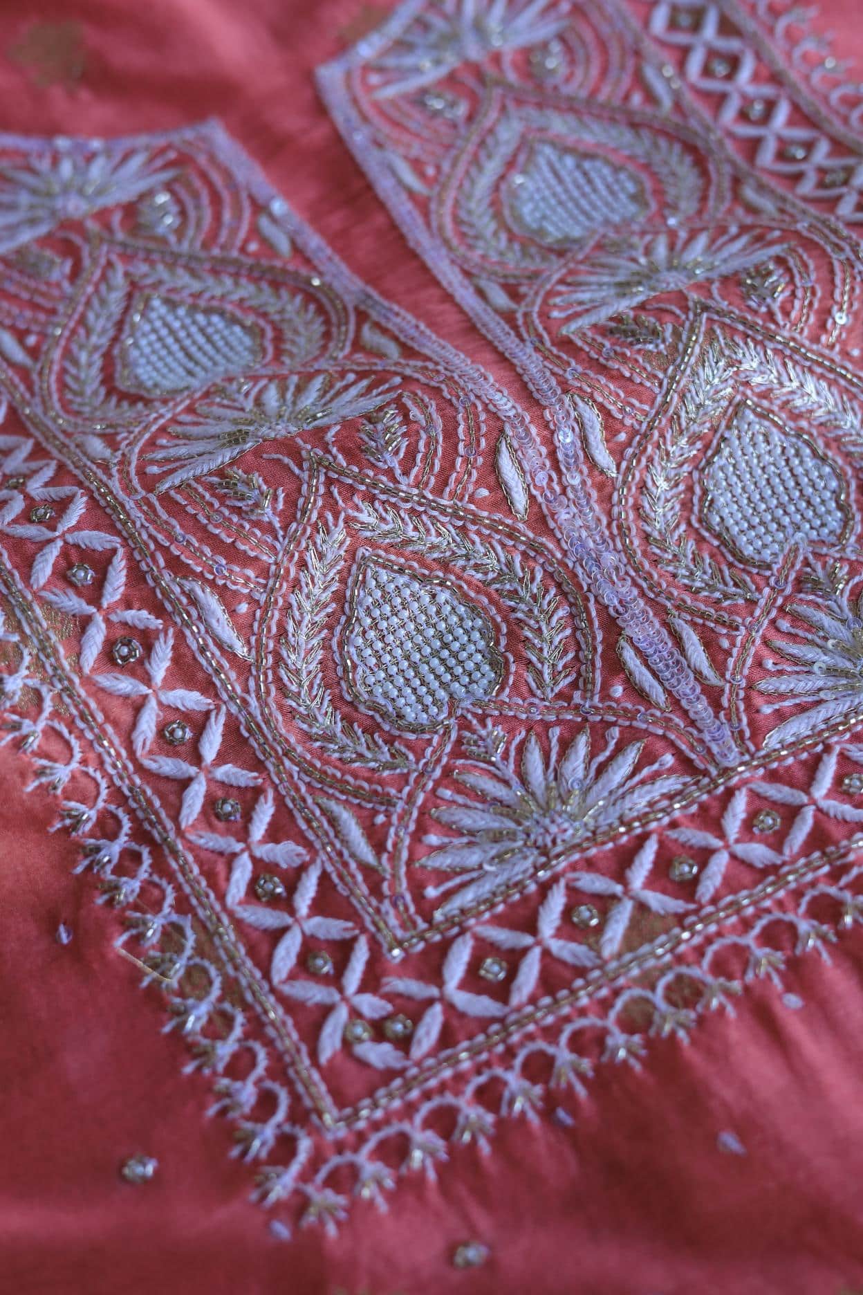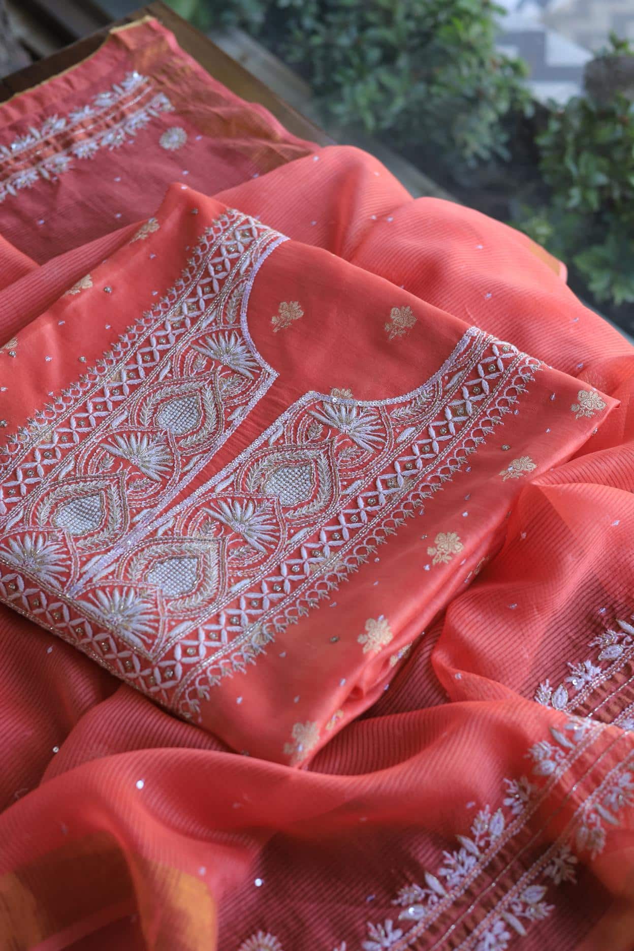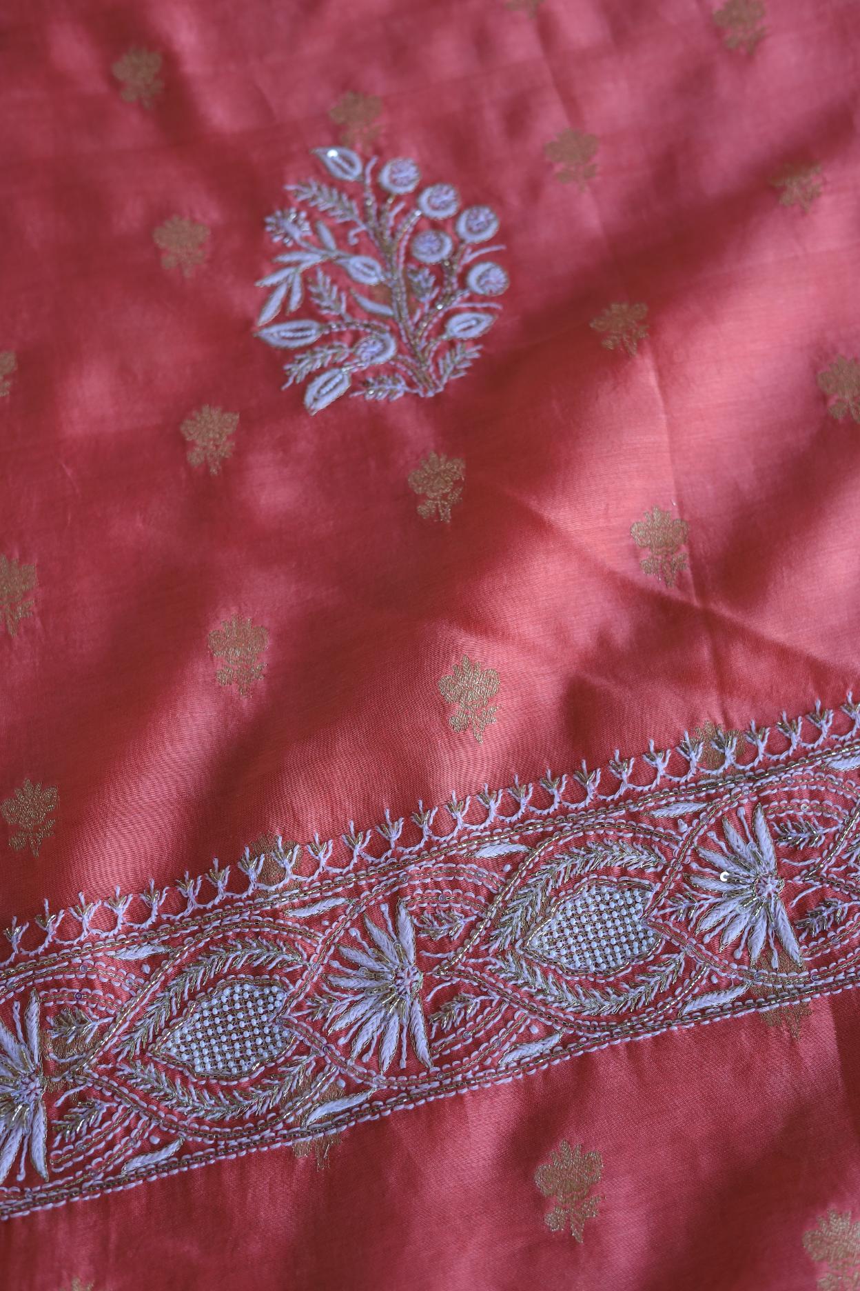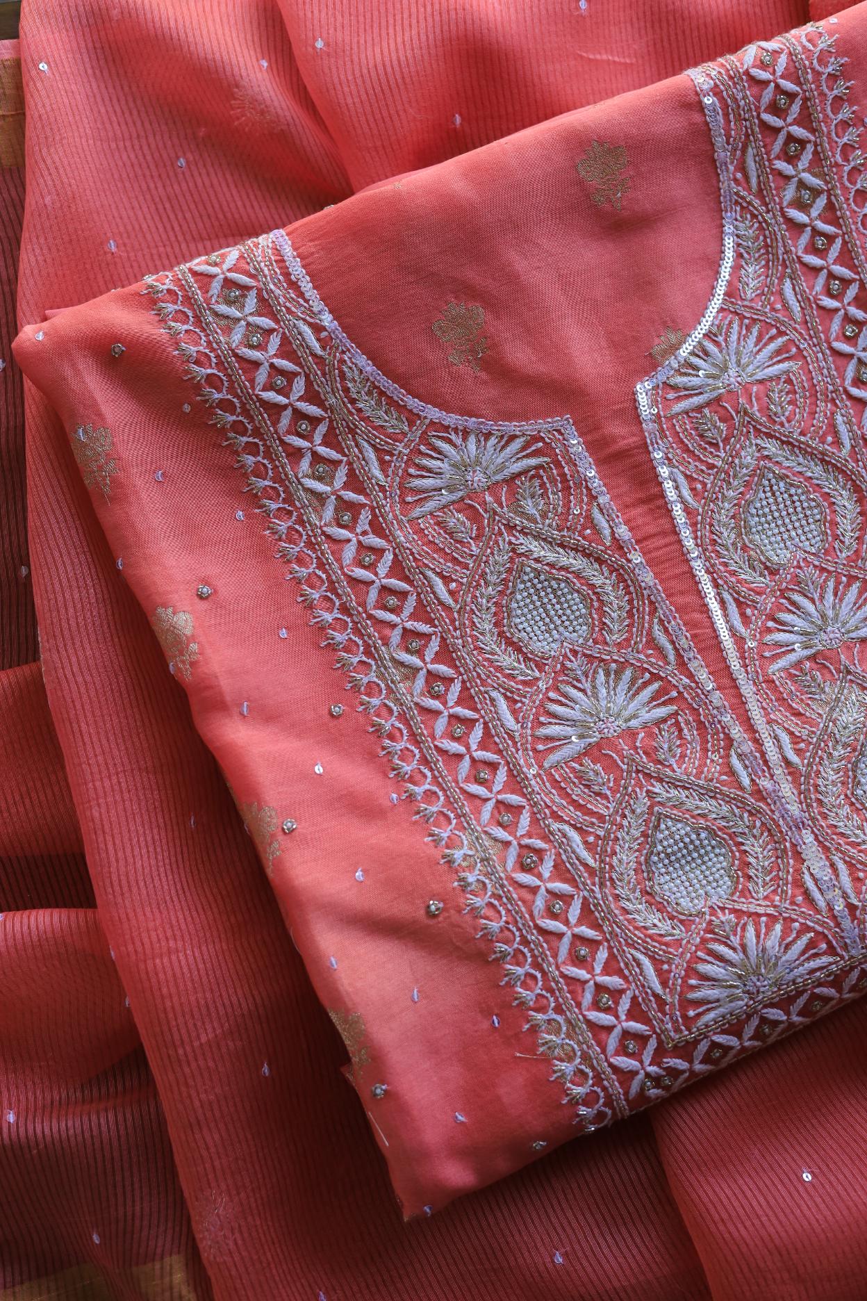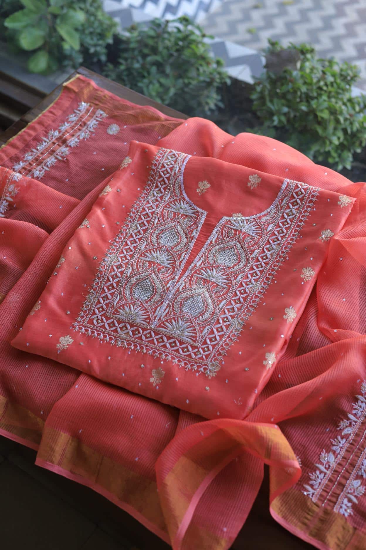 Carrot Pink Banarasi Zari Chanderi Unstitched Chikankari Fabrics