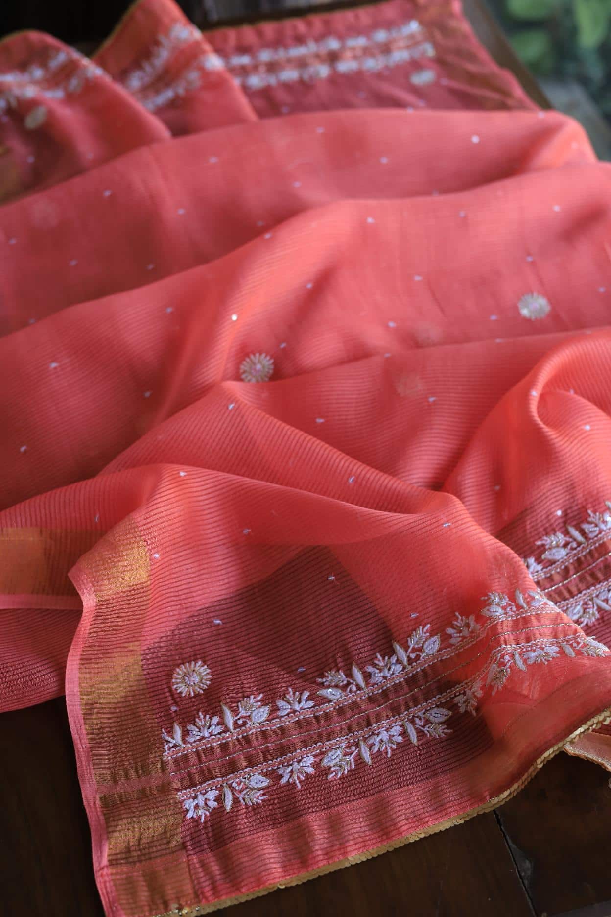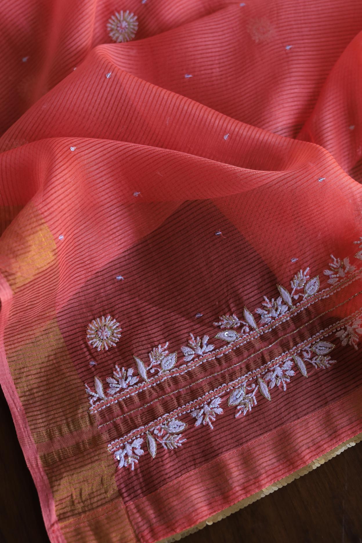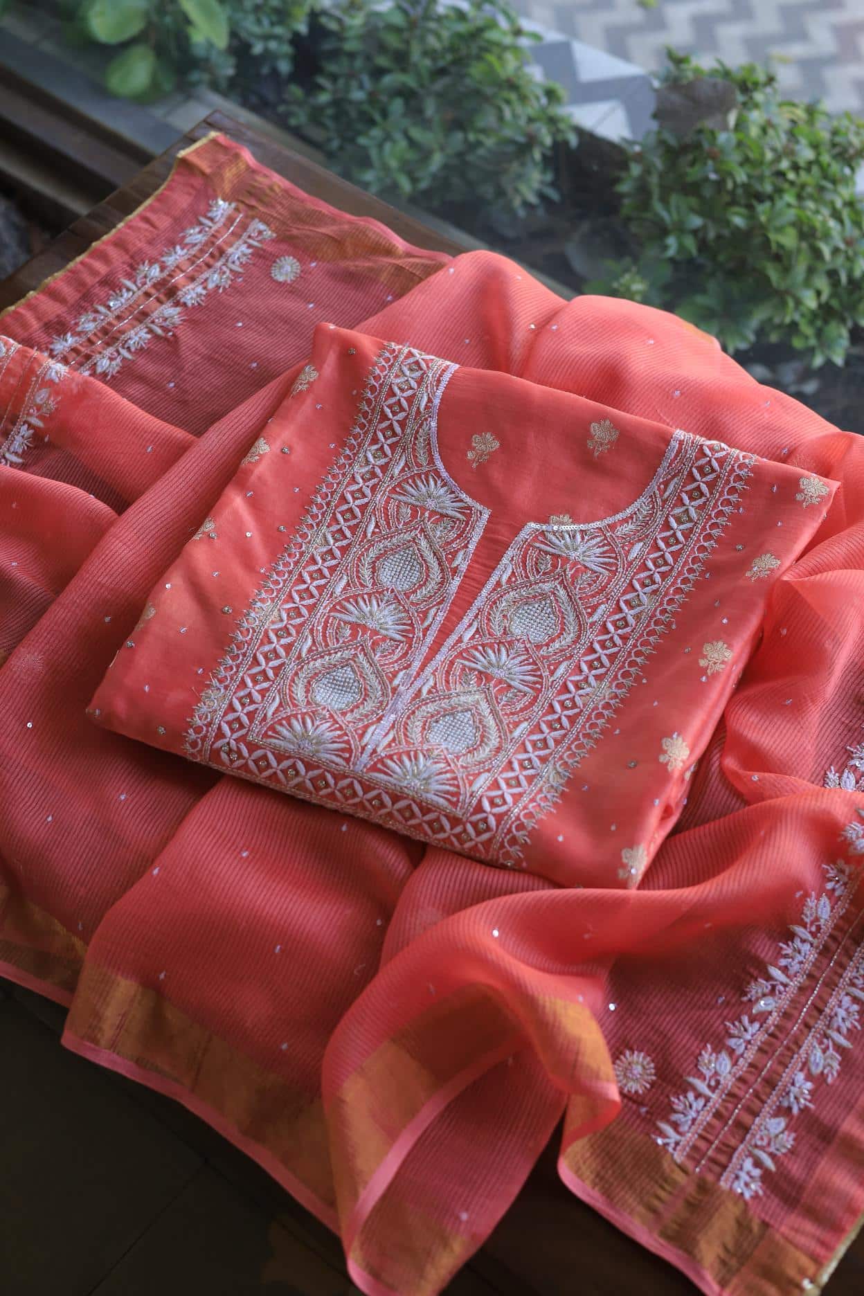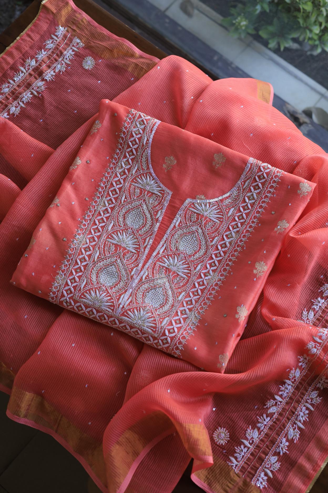 Carrot Pink Banarasi Zari Chanderi Unstitched Chikankari Fabrics