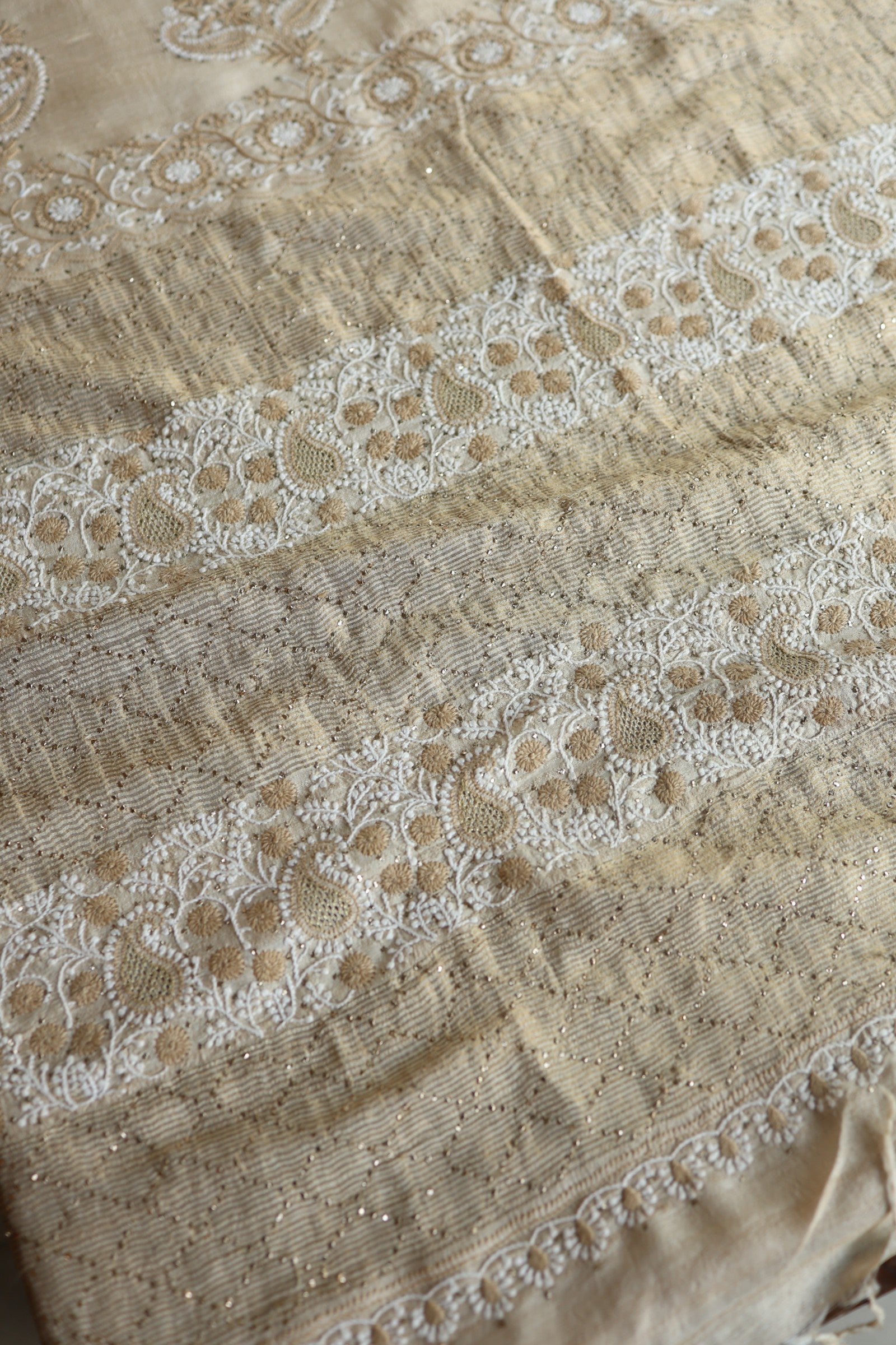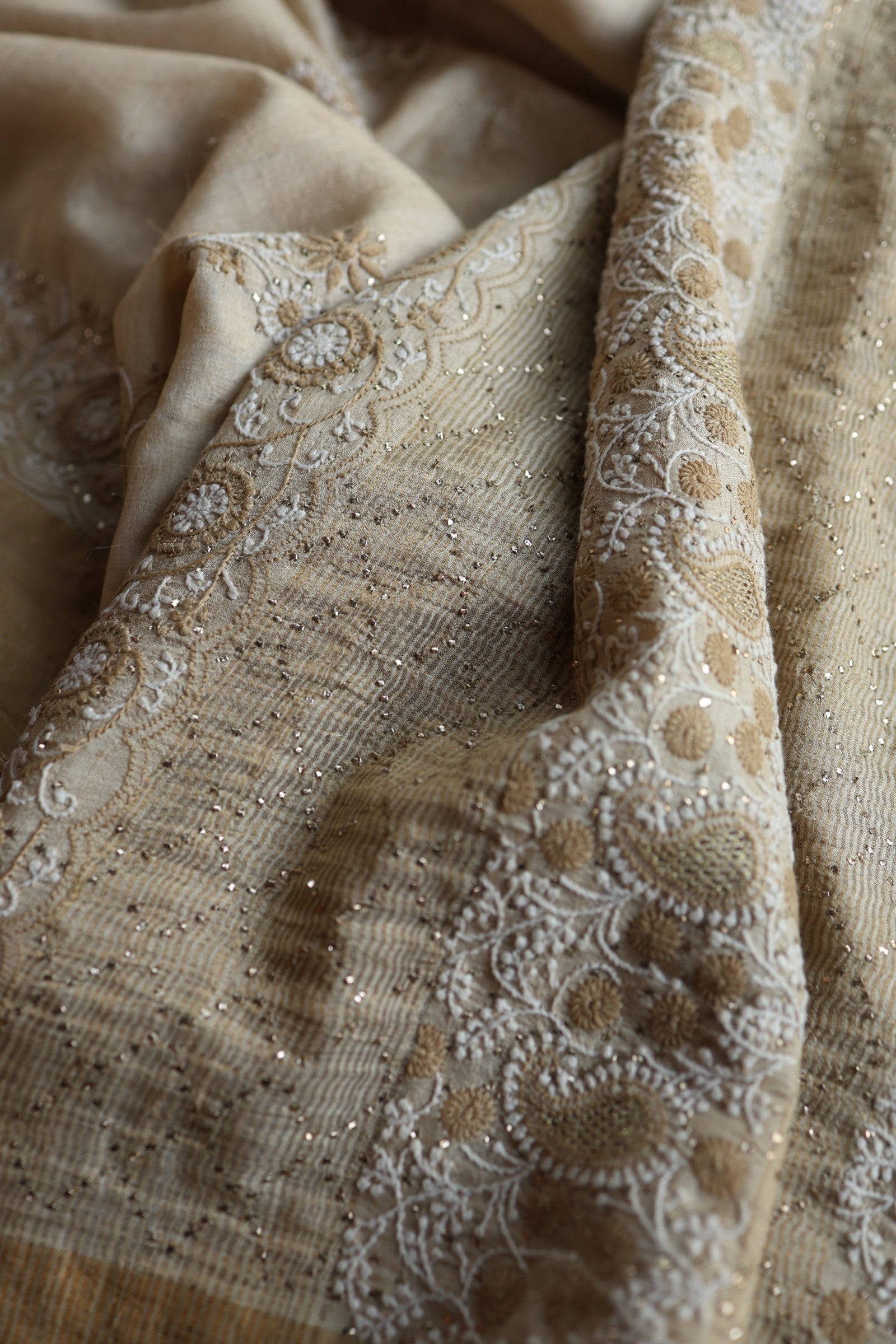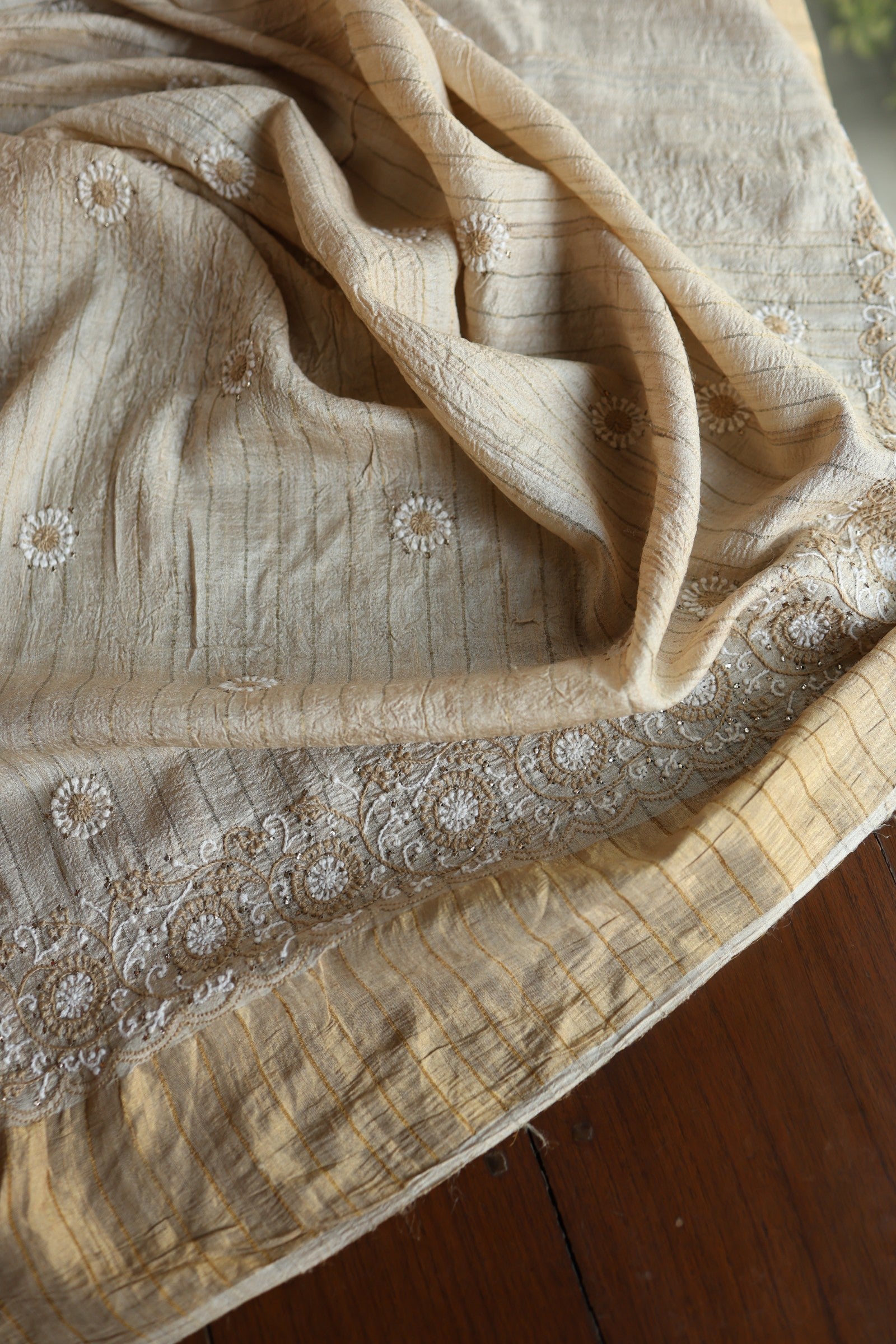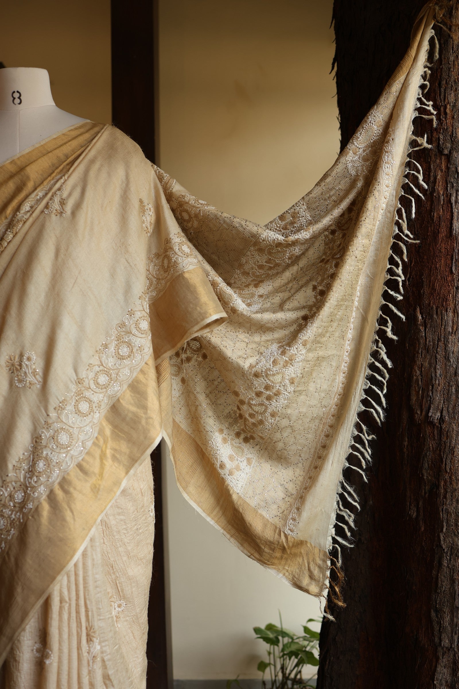 Natural tussar silk saree with intricate dual shade chikankari embroidered adorned with subtle kamdani for the classic look.