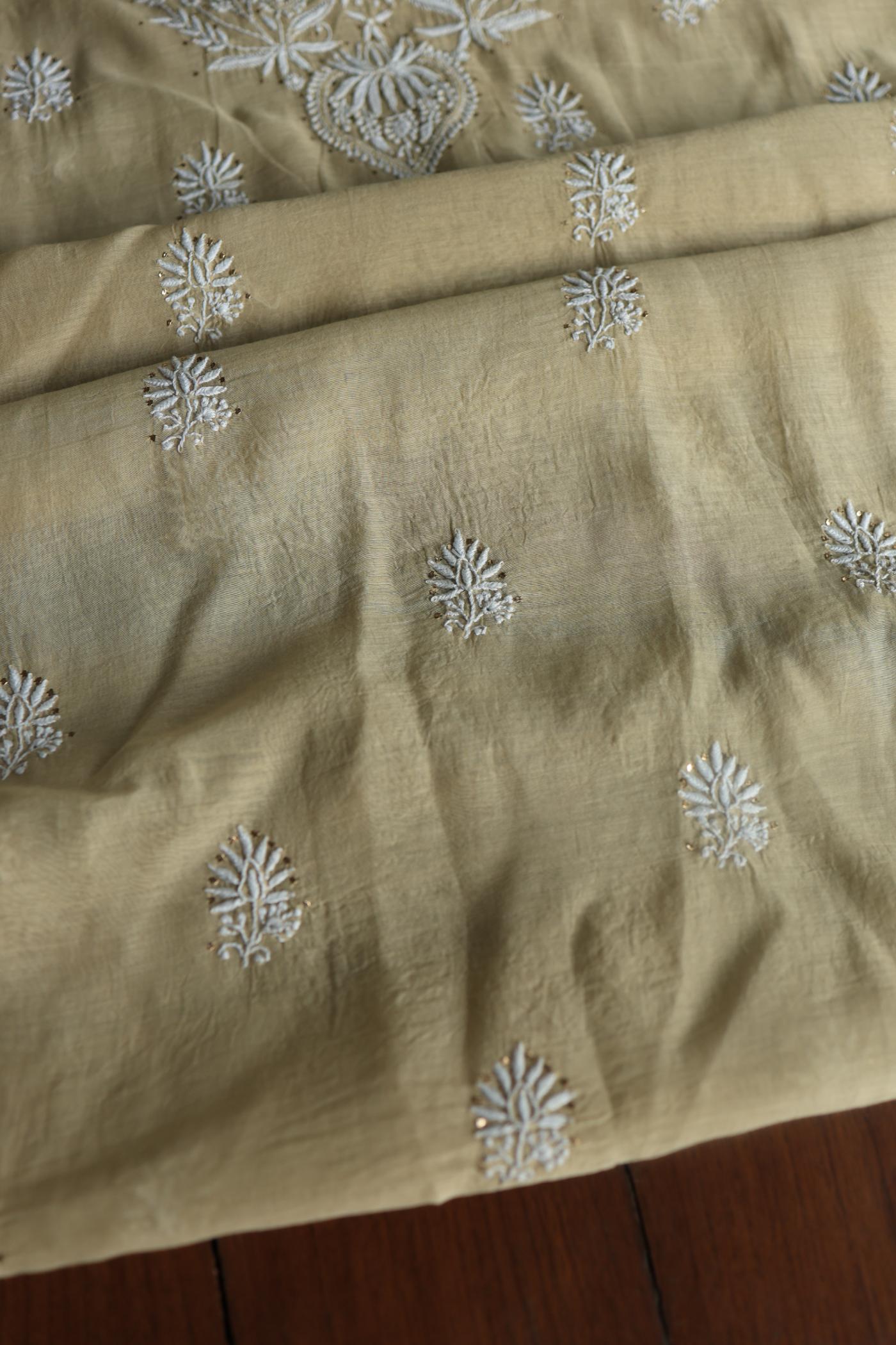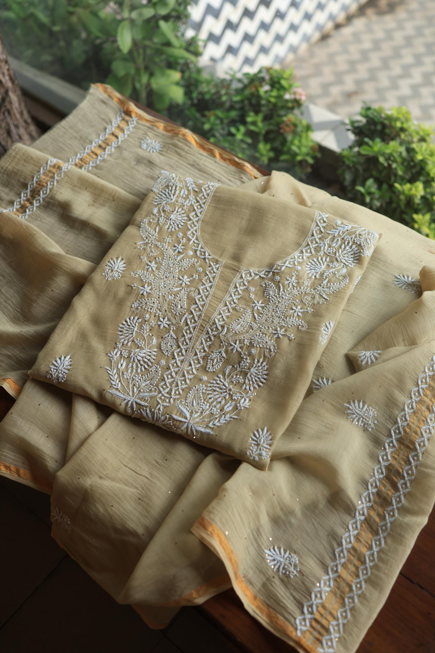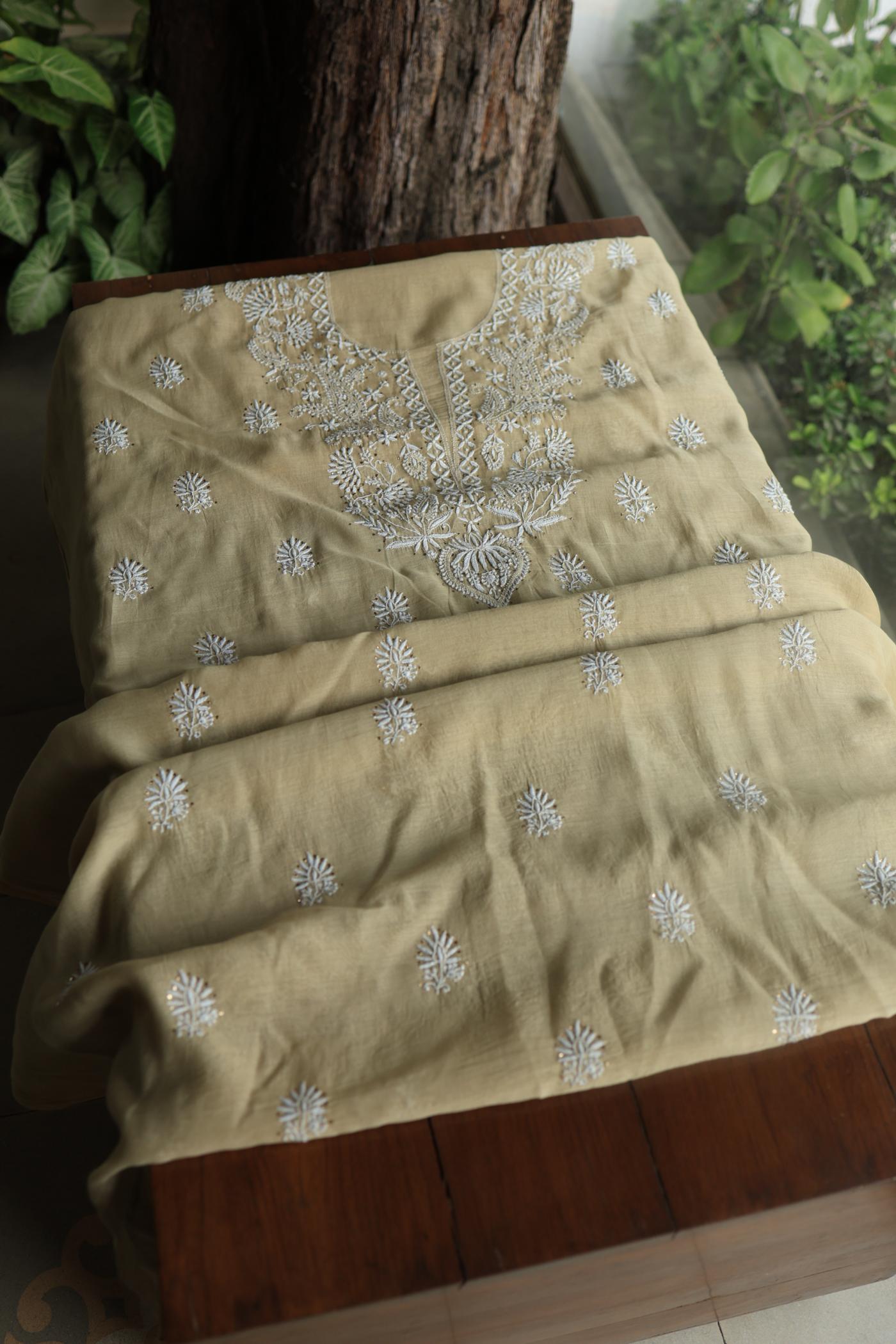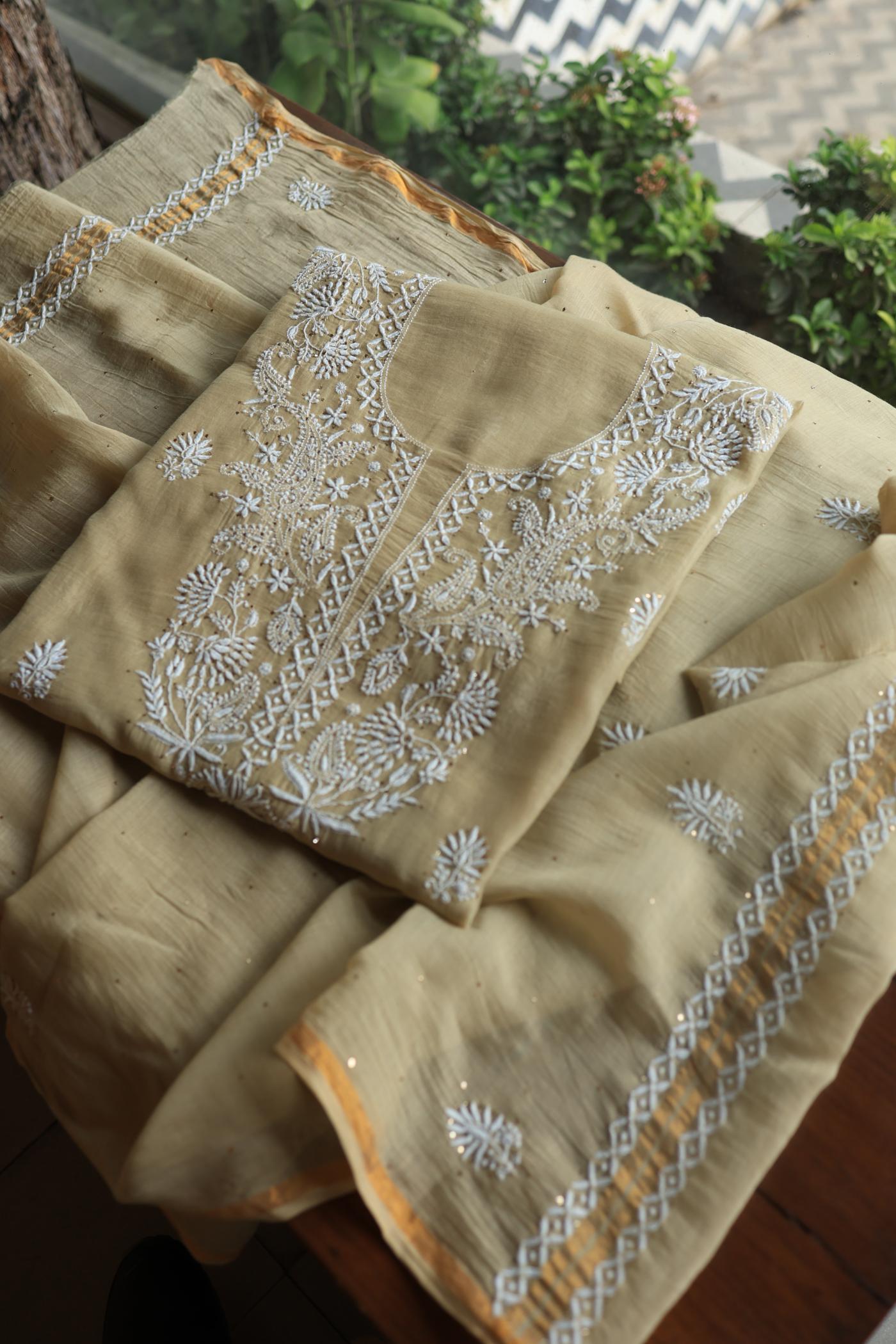 Beige Mal Cotton Chikankari Unstitched Kurta Dupatta Fabrics With Kamdani