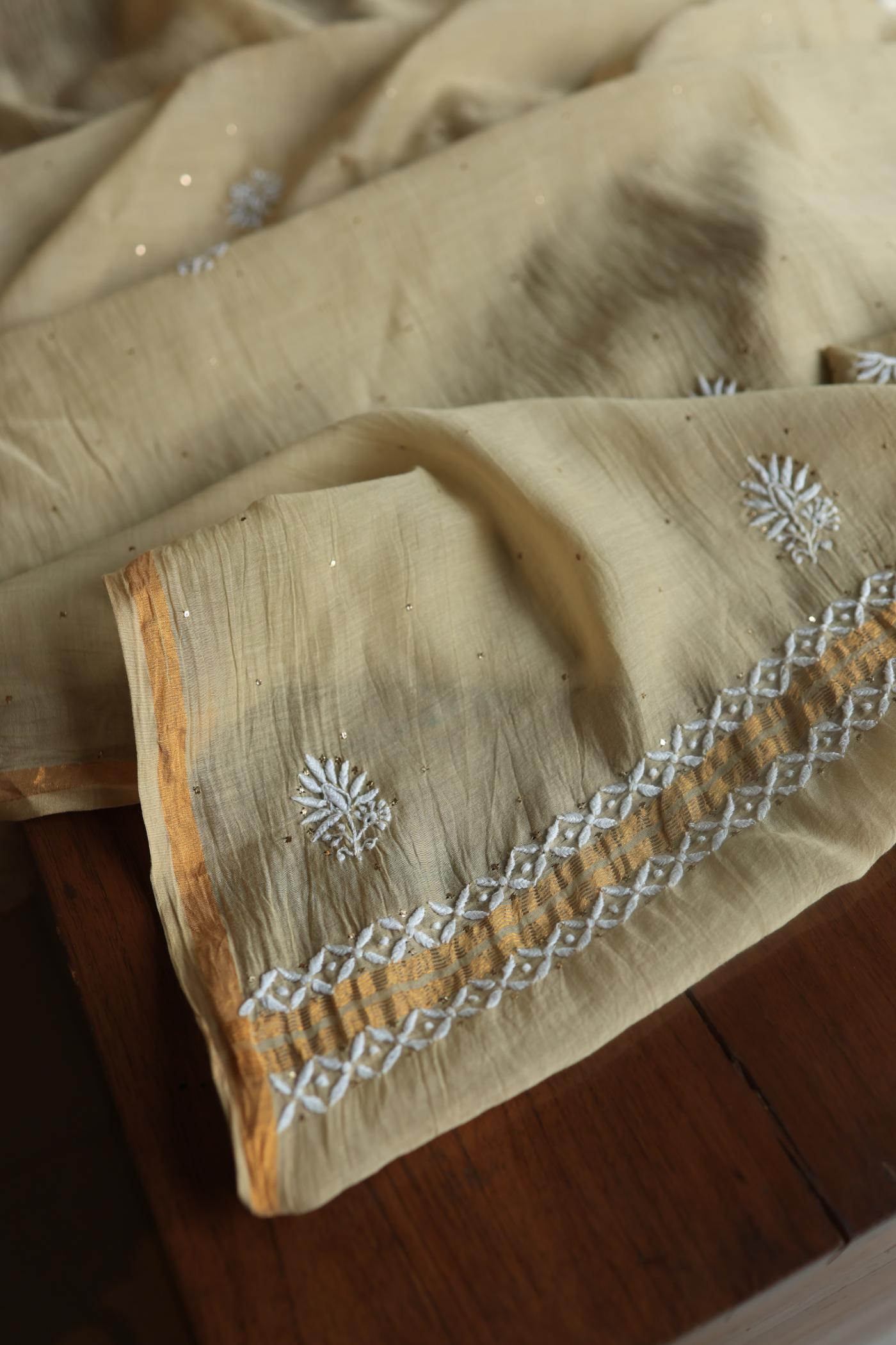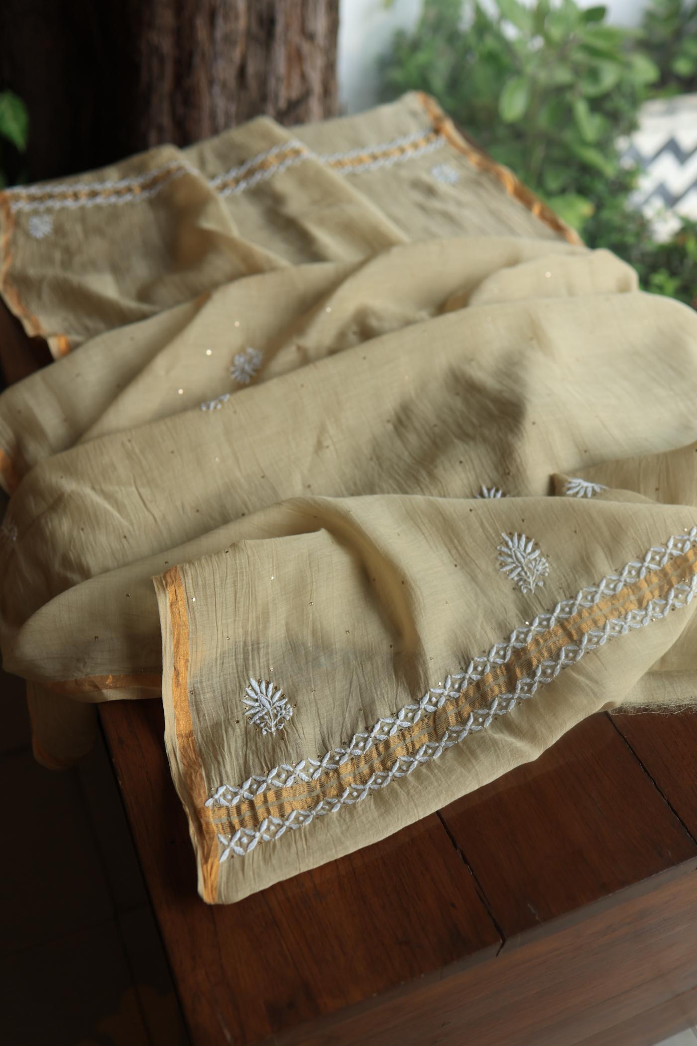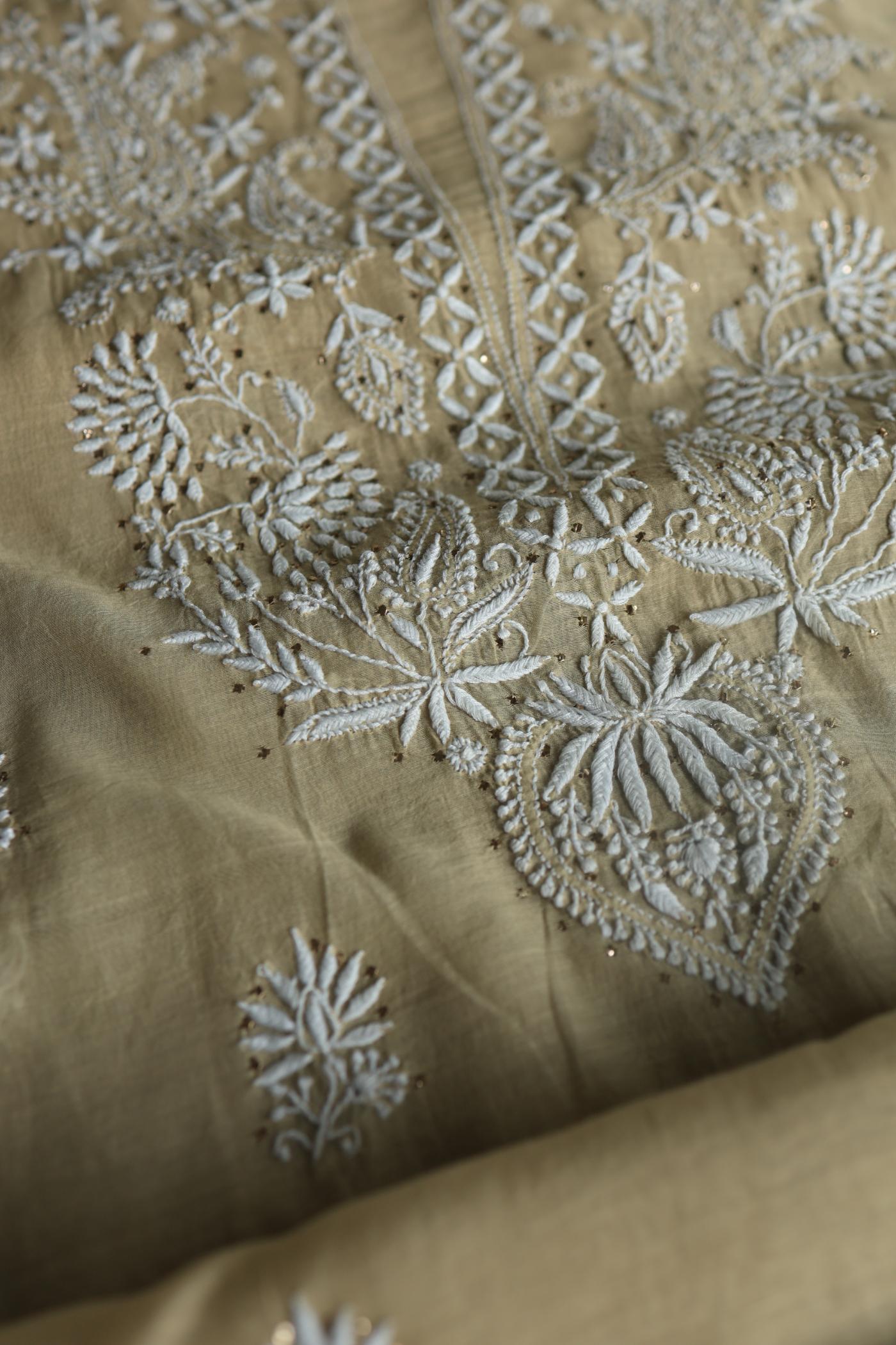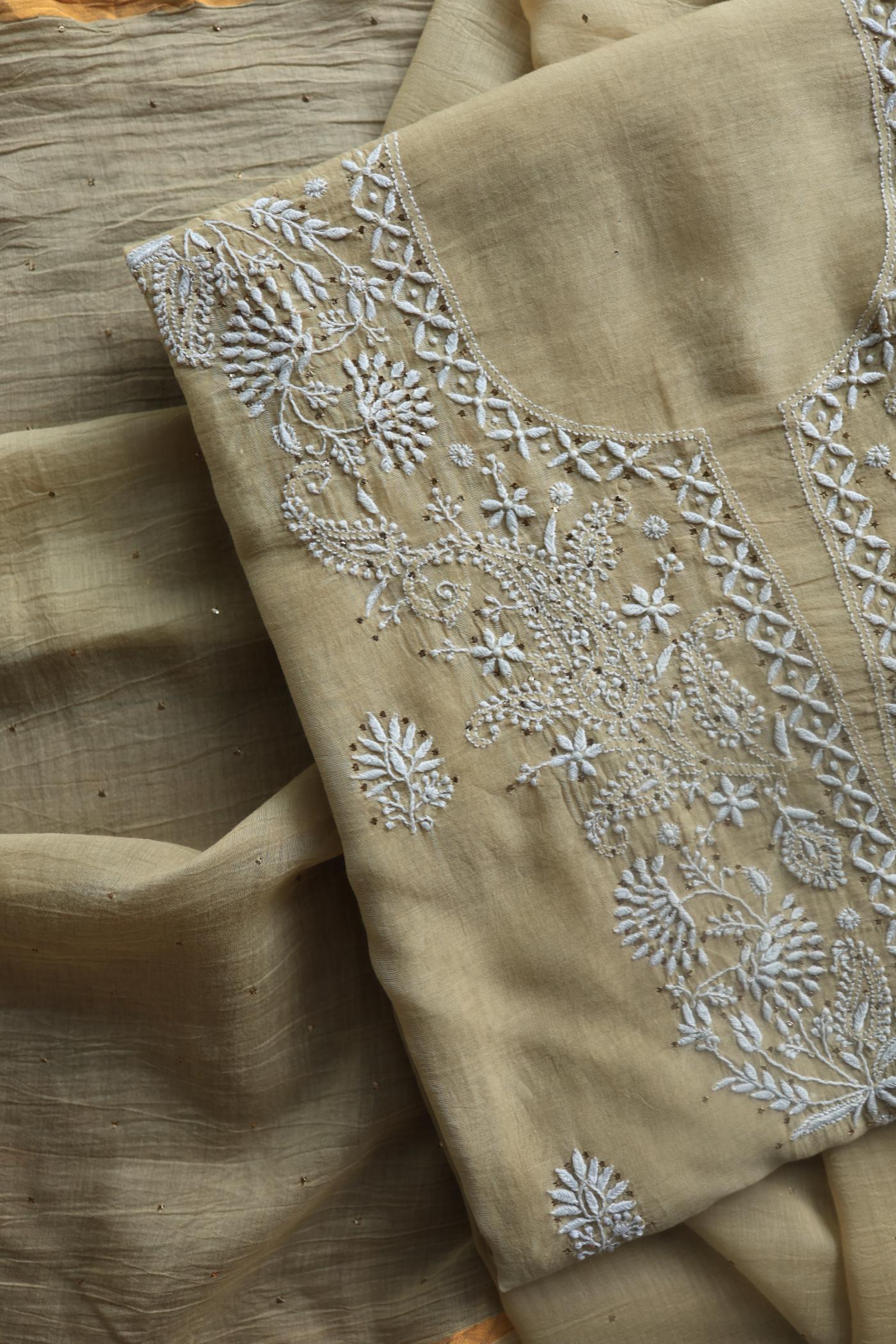 Beige Mal Cotton Chikankari Unstitched Kurta Dupatta Fabrics With Kamdani