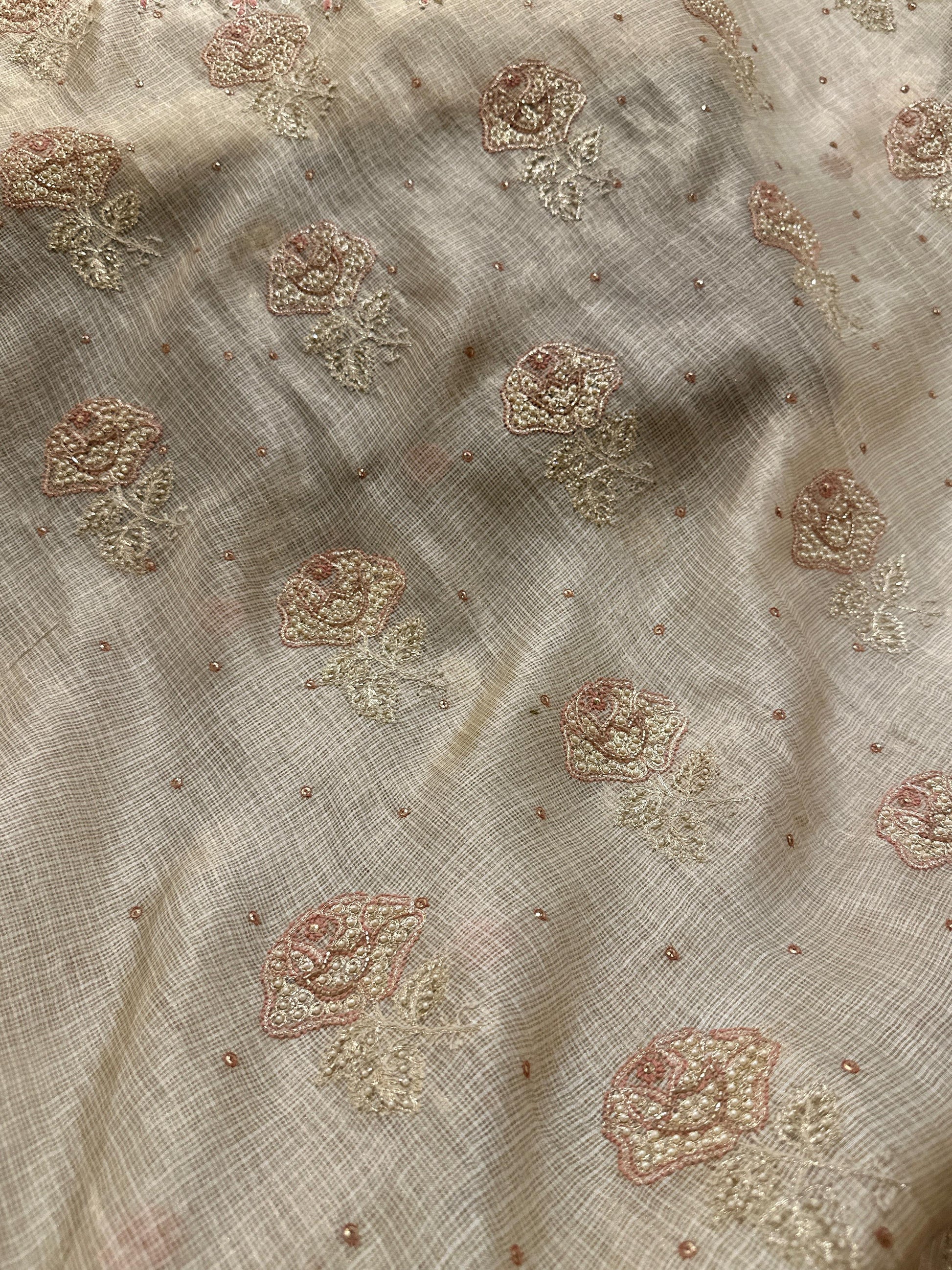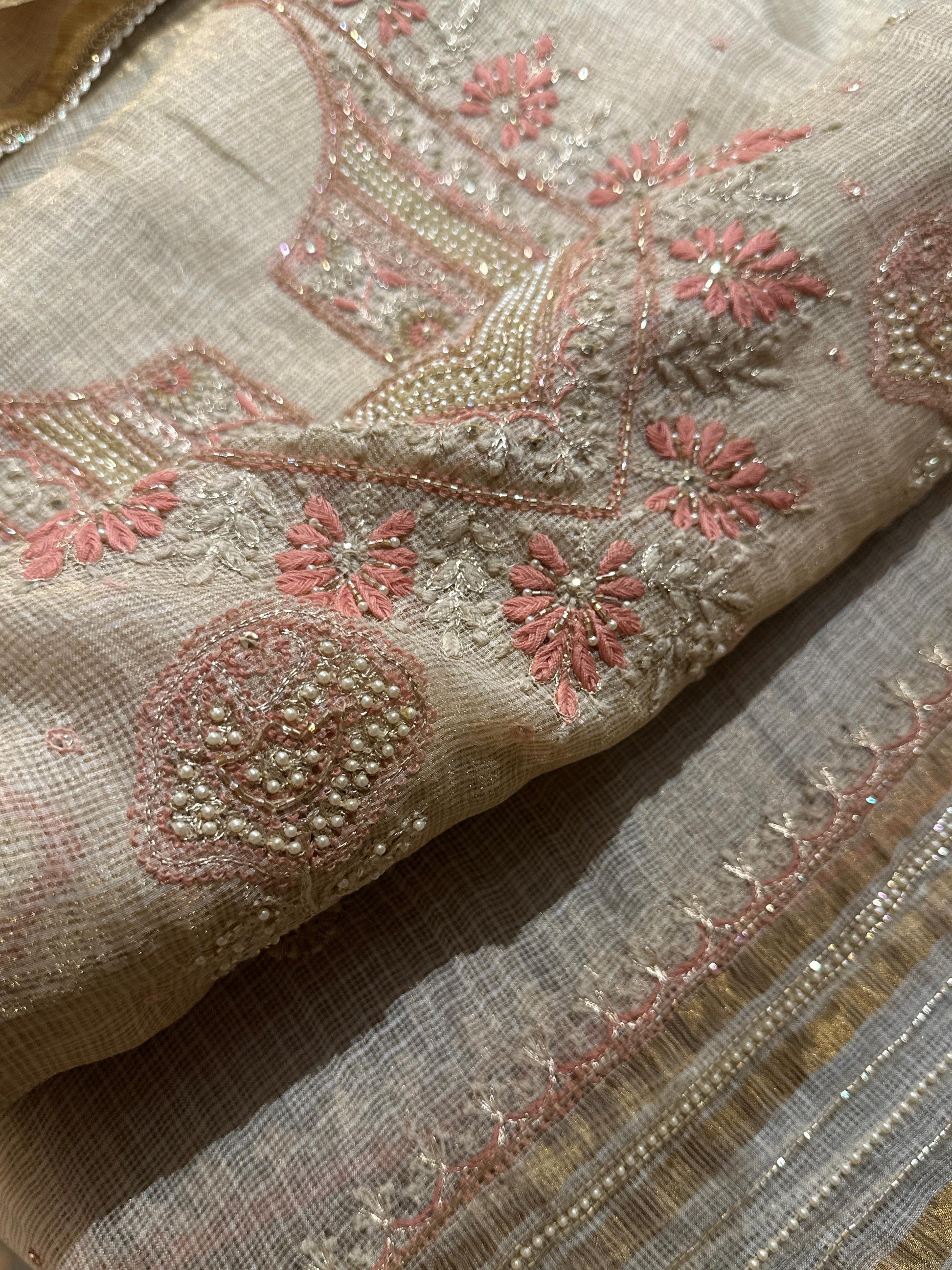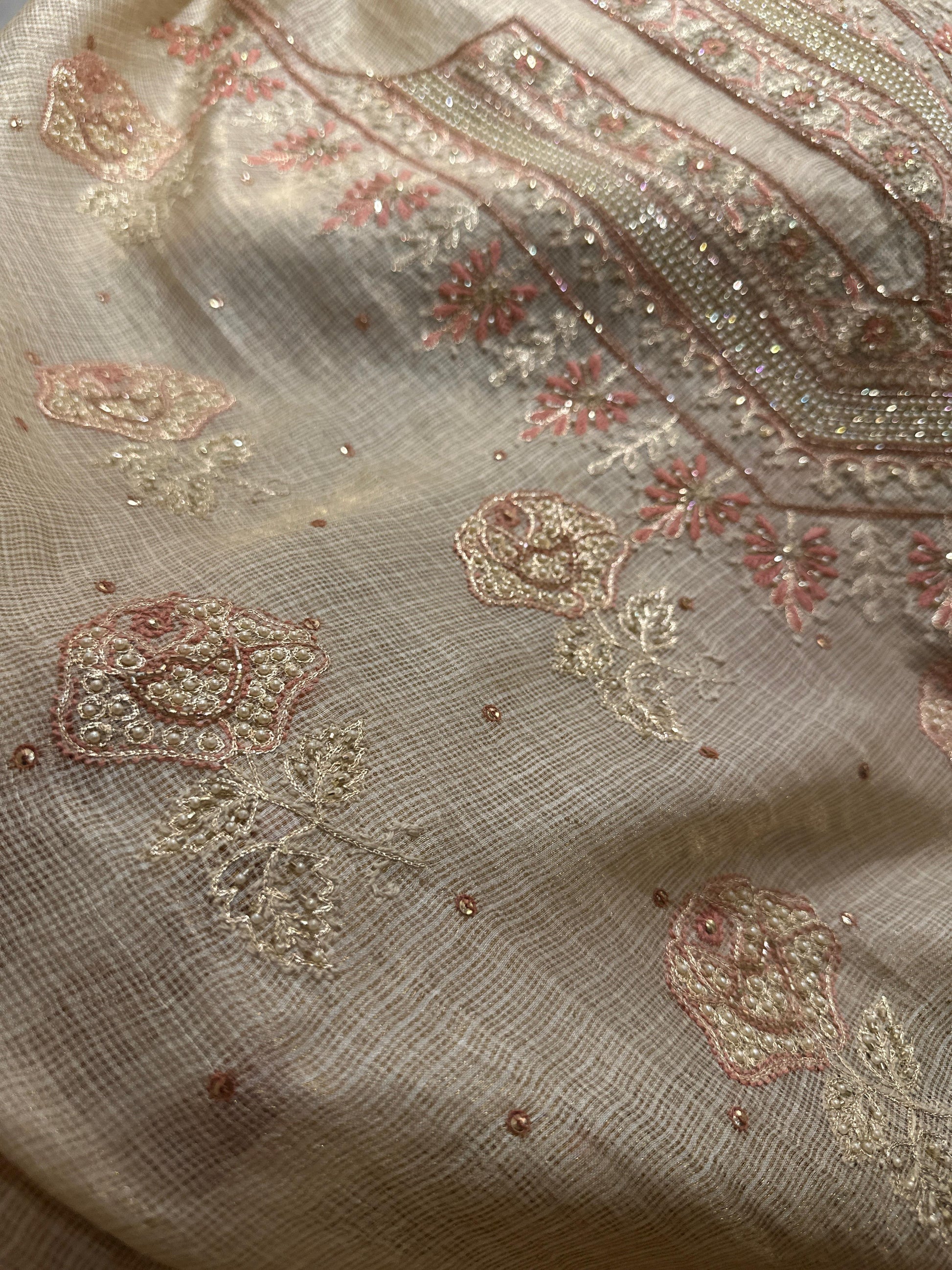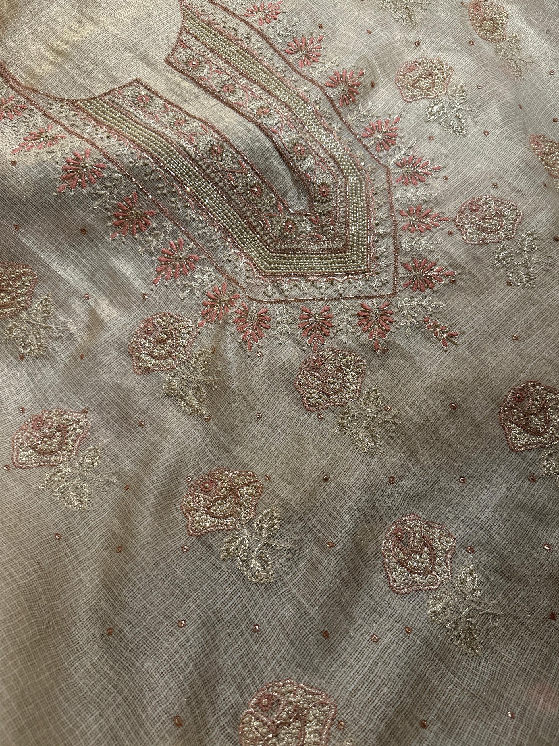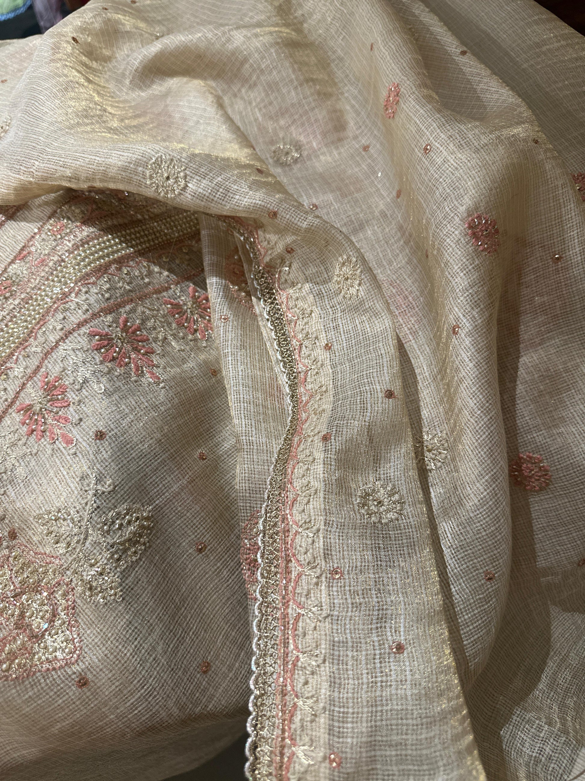 Beige Peach Tissue Kota Chikankari Unstitched Fabric