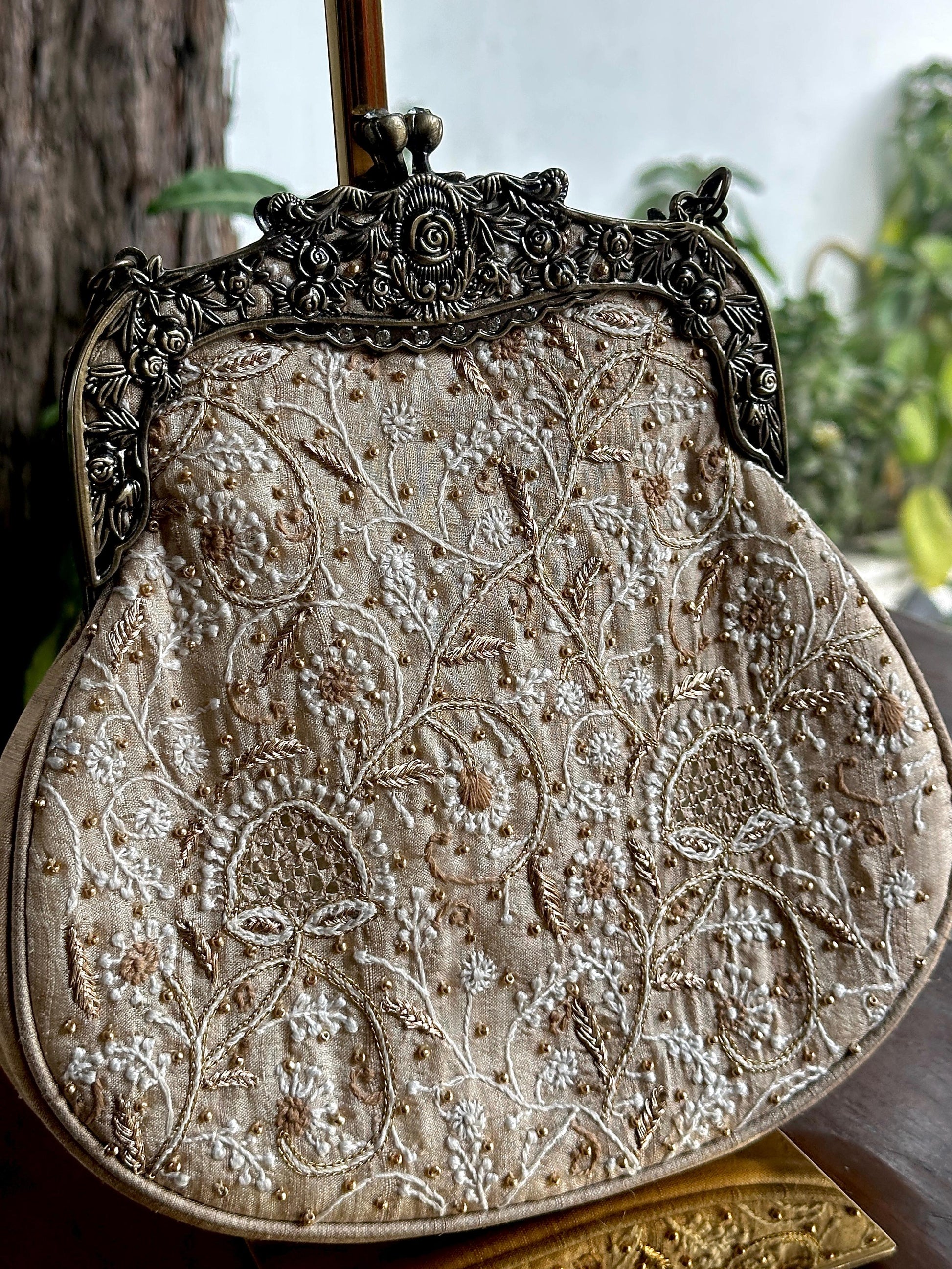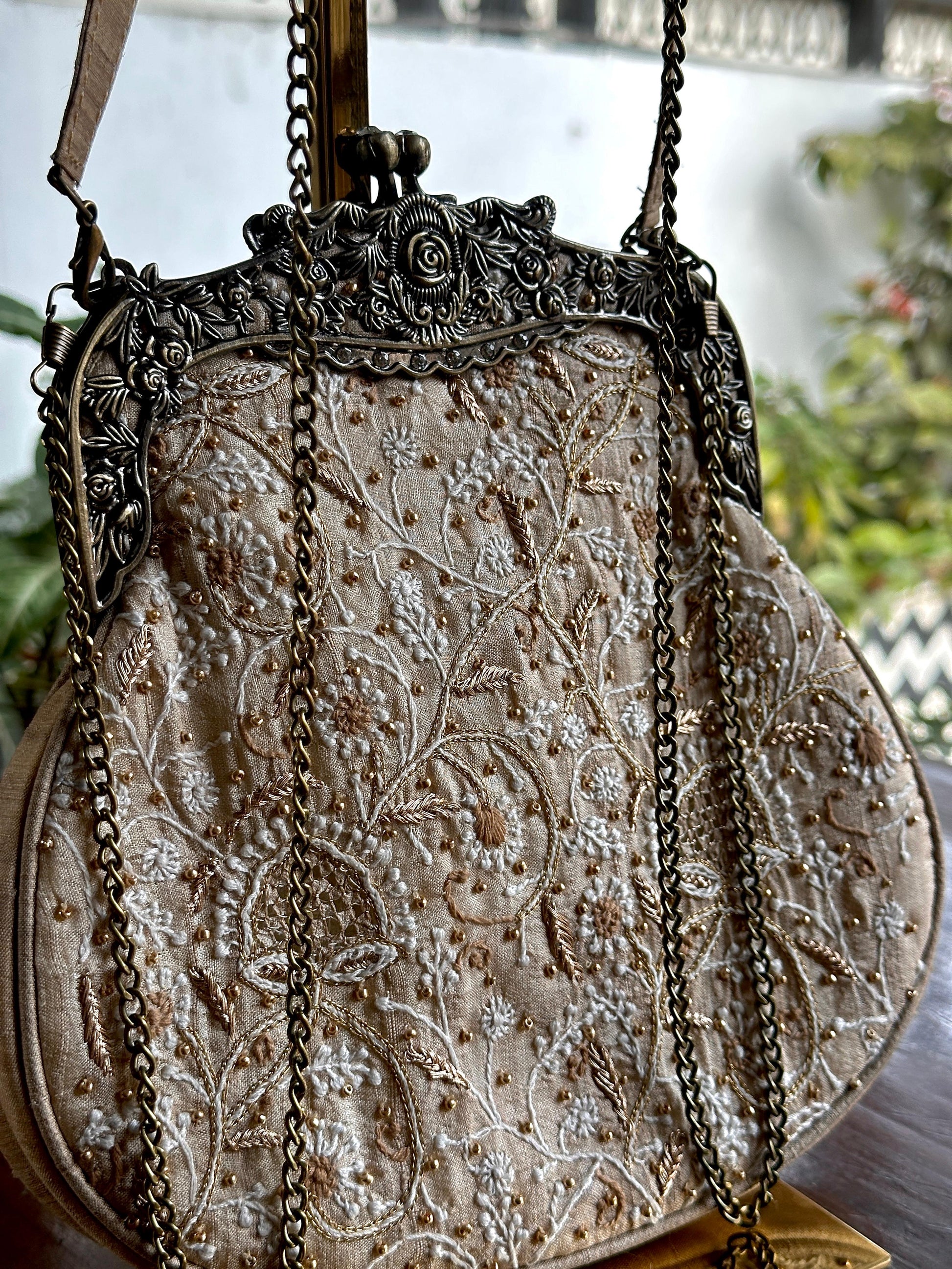 Ari and mukaish work done on the classic vintage sling bag for the everlasting look. Comes with A satin silk beace handle and metal chain.