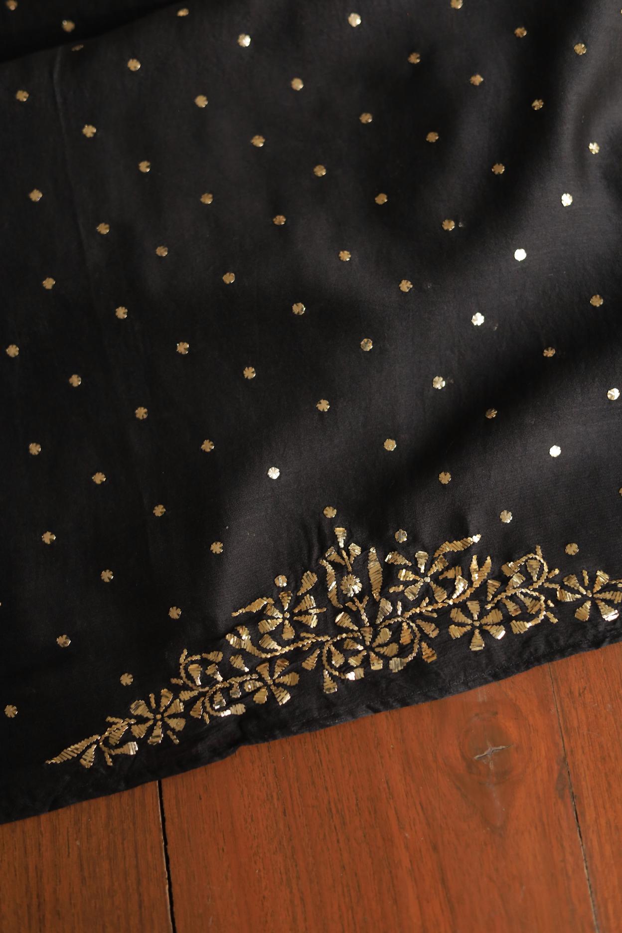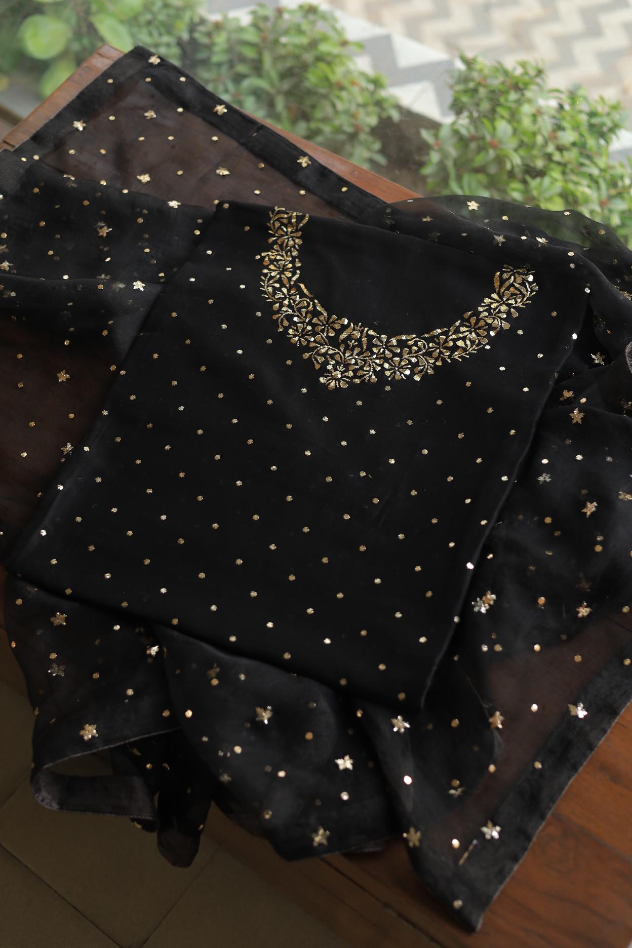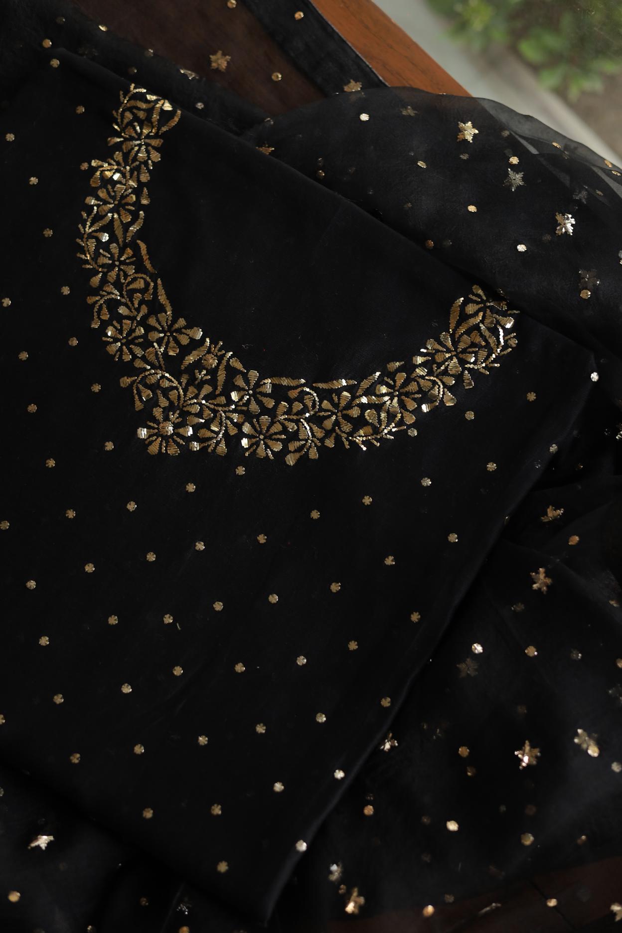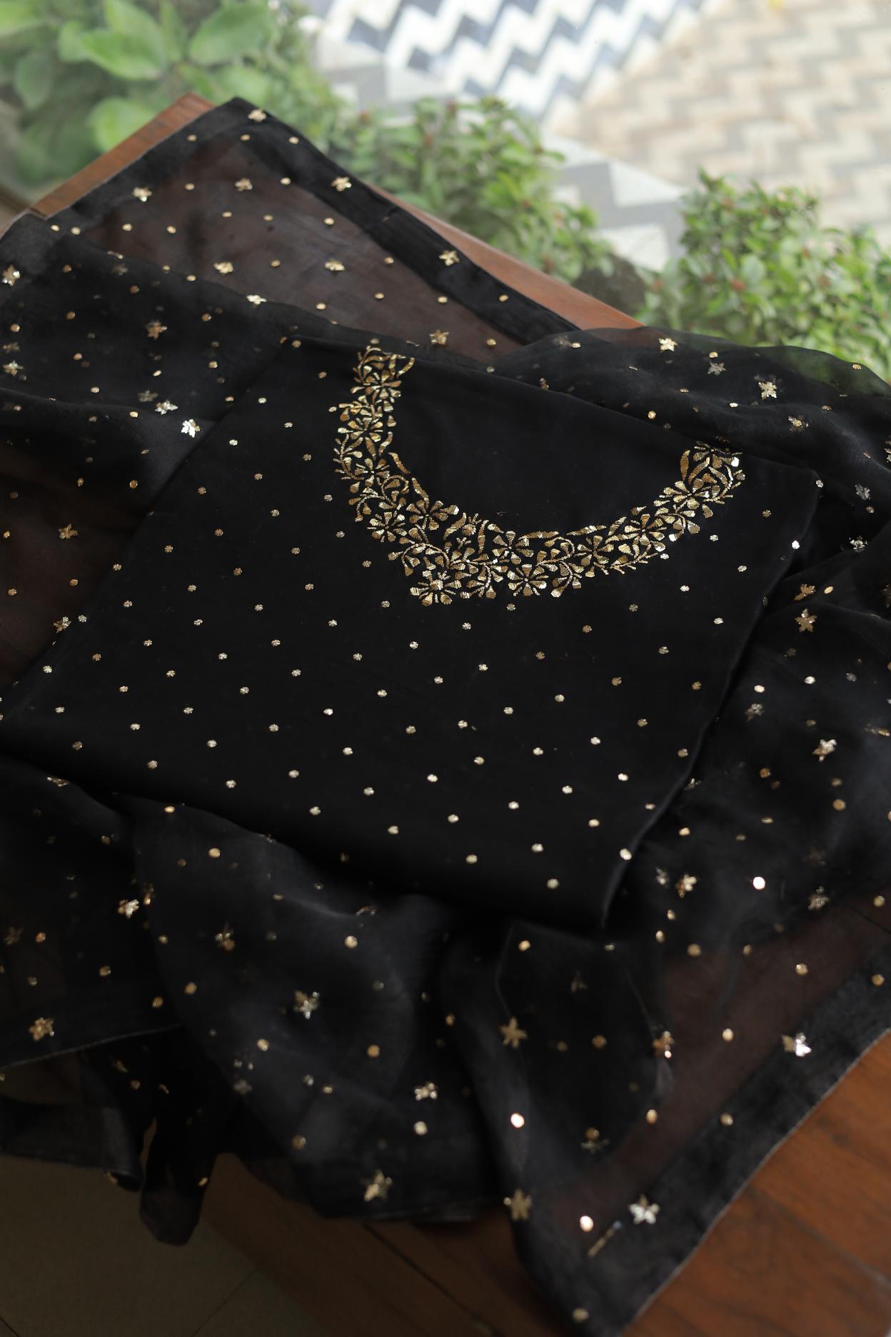 Our signature Pitta Mukaish work on this black shade with heavy Mukaish badla work on yoke on kurta fabric, comes with matching silk chanderi dupatta of ring Mukaish.