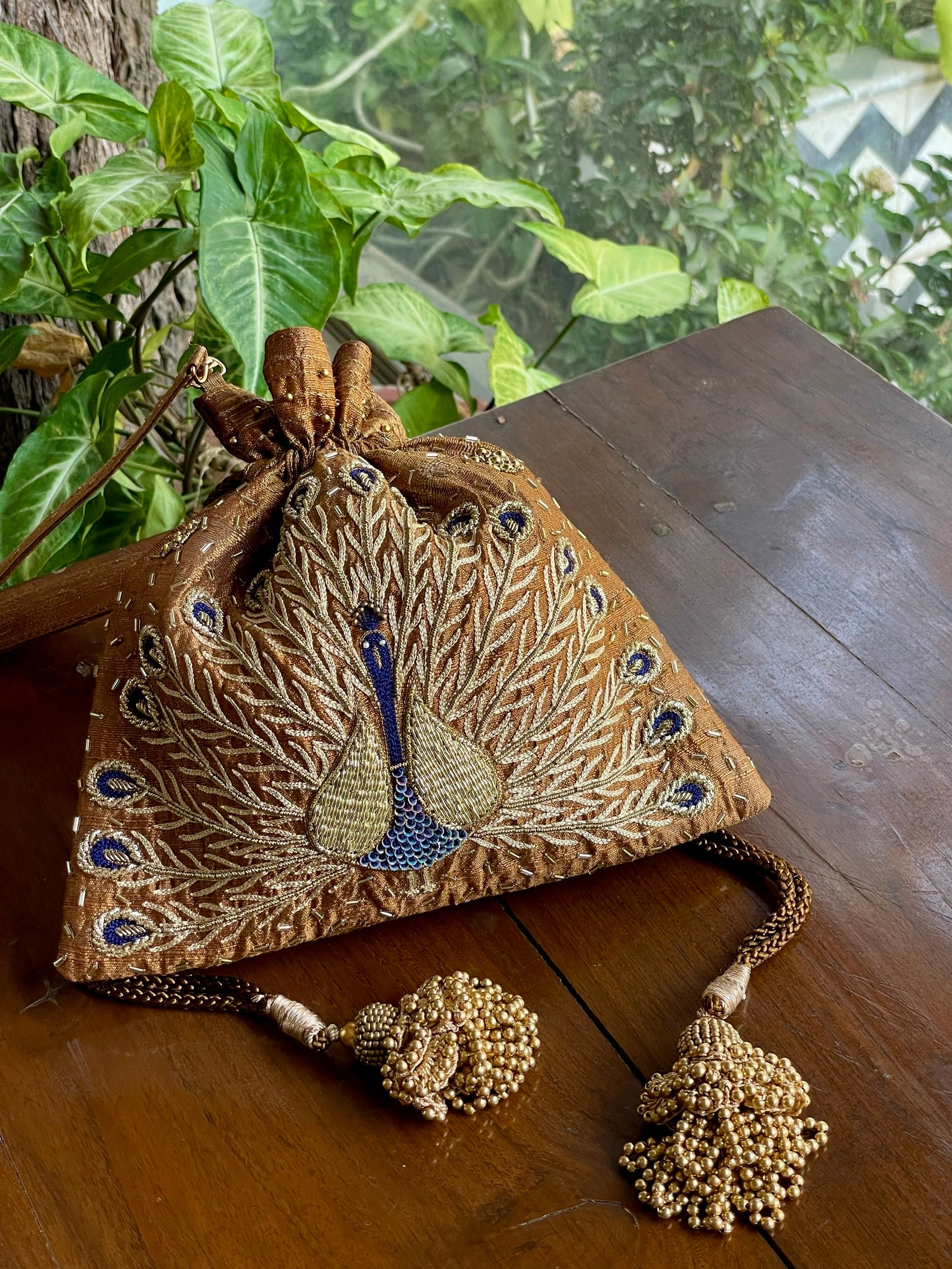 Gold & Blue Peacock Motif Raw Silk Zardosi Polti Bags