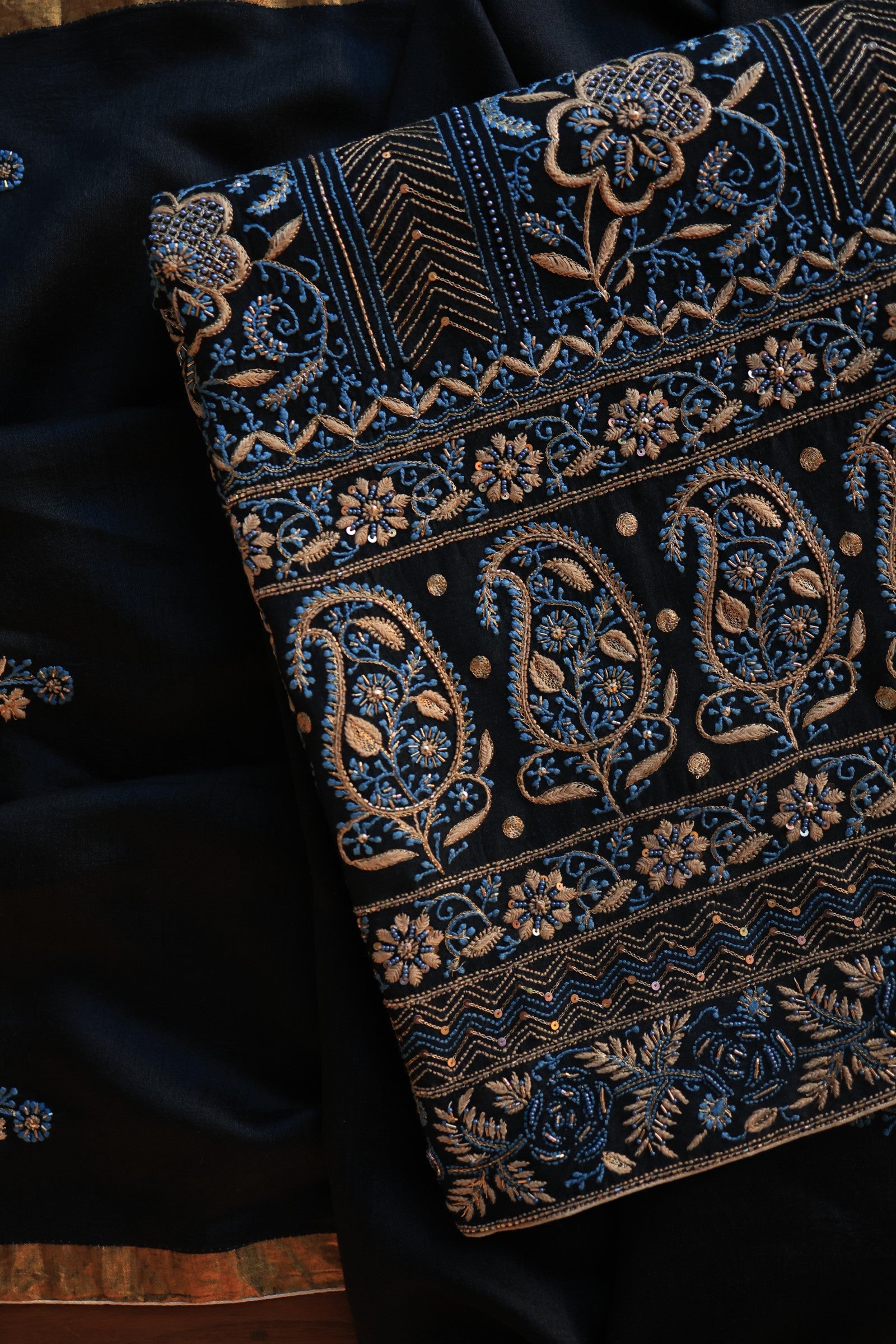 Black Moonga Silk Chikankari Unstitched Fabrics