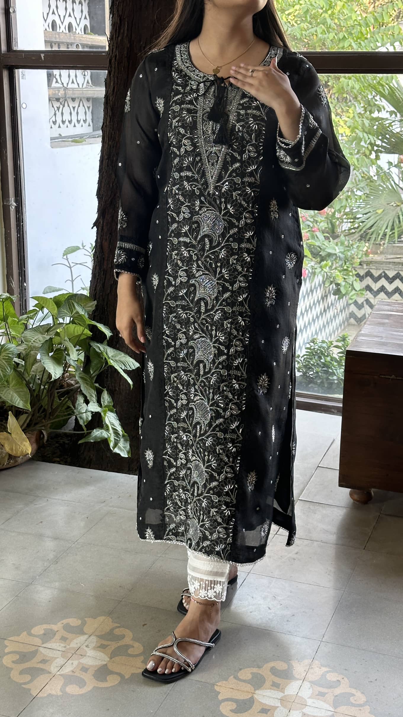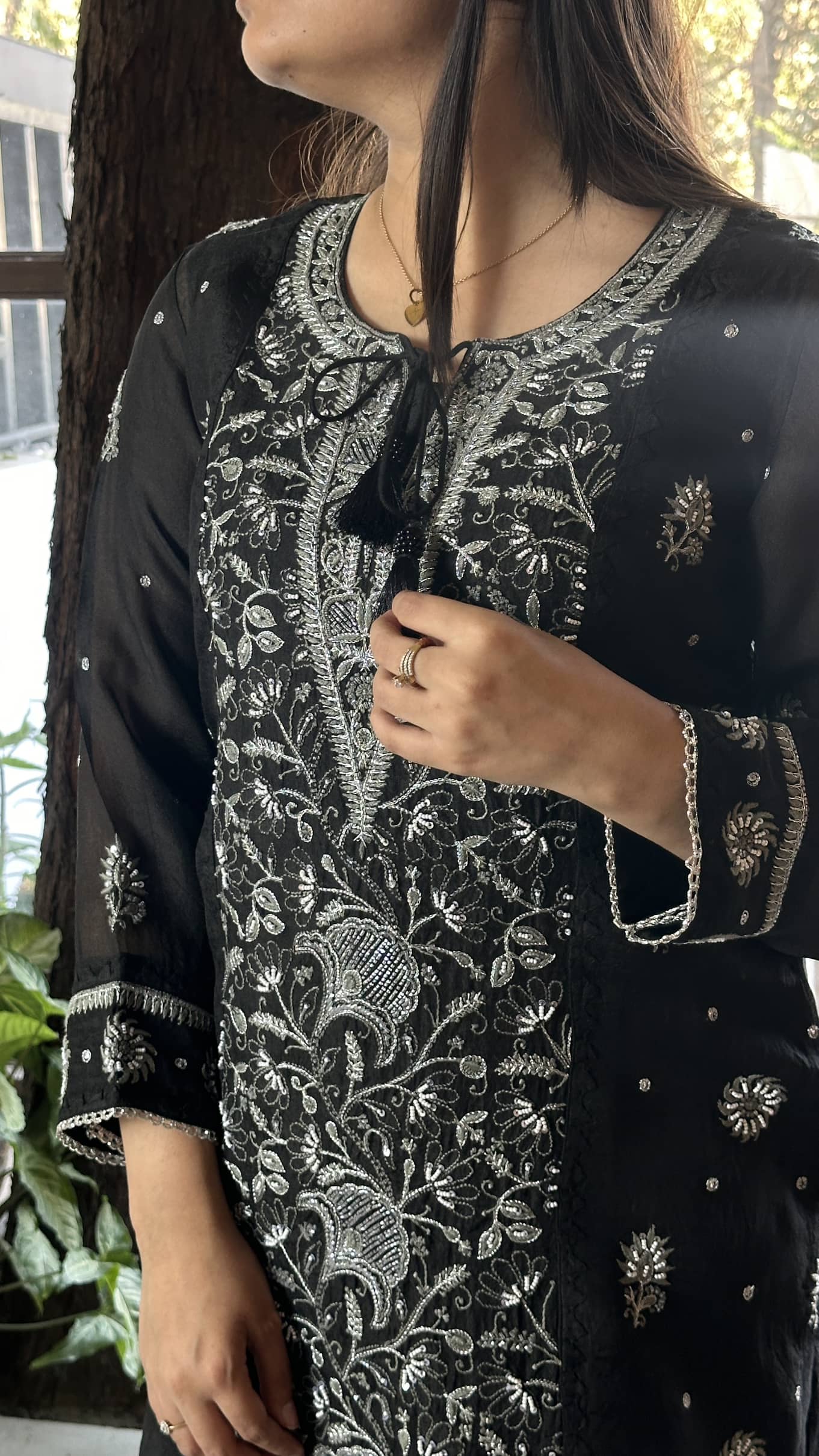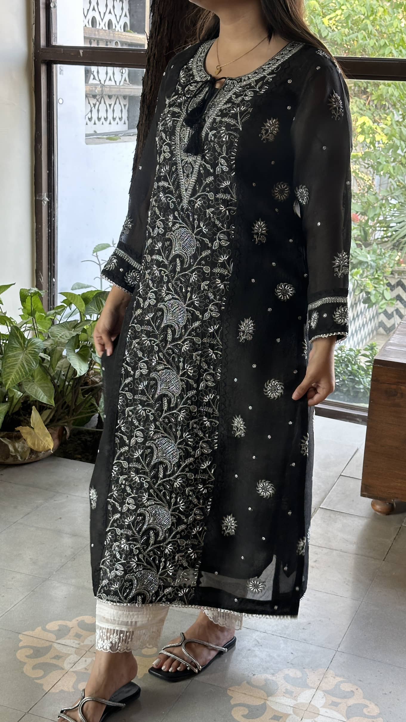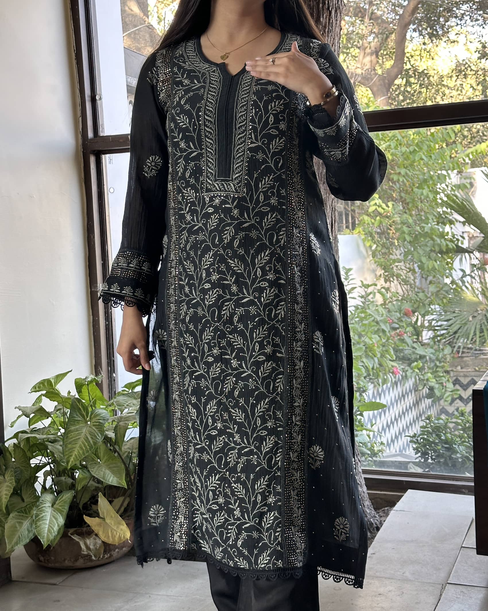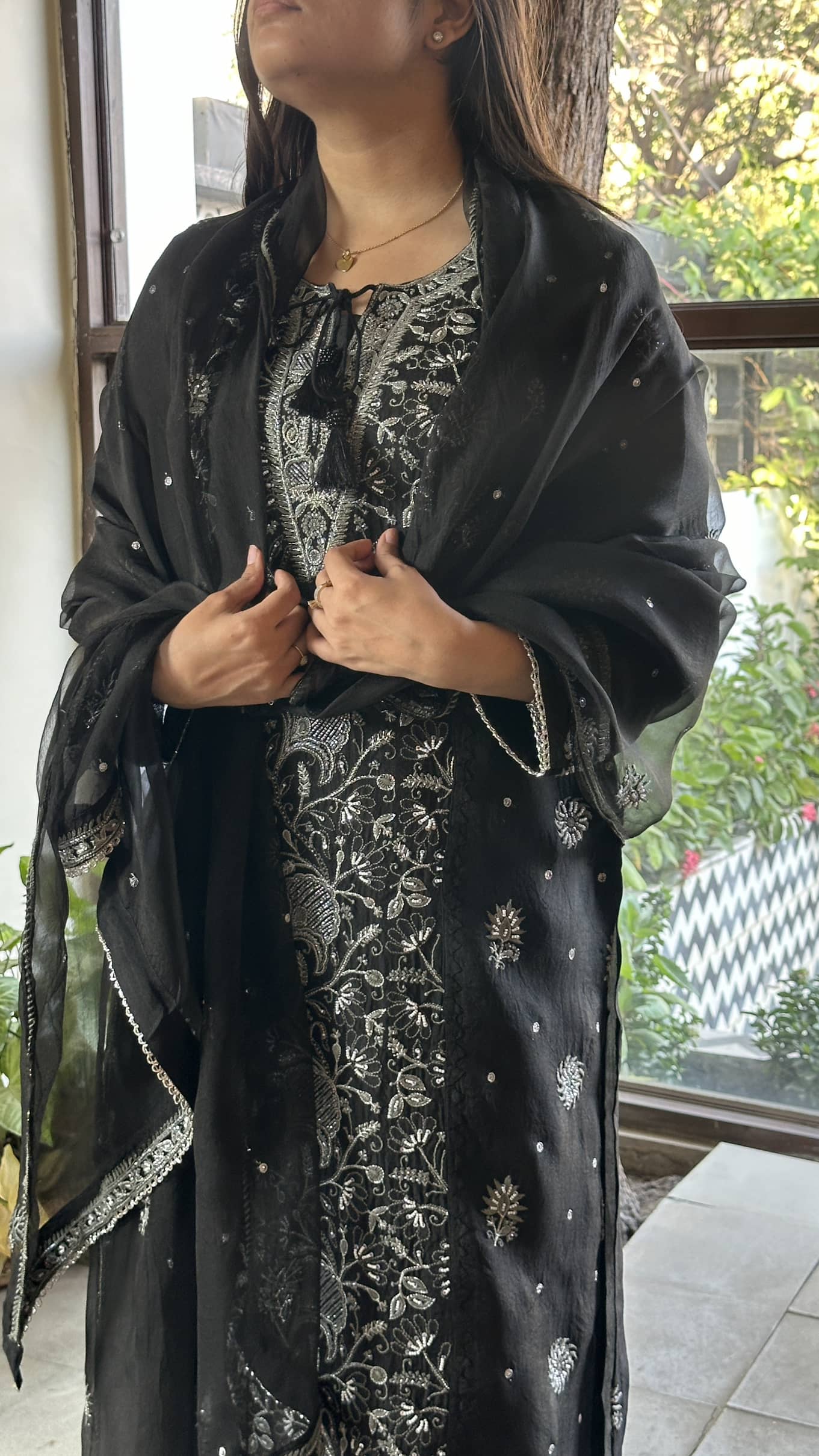 Black Noor Organza Silk Chikankari Straight Cut Kurta Dupatta Set