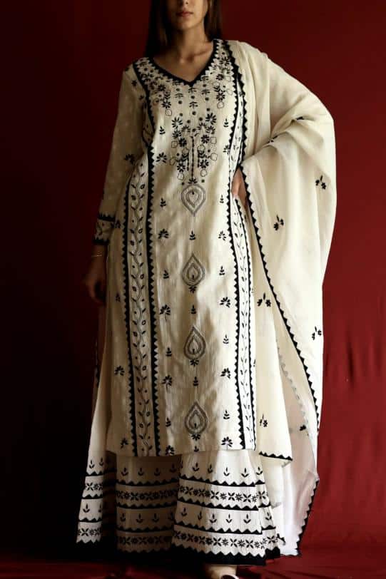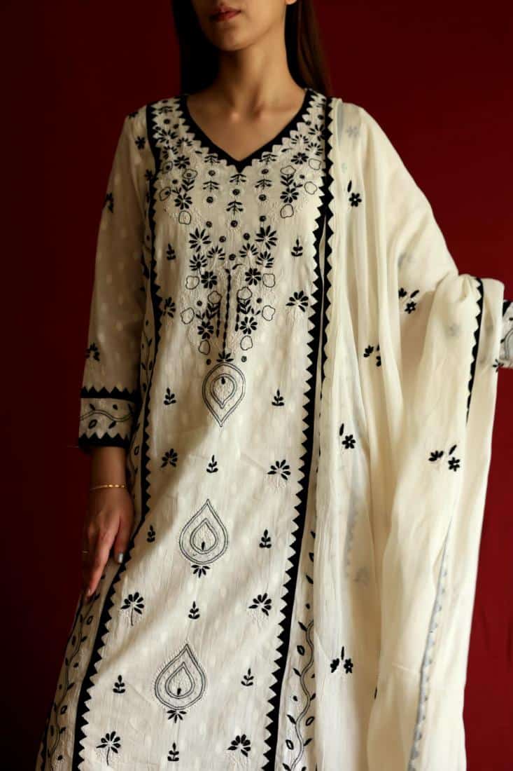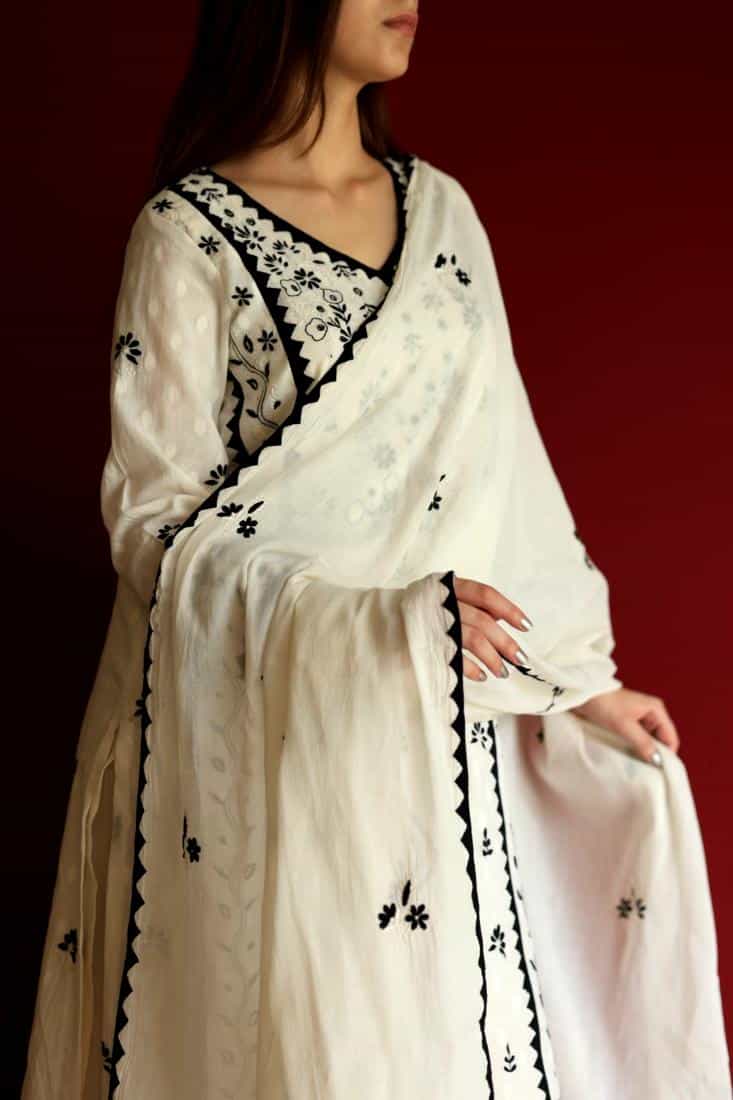 Elegant mul cotton on lucknowi chikankari embroidery done with the combination of white thread embroidery and our applique daraz work.