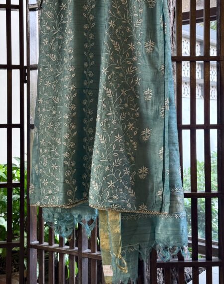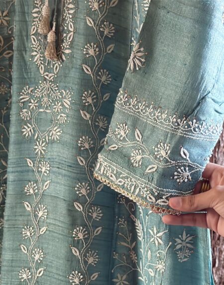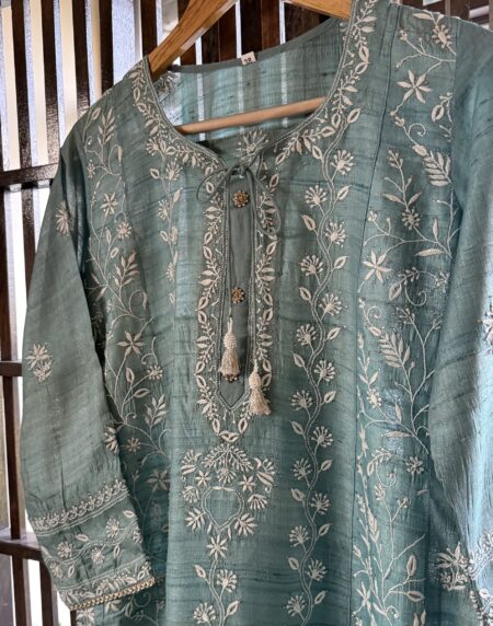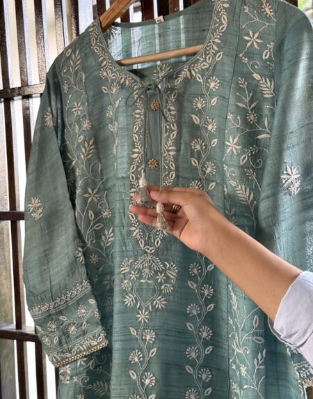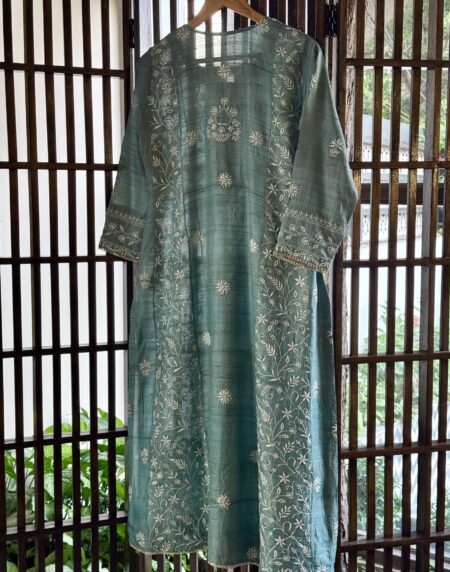 Natural tussar silk fabric in kalidar cut with intricate Chikankari finished with tissue lace finishing for the natural and classic look.