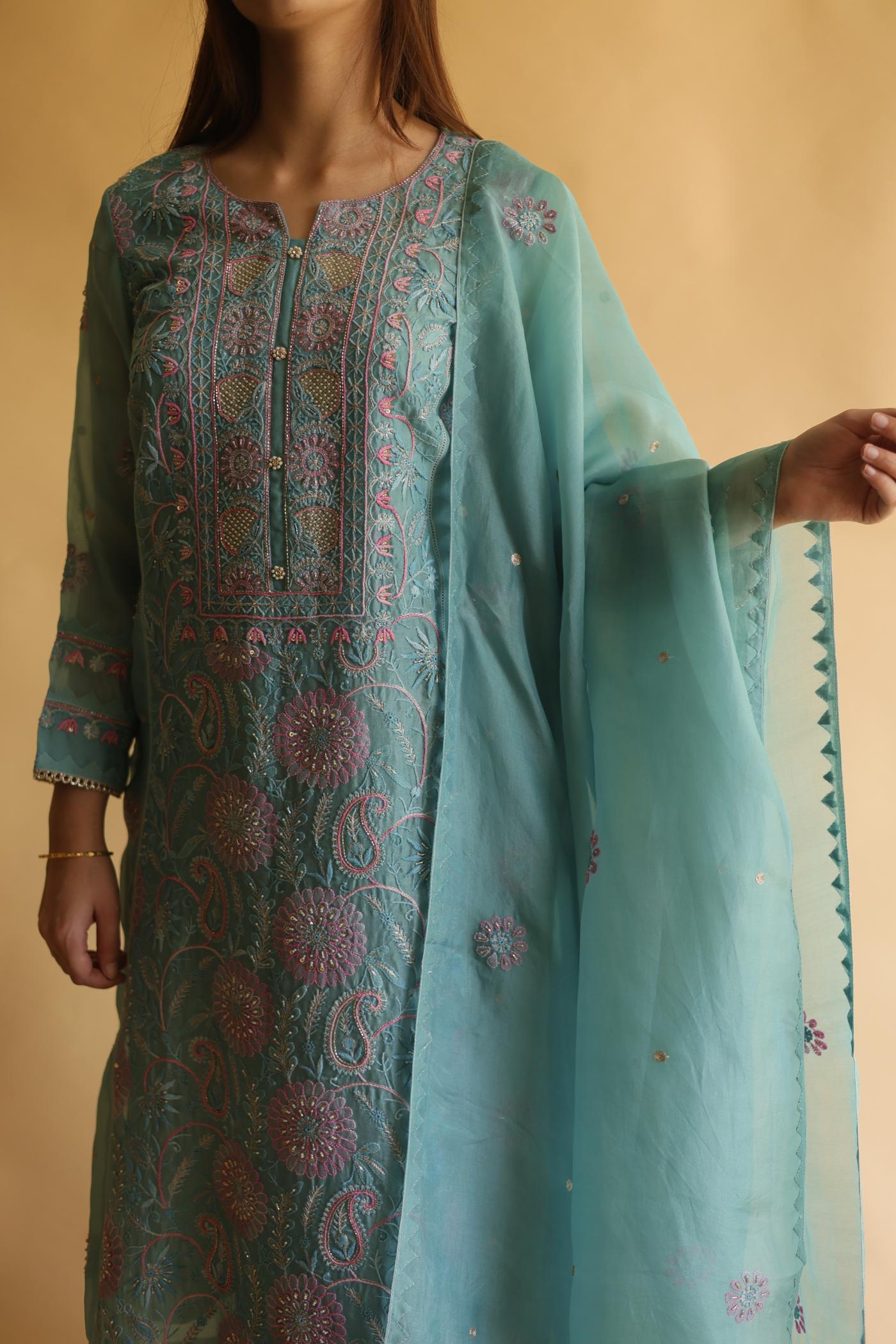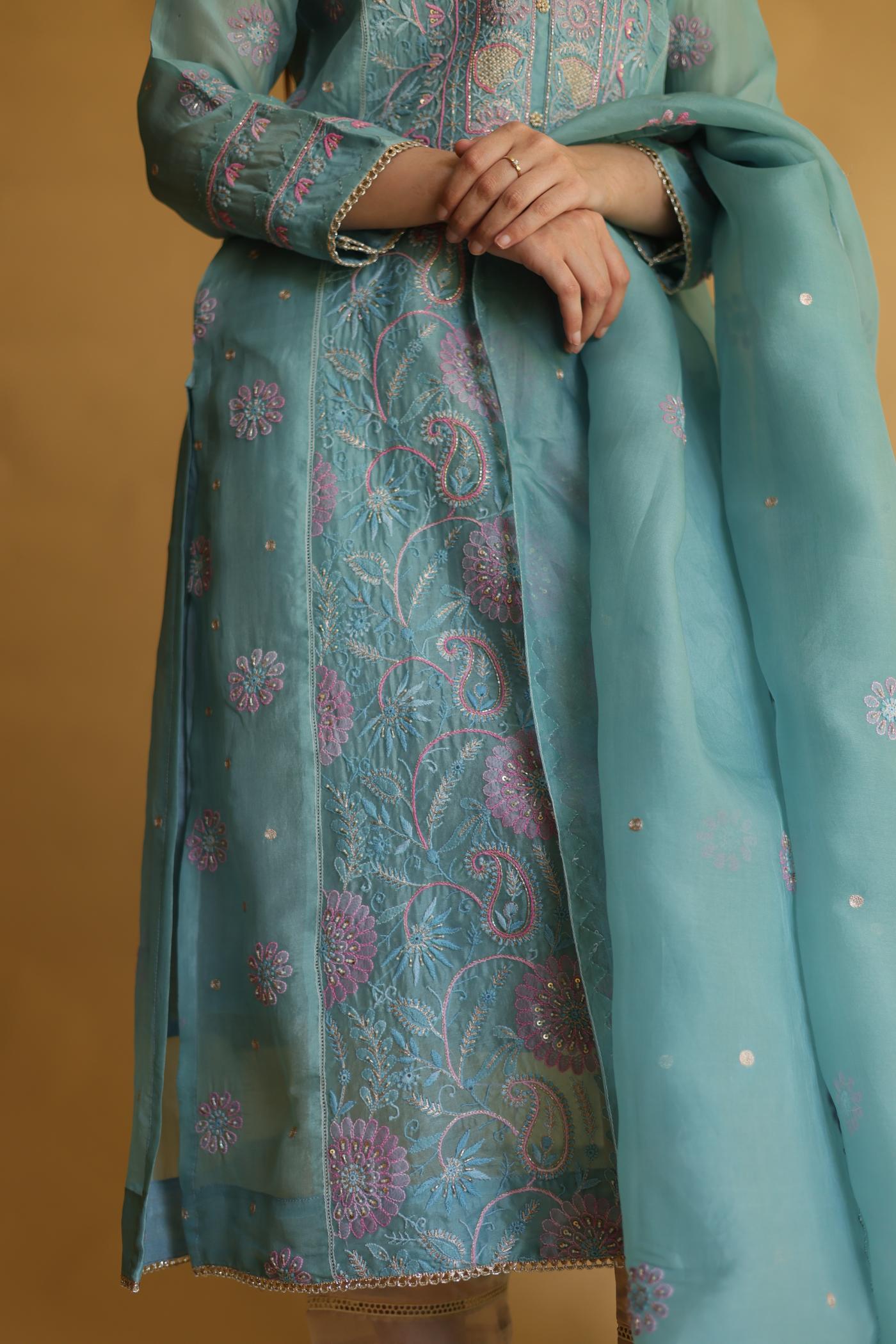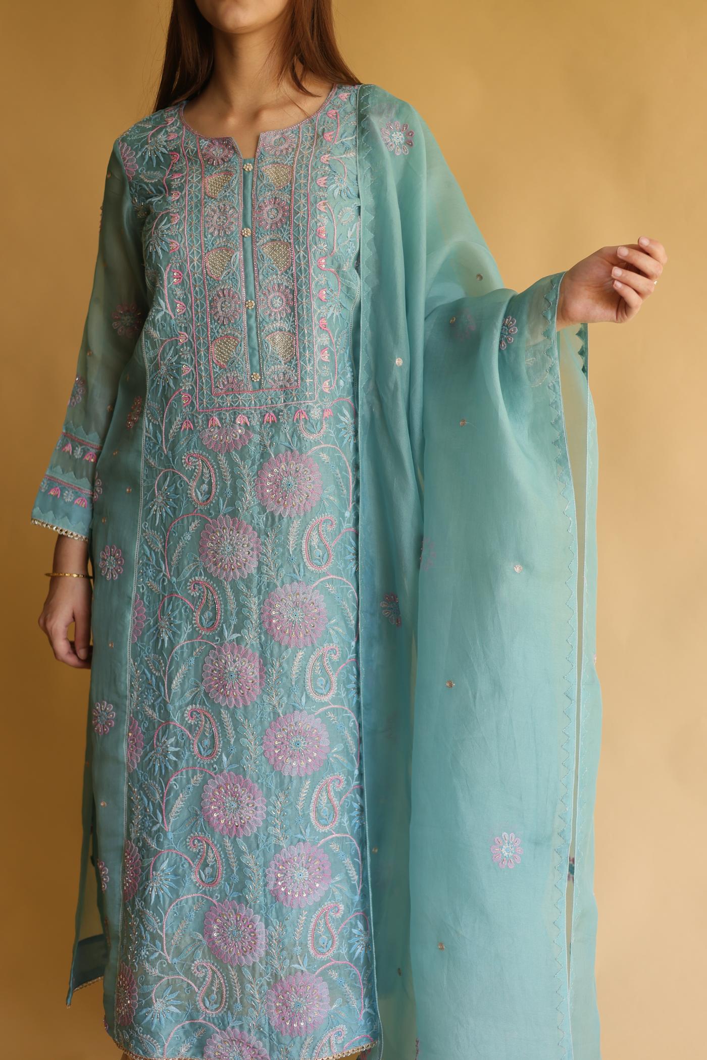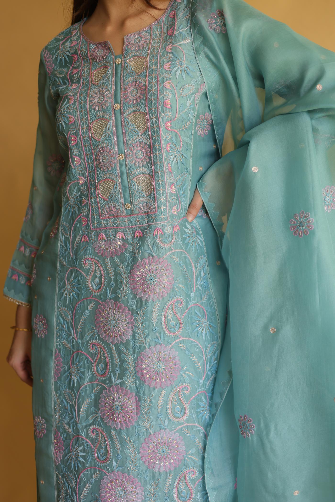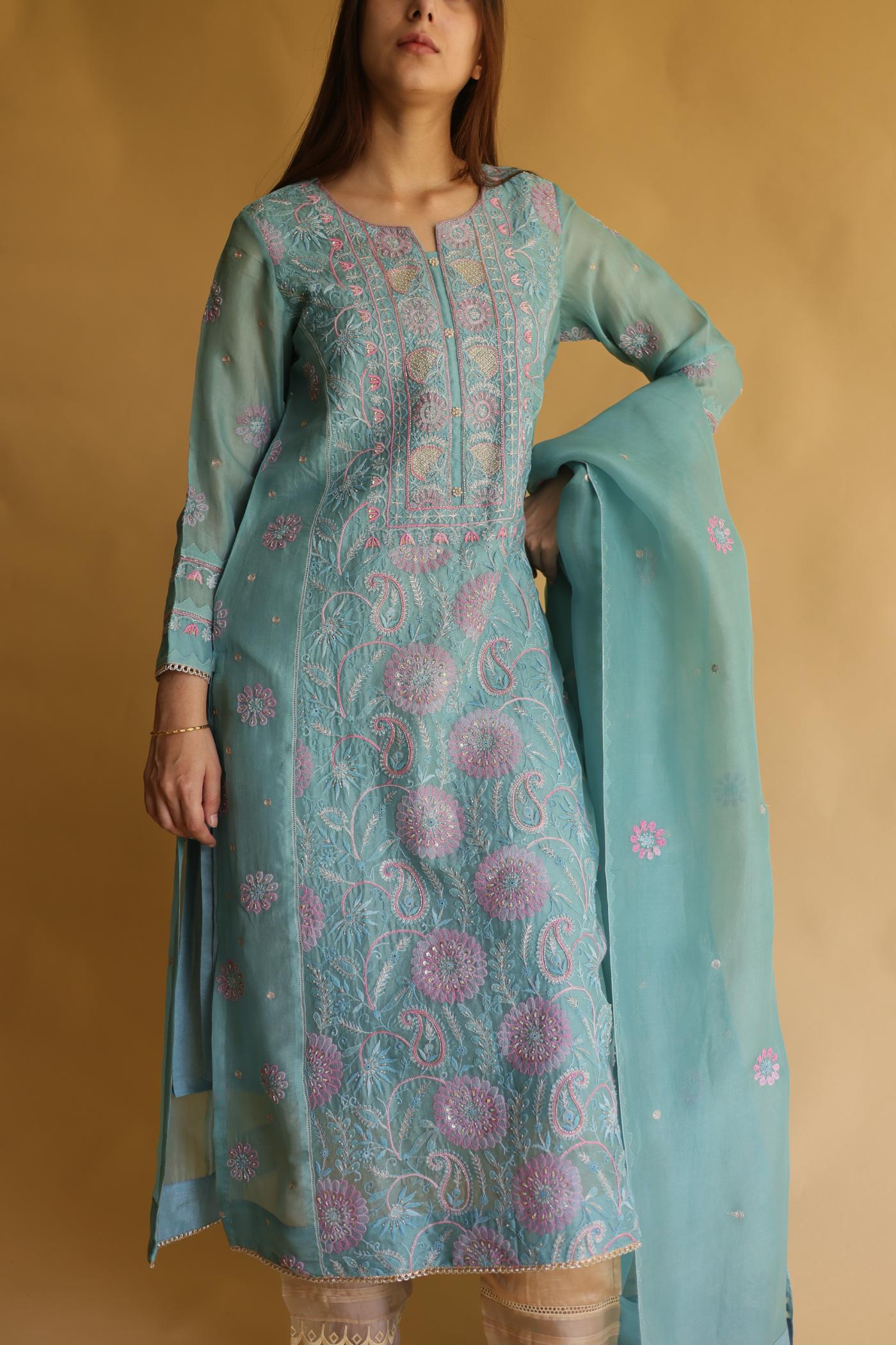 Blue Noor Organza Silk Chikankari Straight Cut Kurta Dupatta Set