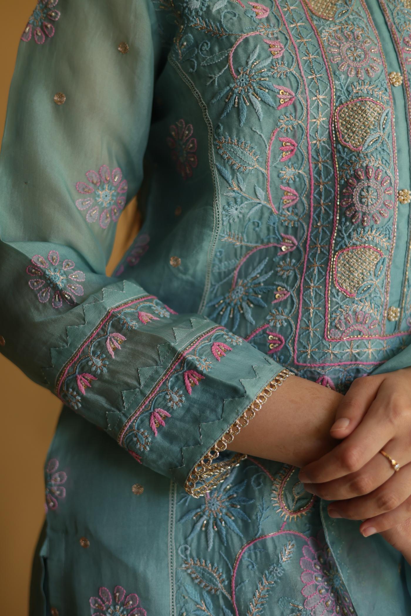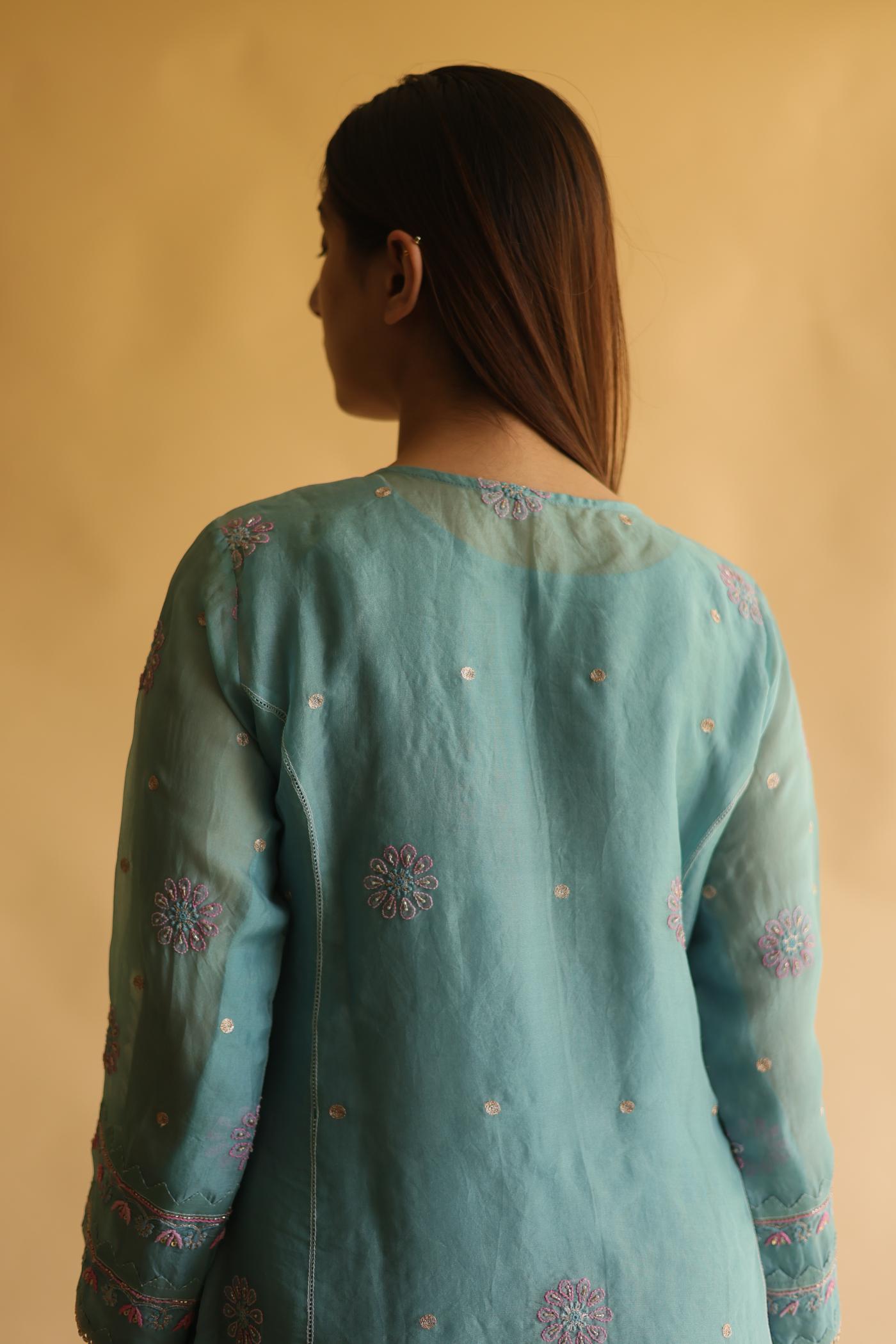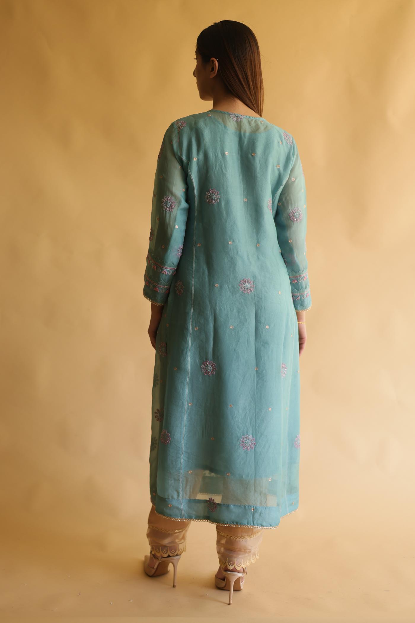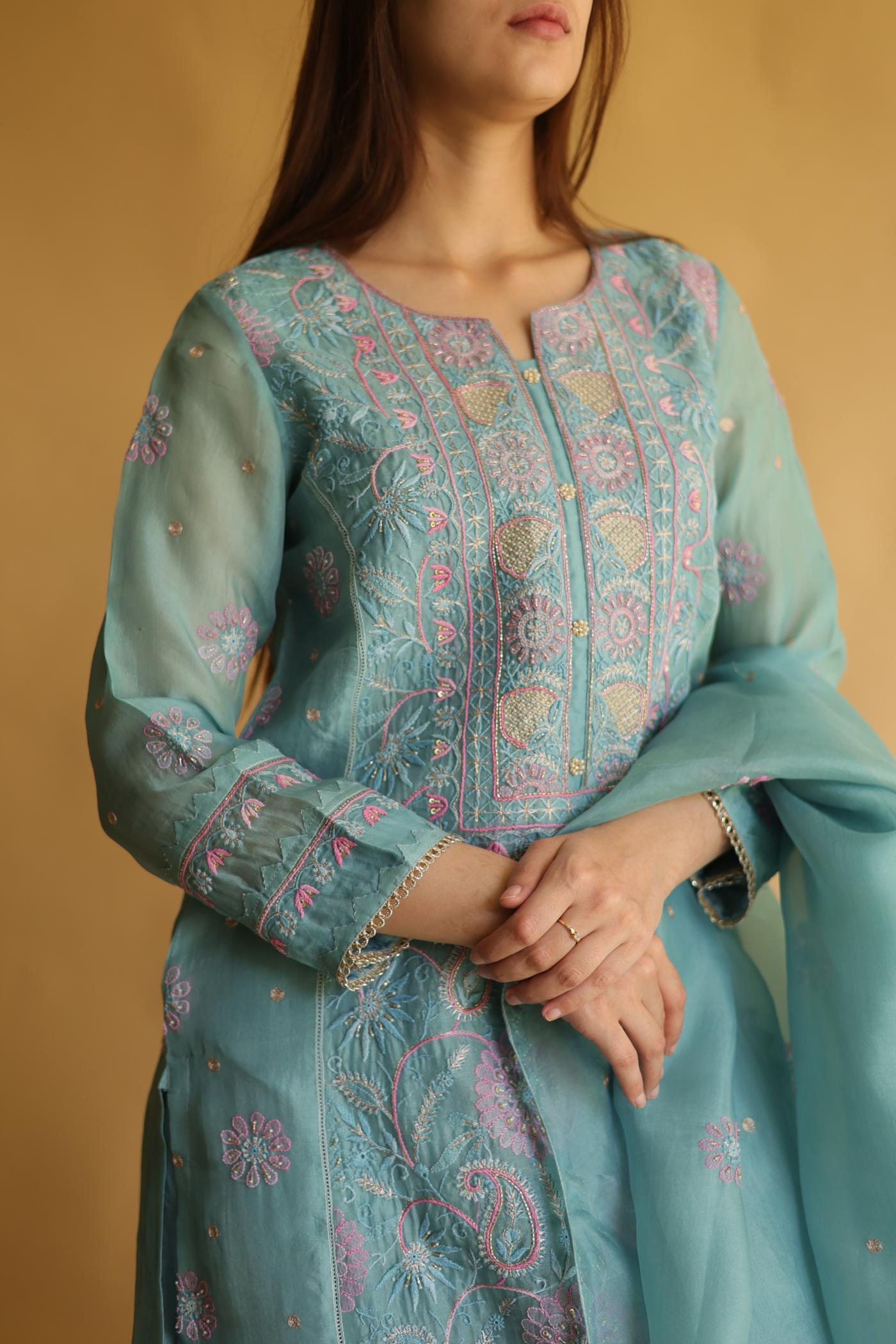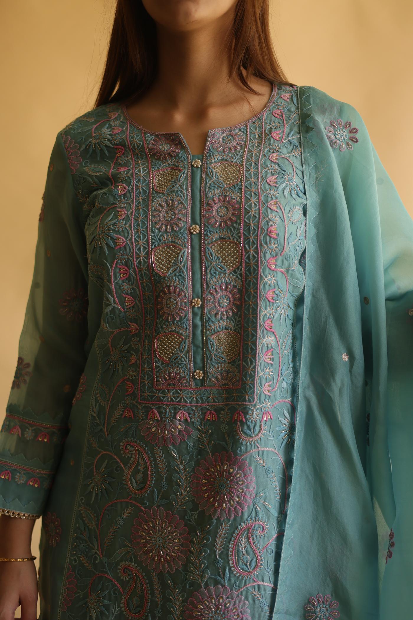 Blue Noor Organza Silk Chikankari Straight Cut Kurta Dupatta Set