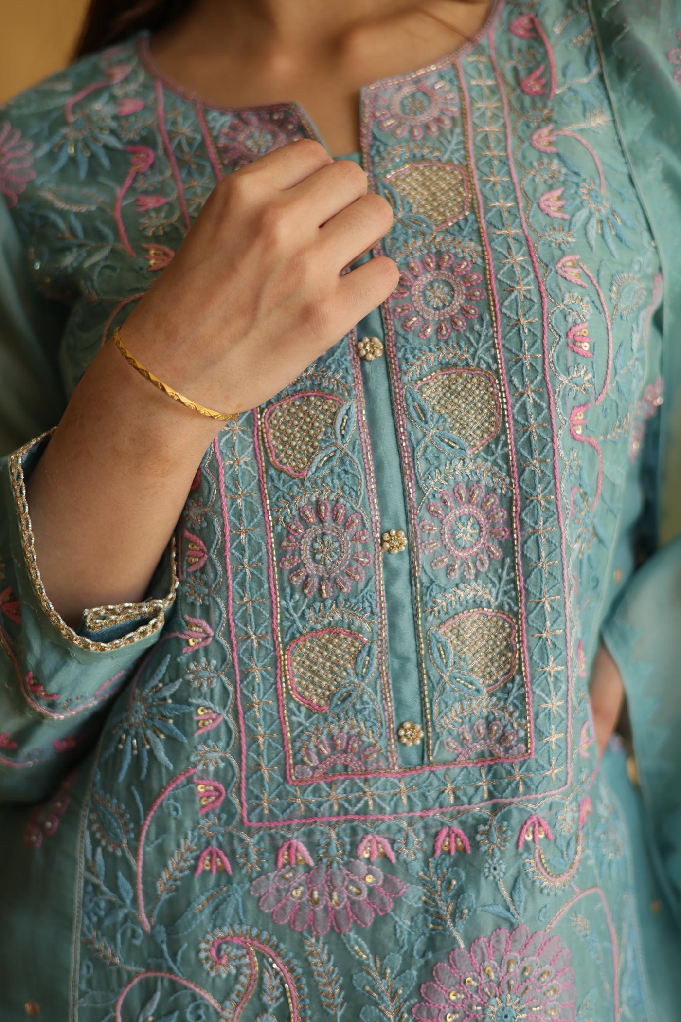 Each piece is crafted with intricate hand-embroidered Chikankari, featuring different traditional embellishments: