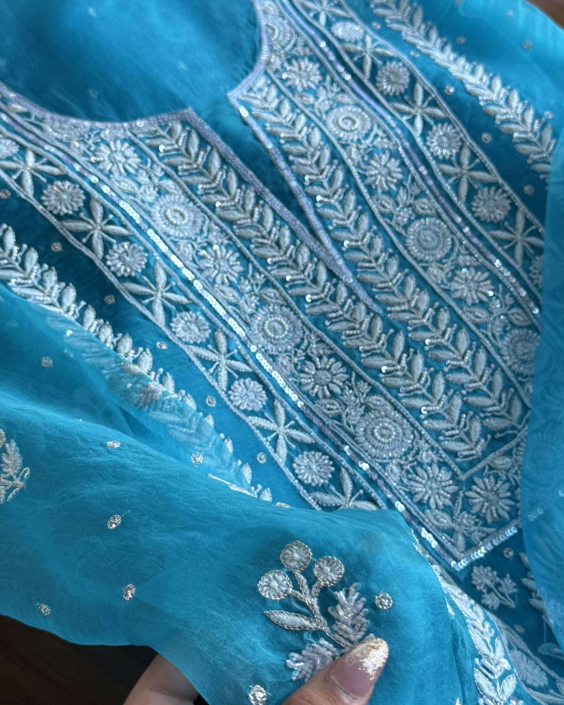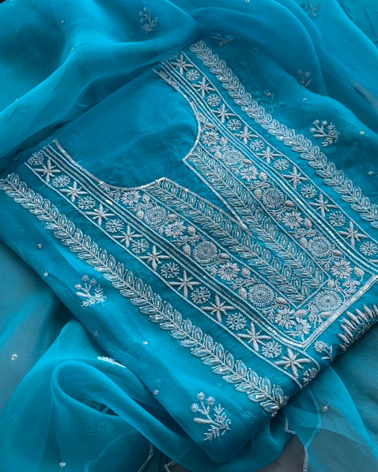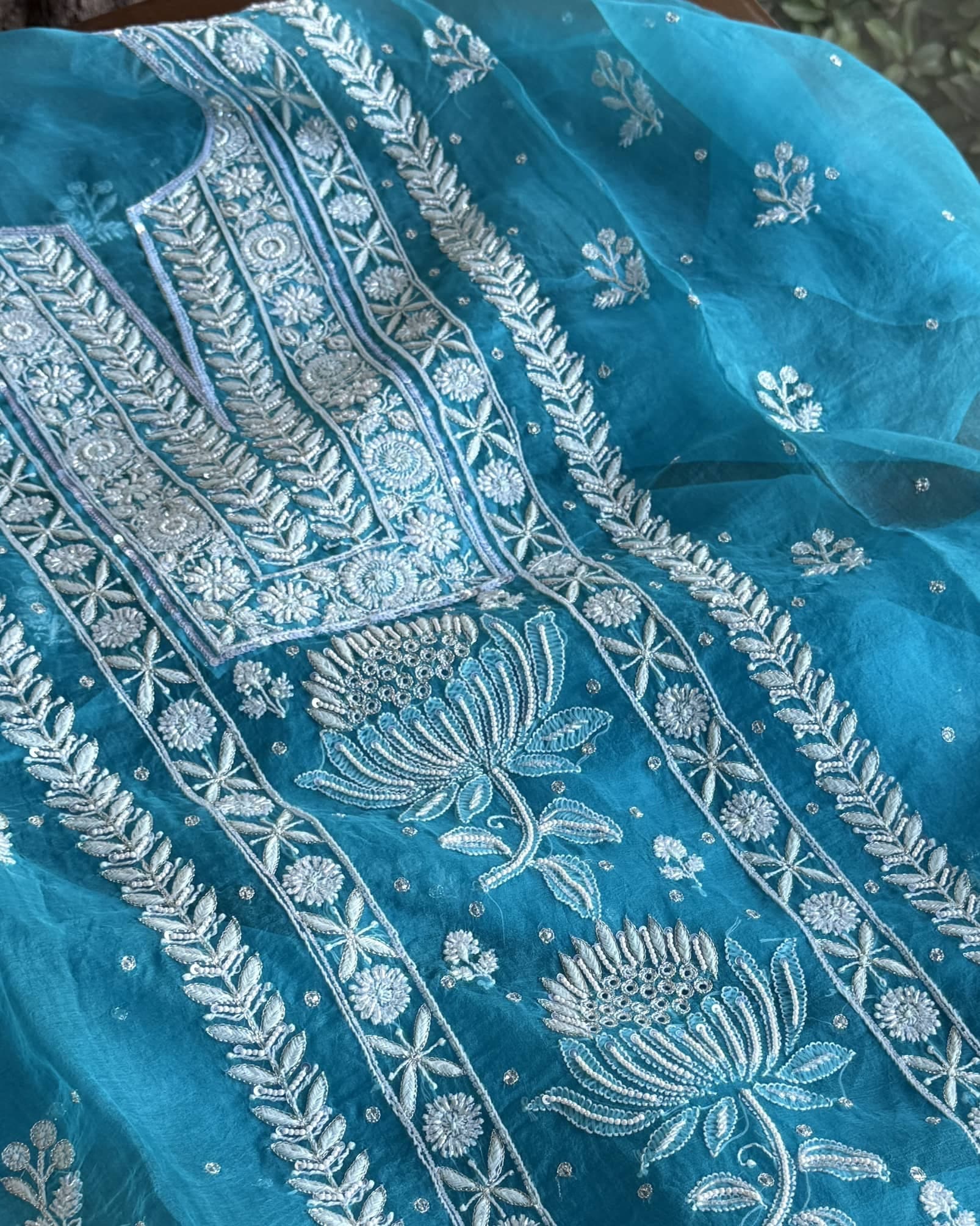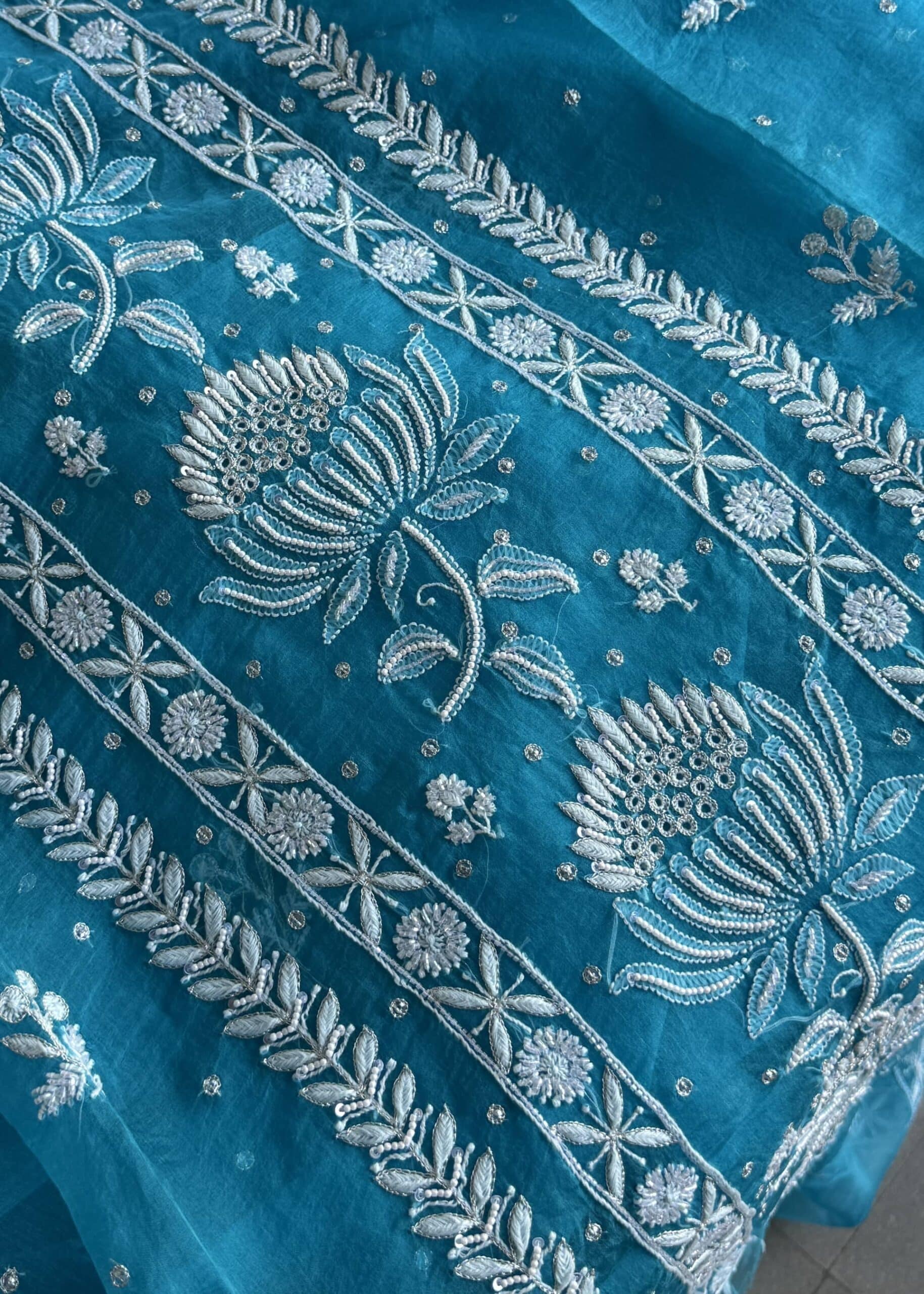 Blue Noor Organza Silk Fine Chikankari Unstitched Fabric