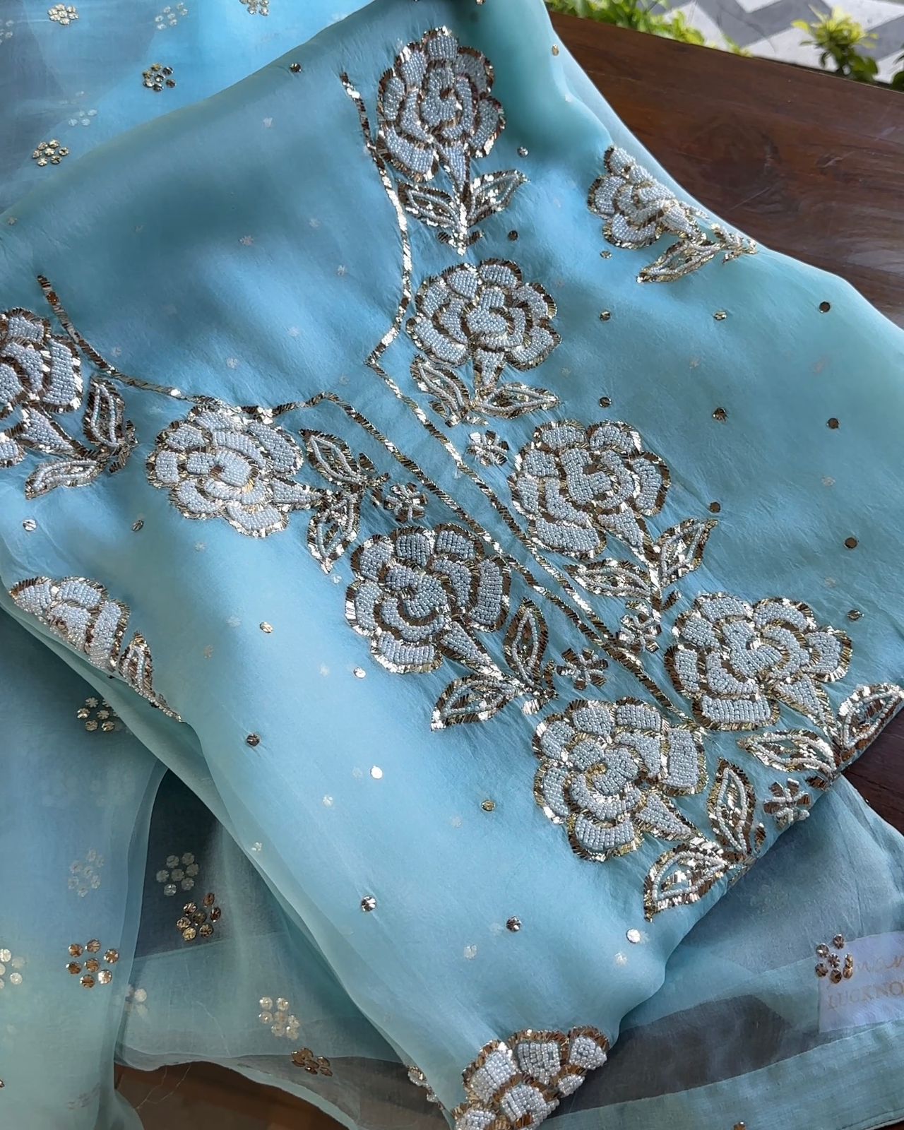 Blue silk organza kurta dupatta set done with full Mukaish badla work on kurta neck yoke with beads work and various bootis on kurta dupatta set.