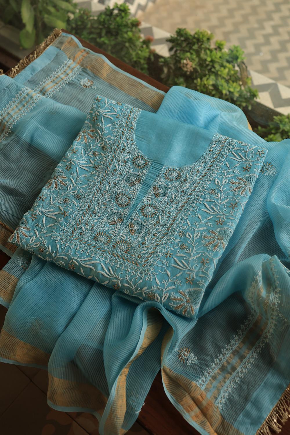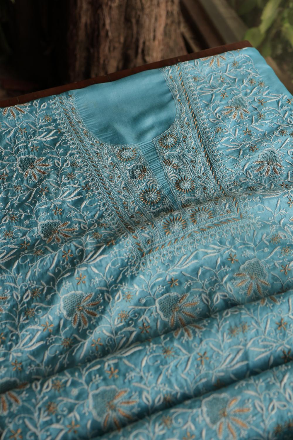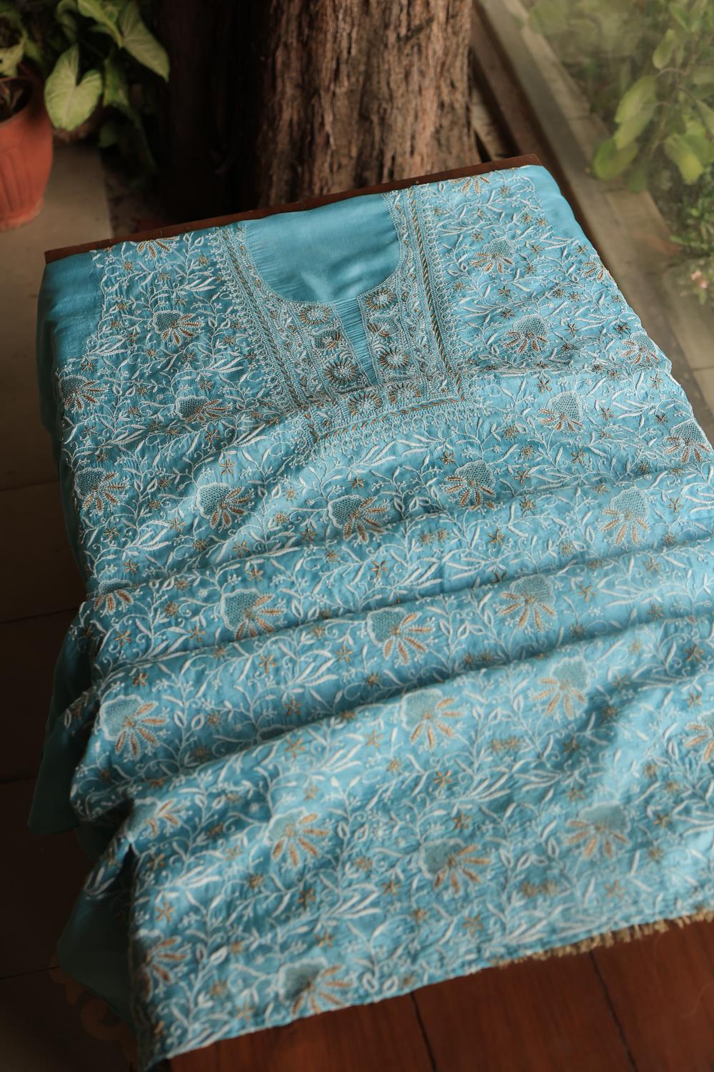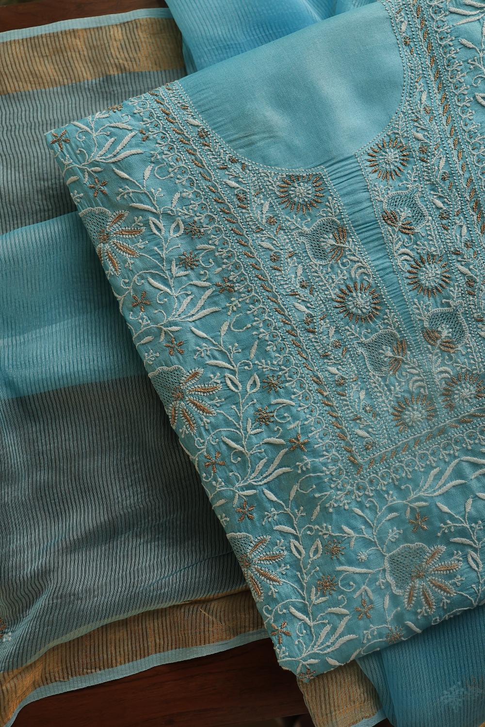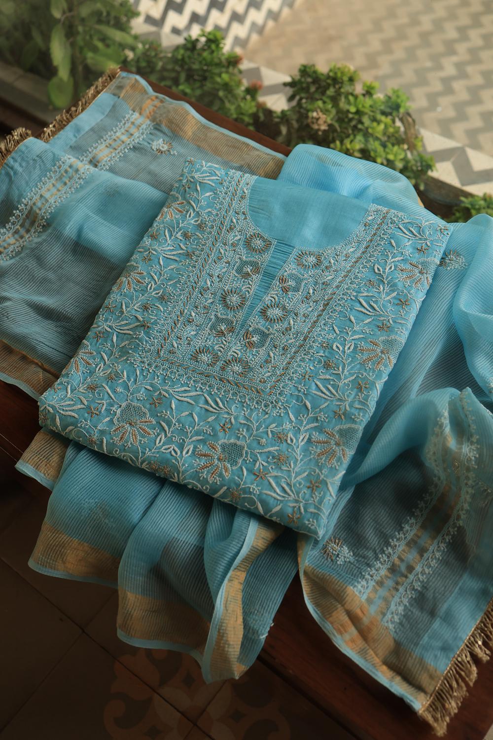 Blue Paper Tussar Resham Chikankari Unstitched Kurta Dupatta Set