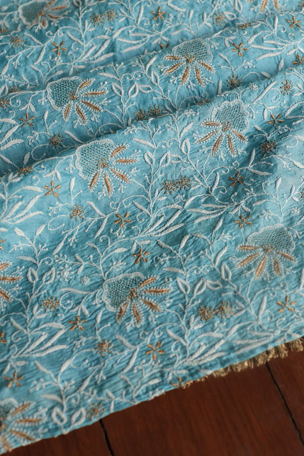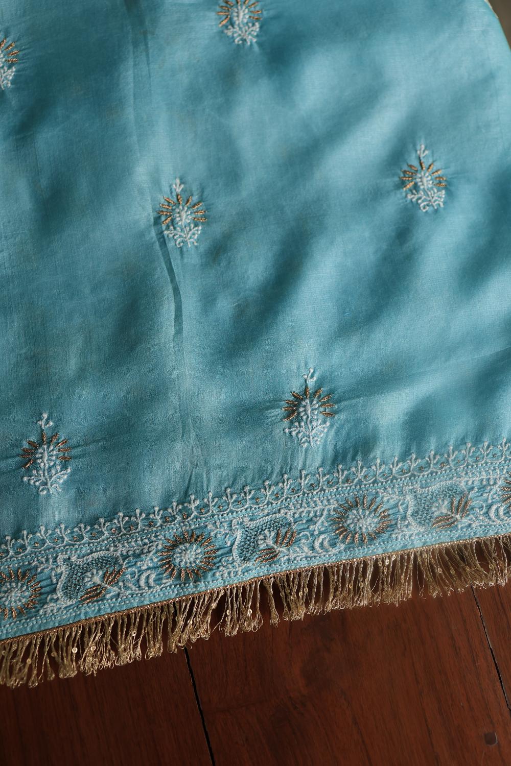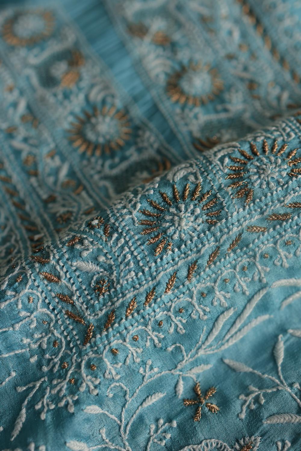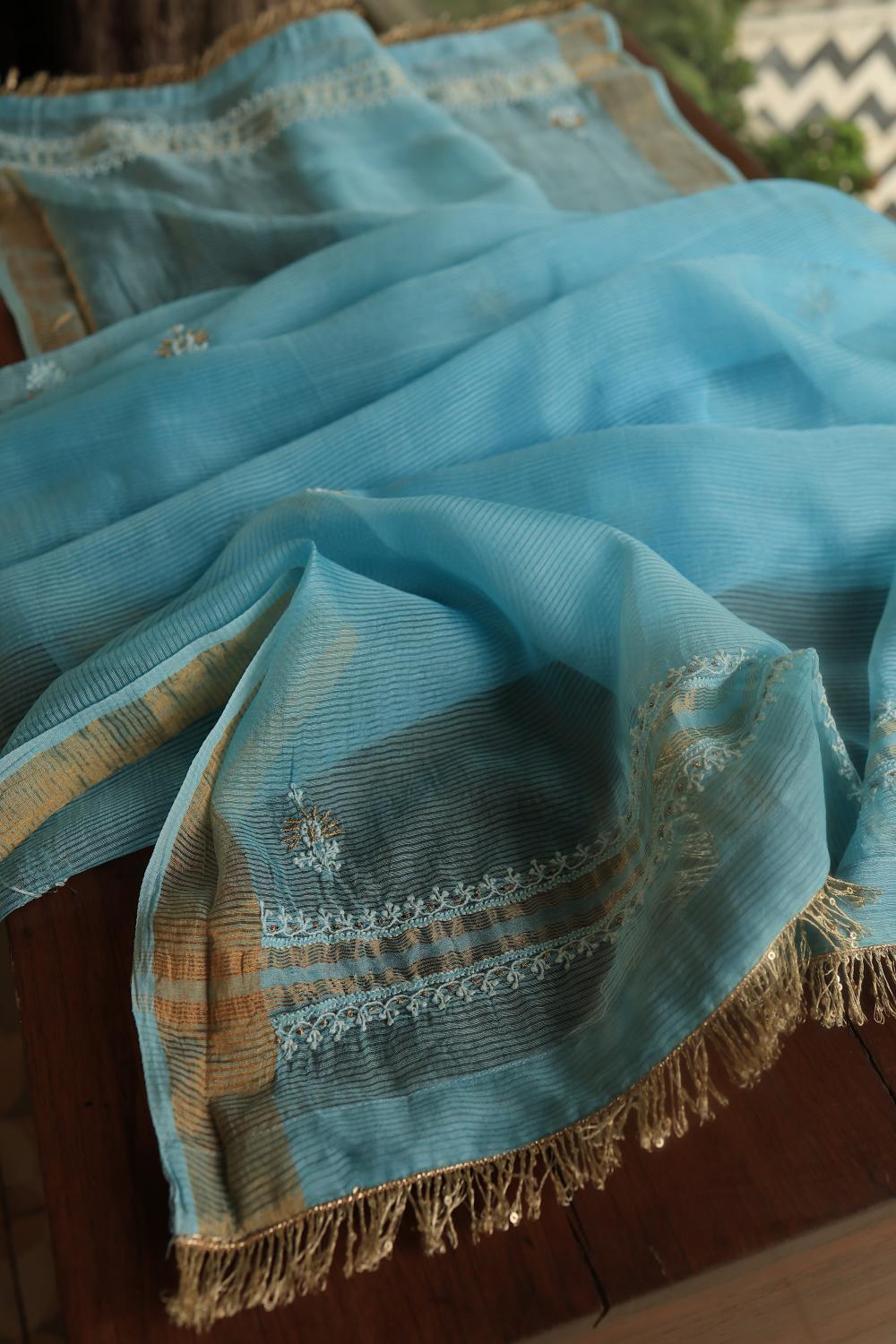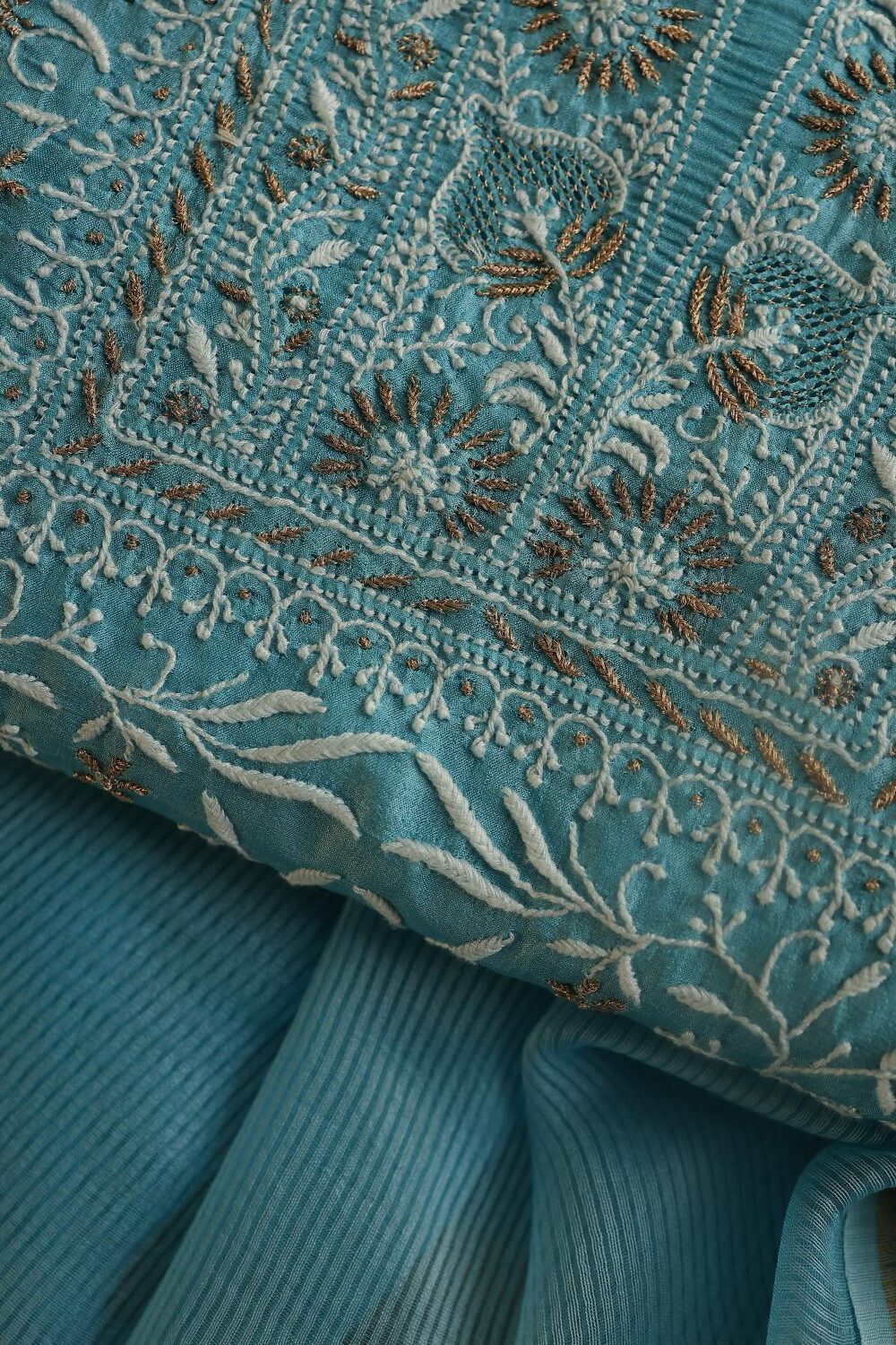 Blue Paper Tussar Resham Chikankari Unstitched Kurta Dupatta Set