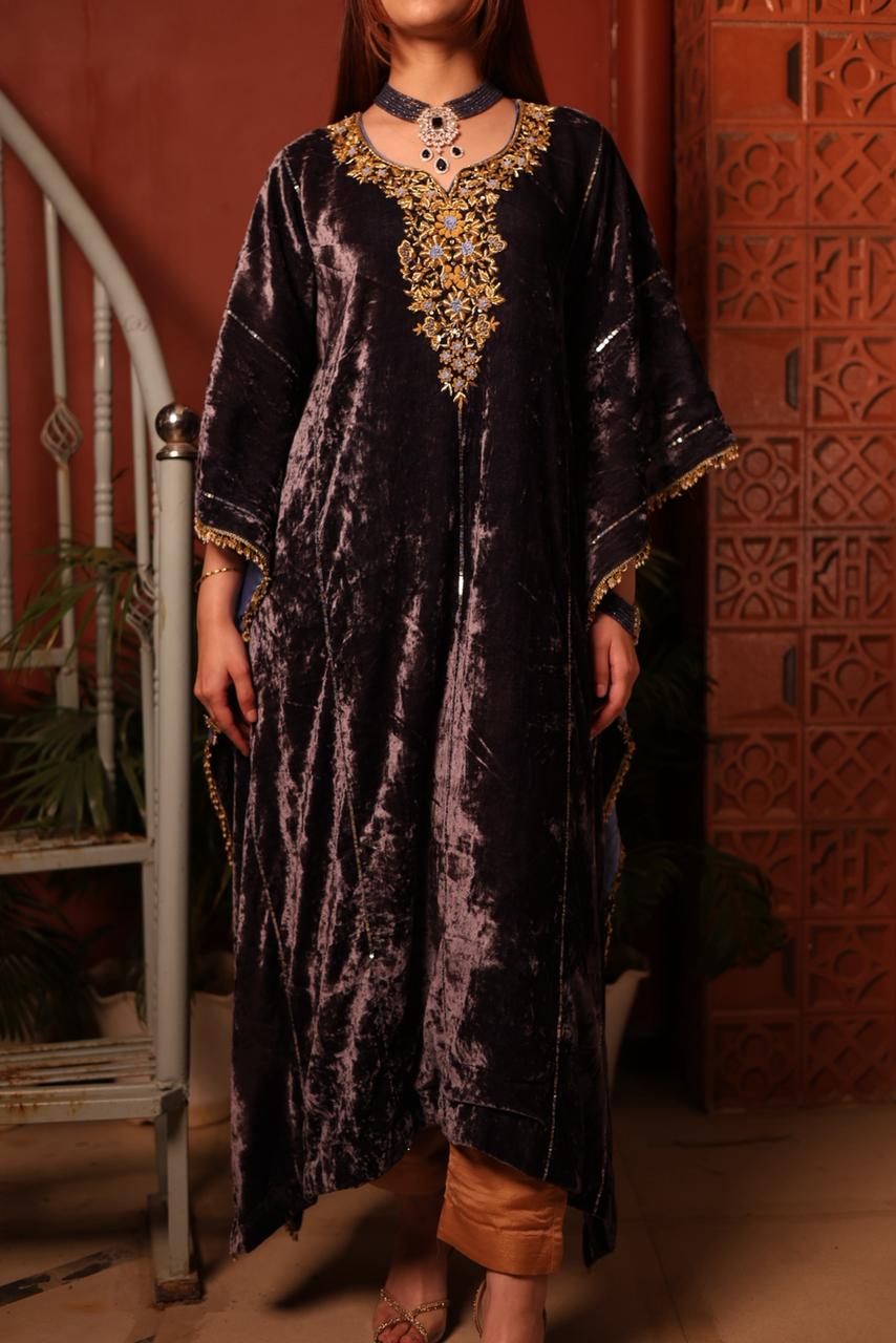 Traditional Awadhi zardozi on silk velvet short kaftan finished with coin lace comes with an inner slip perfect for upcoming sunny winter soirée’s.