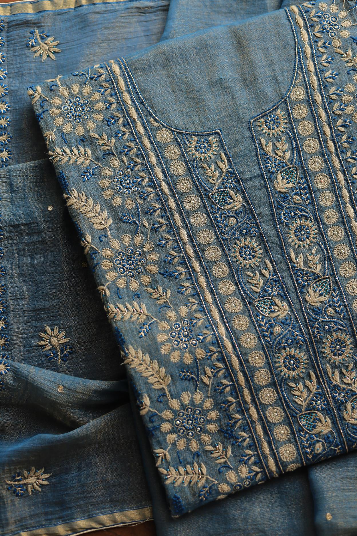 Blue Tissue Silk Chikankari Unstitched Fabric