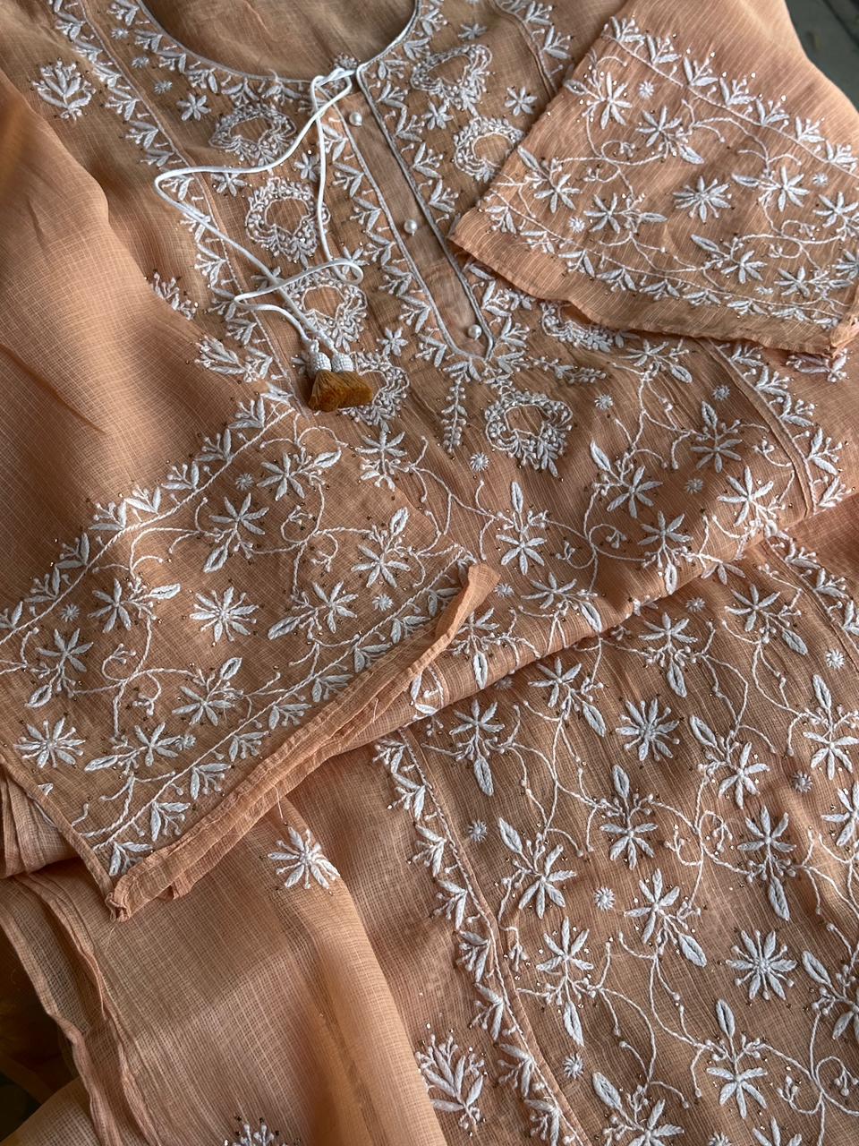 Each piece is crafted with intricate hand-embroidered Chikankari, featuring different traditional embellishments: