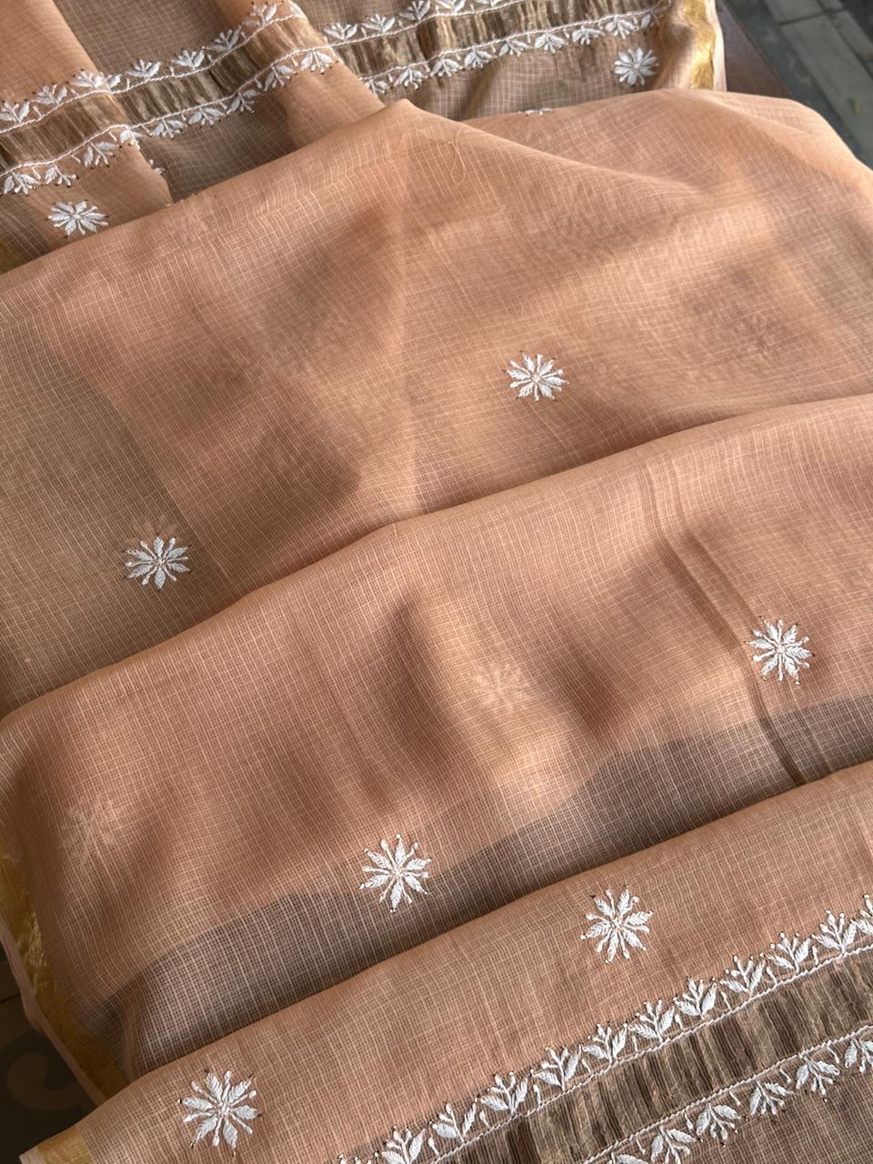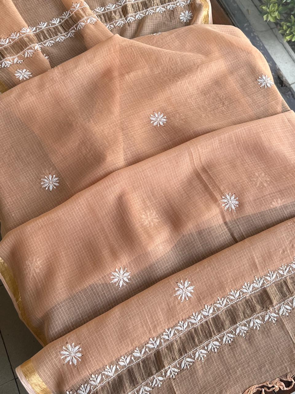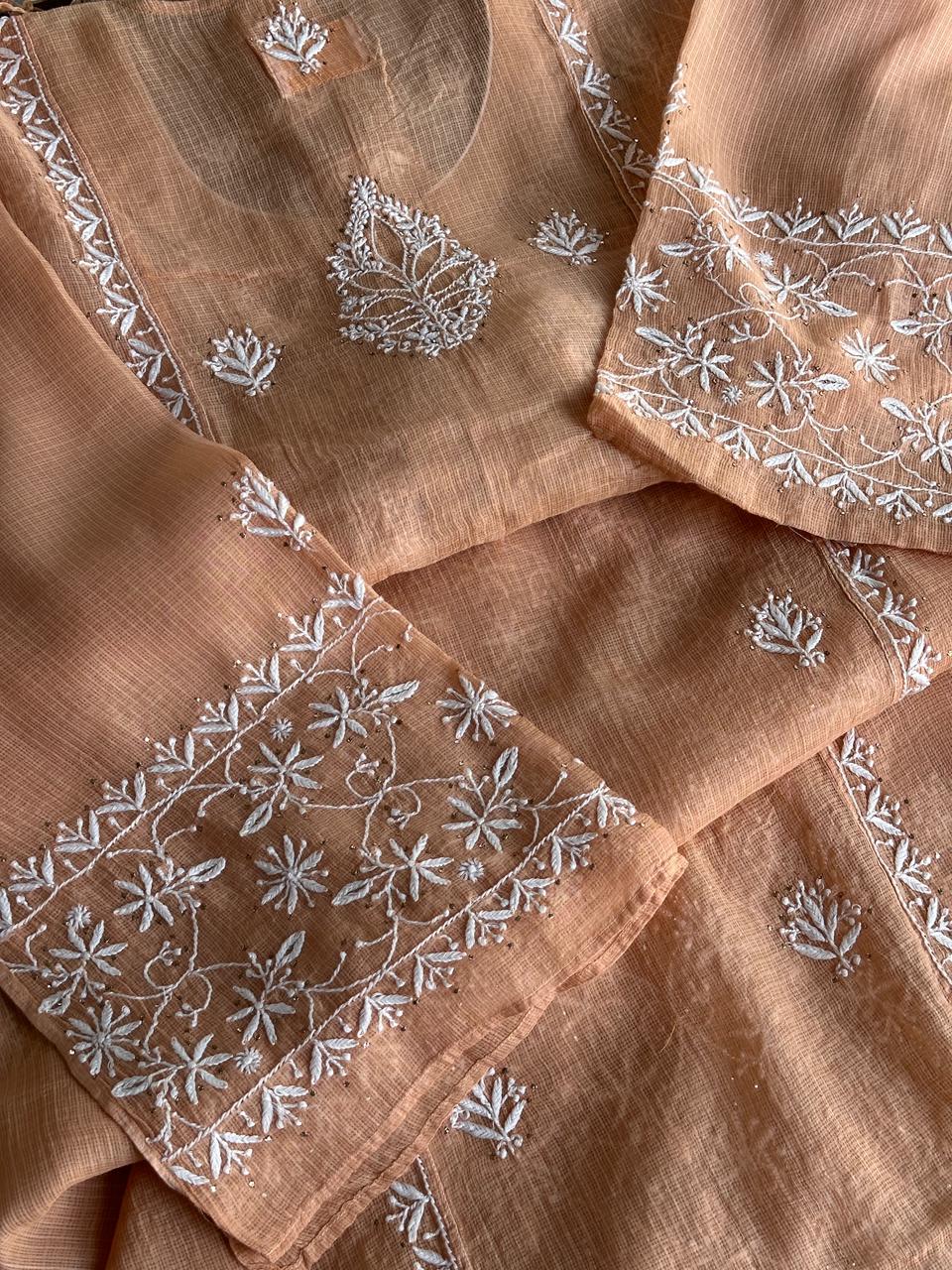 Blush Peach Shade Semi Stitched Kota Tepchi Chikankari Kurta Dupatta Set