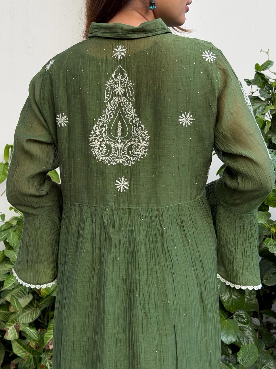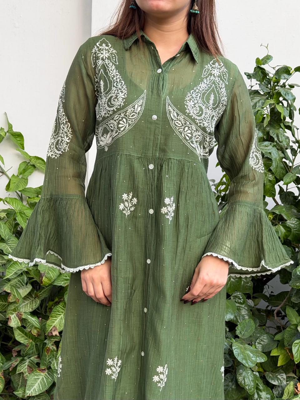 Bottle Green Mal chikankari Dress With Bell Sleeves