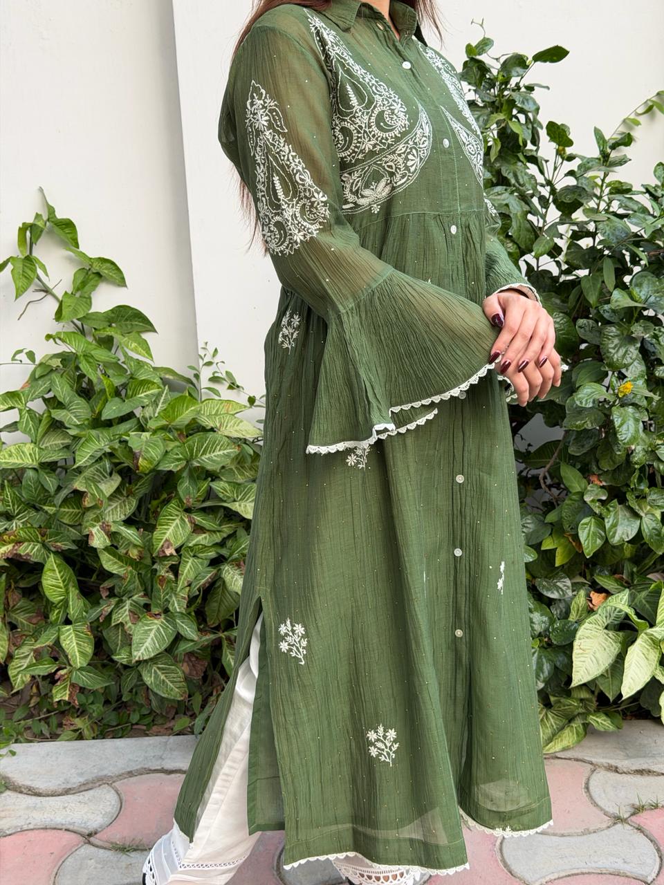 Bottle Green elegant one piece dress kurta with intricate Chikankari needle craft finished with fine cotton lace on hem and bell sleeves keeping the minimal cottage look while embracing the awadhi classiness at the same time.