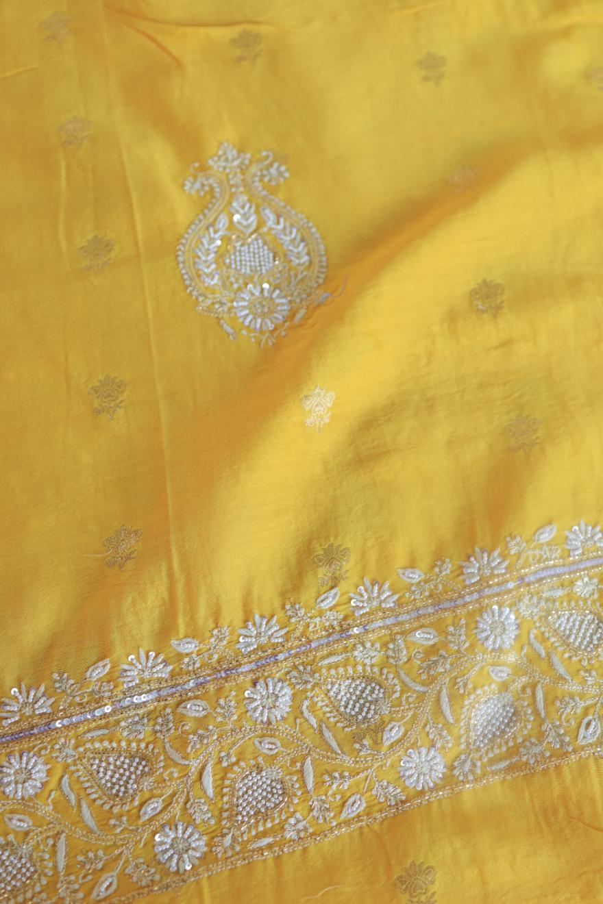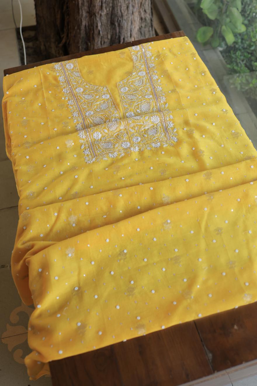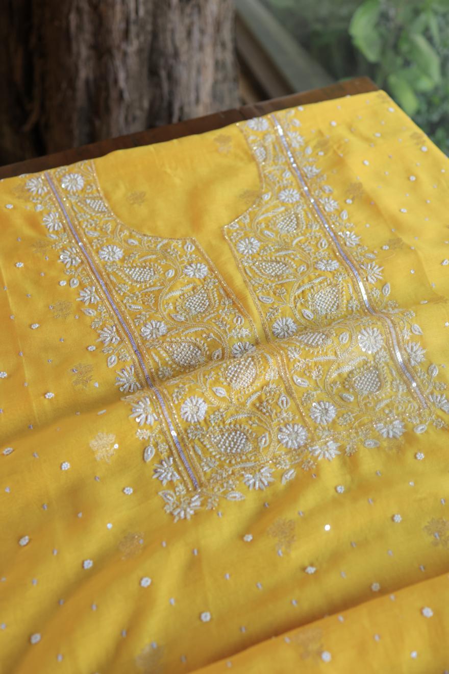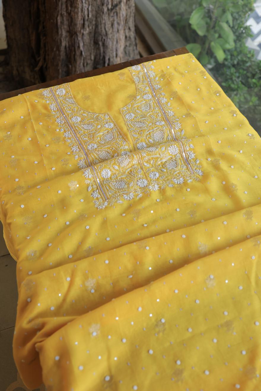 Bright Yellow Banarasi Zari Chanderi Unstitched Chikankari Fabrics