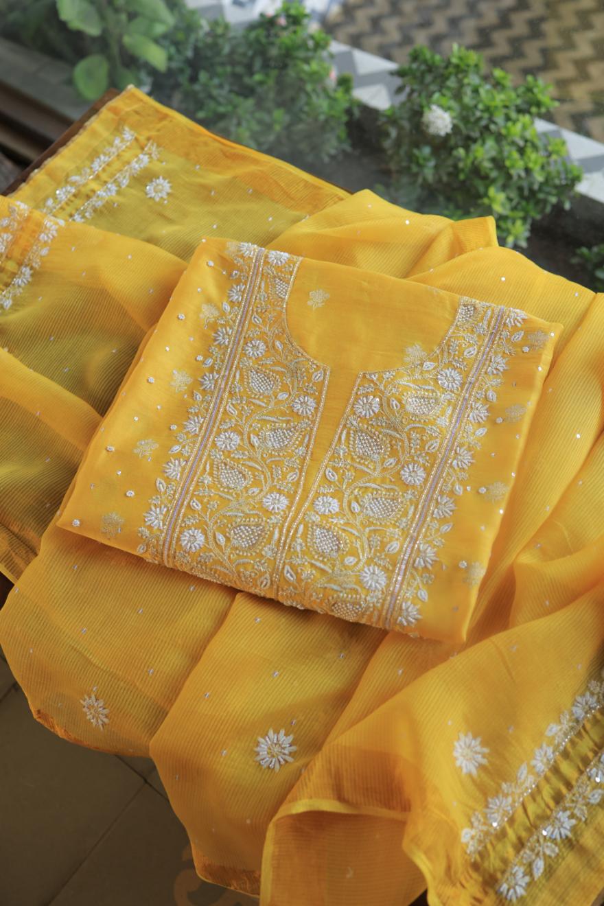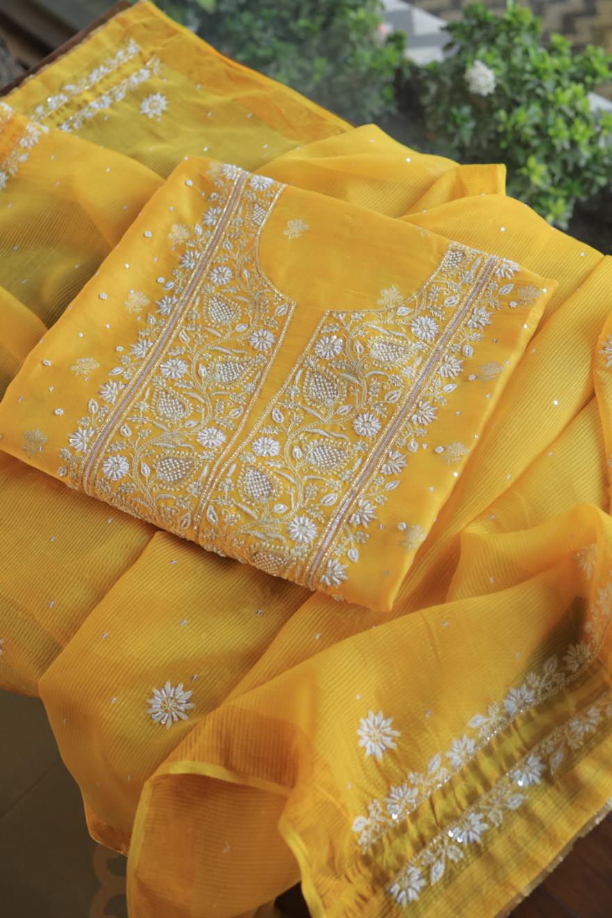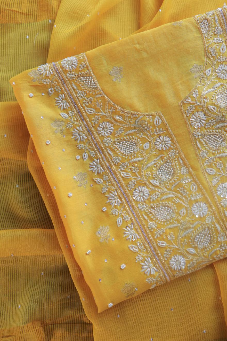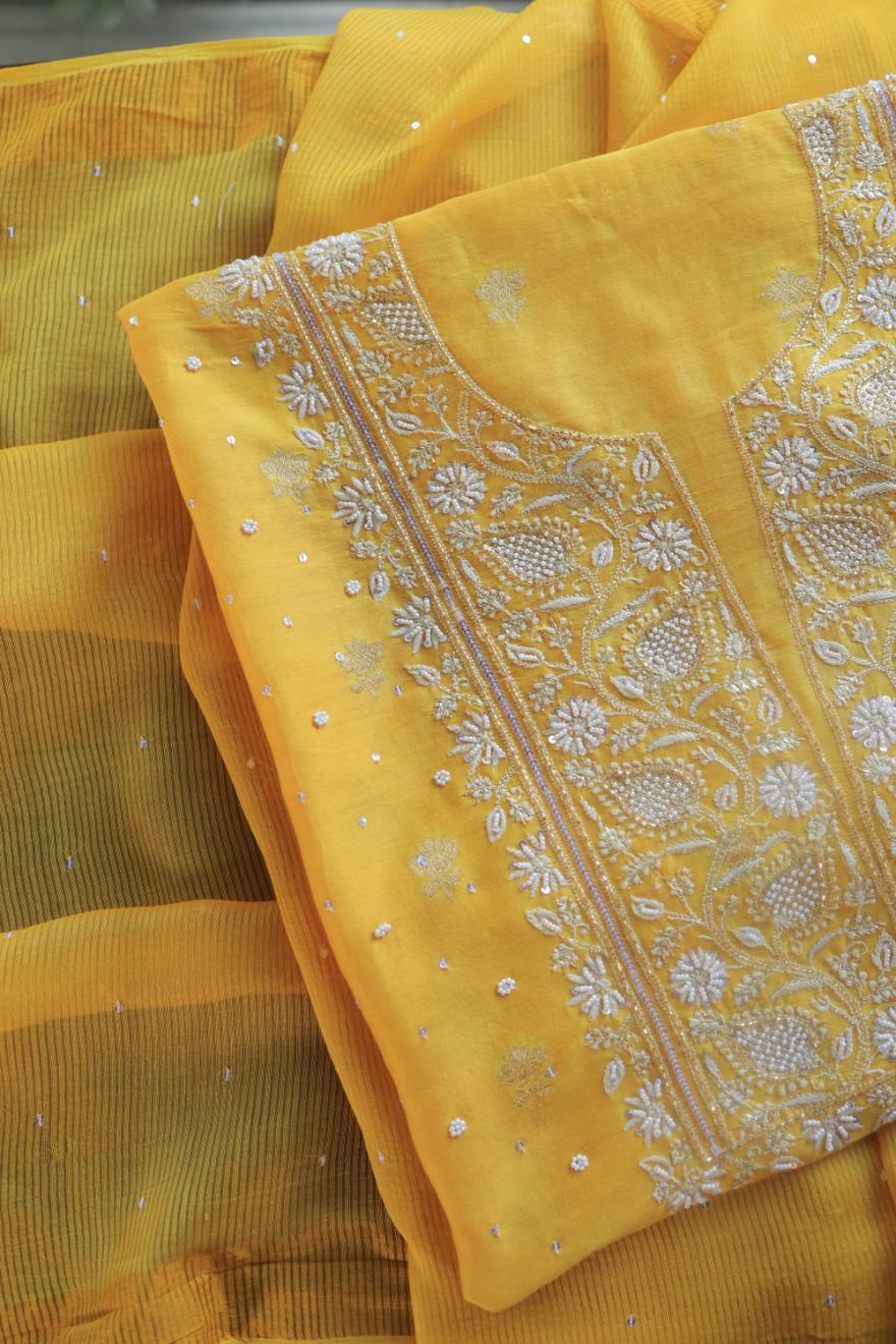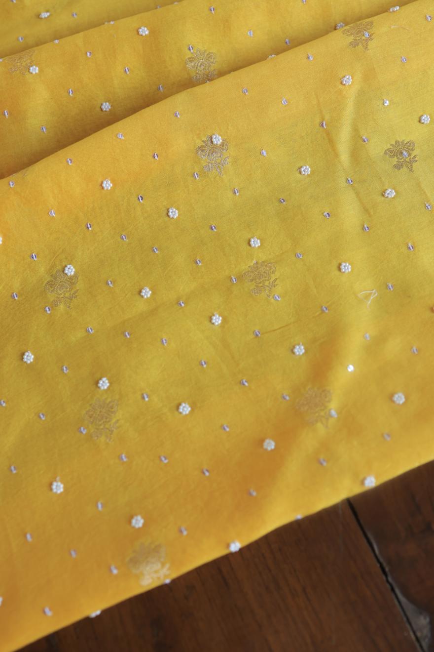 Bright Yellow Banarasi Zari Chanderi Unstitched Chikankari Fabrics