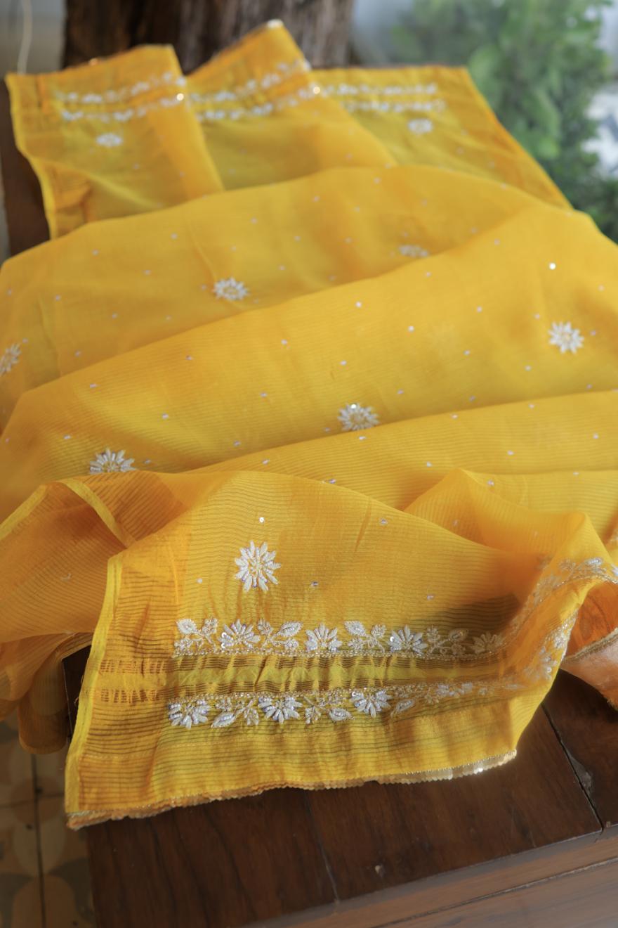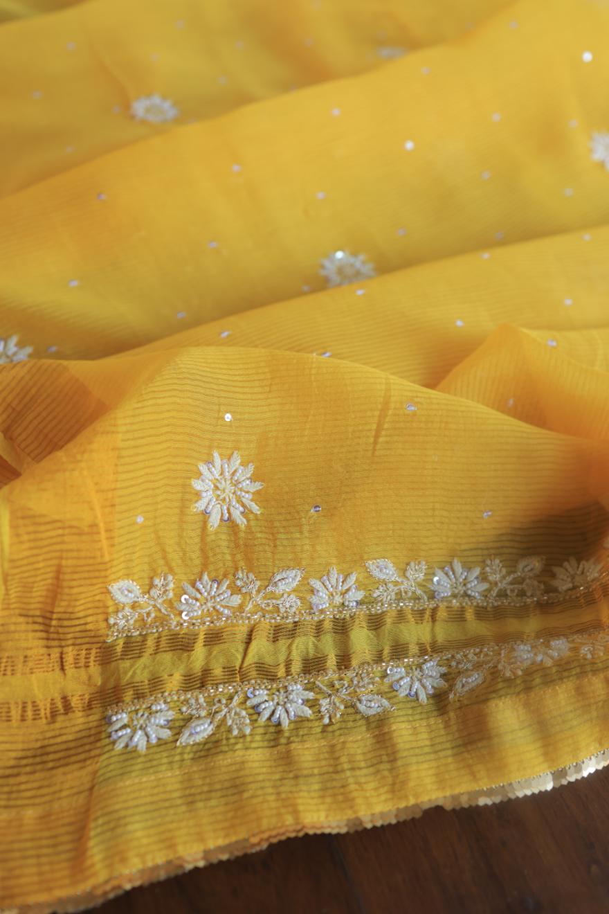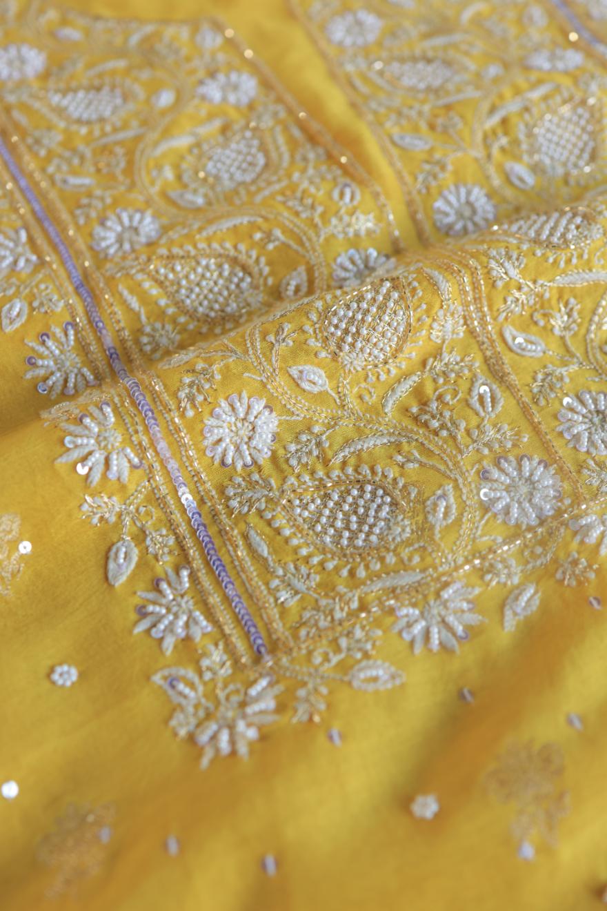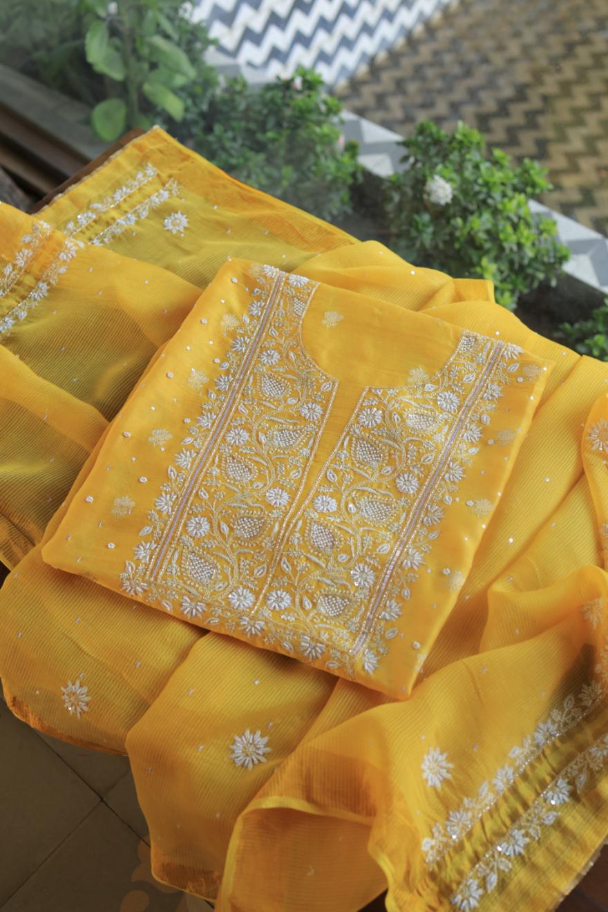 Bright Yellow Banarasi Zari Chanderi Unstitched Chikankari Fabrics