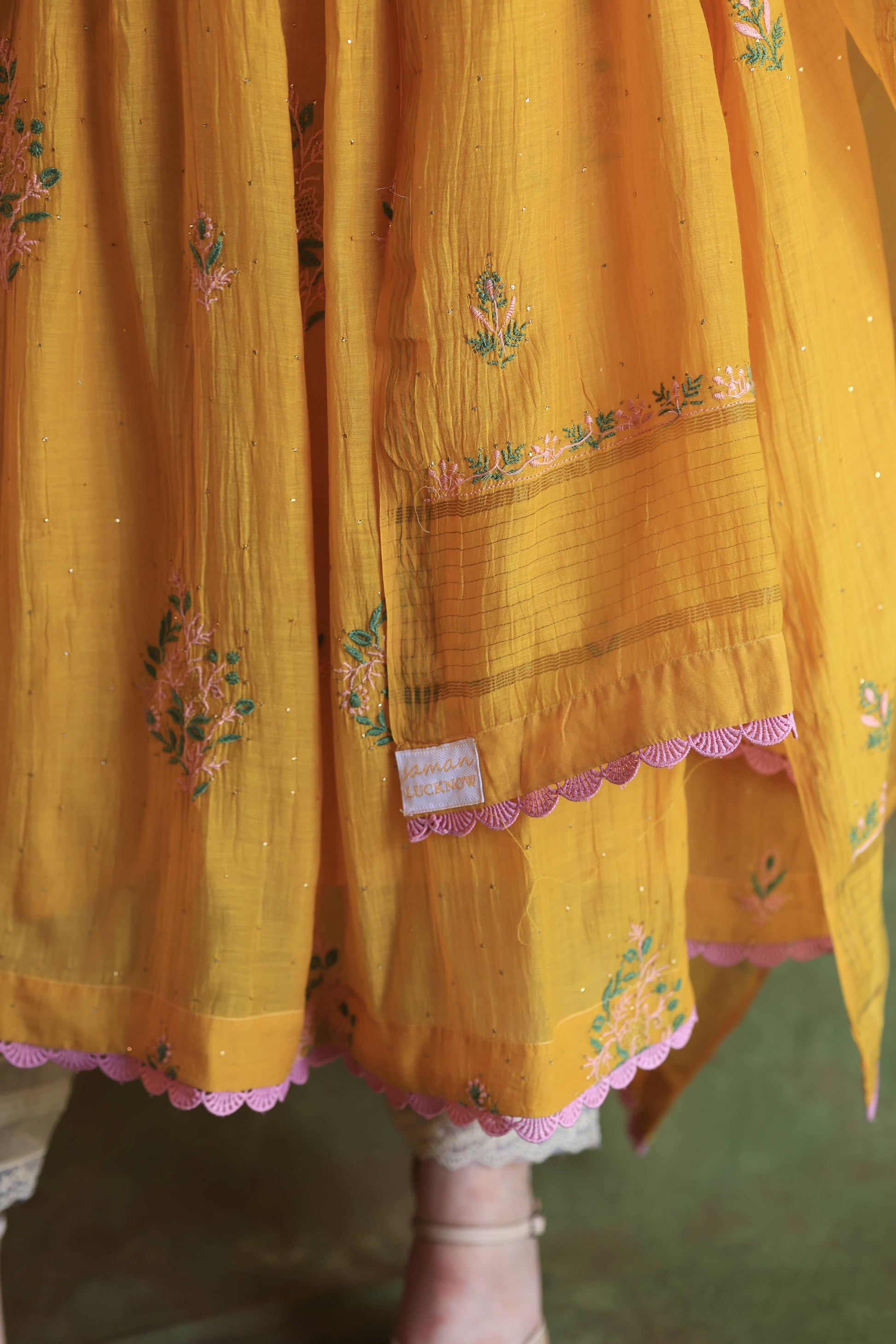 Saffron Yellow Shade | Malmal Mukaish Kamdani Chikankari Stitched Kurta Dupatta Set
