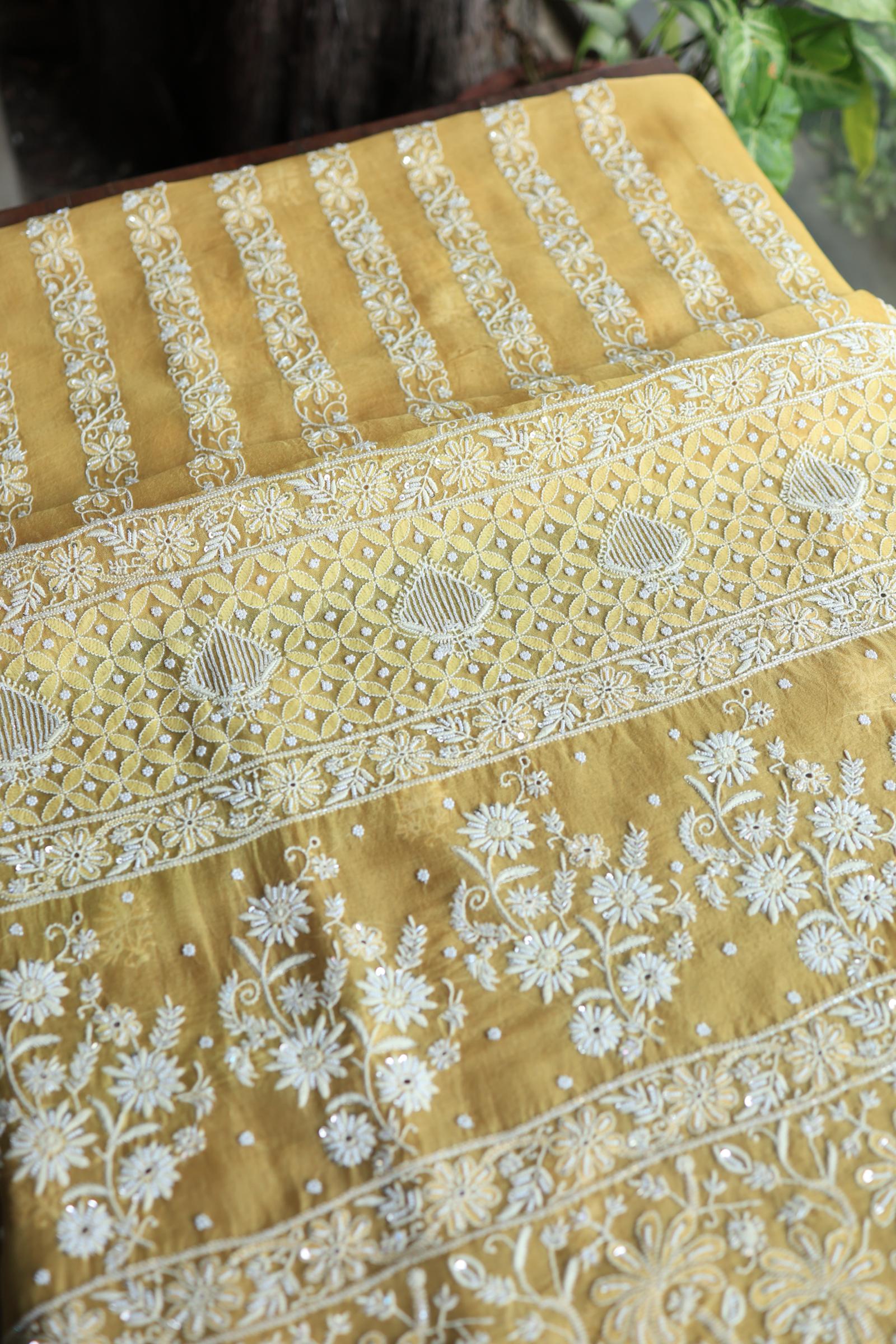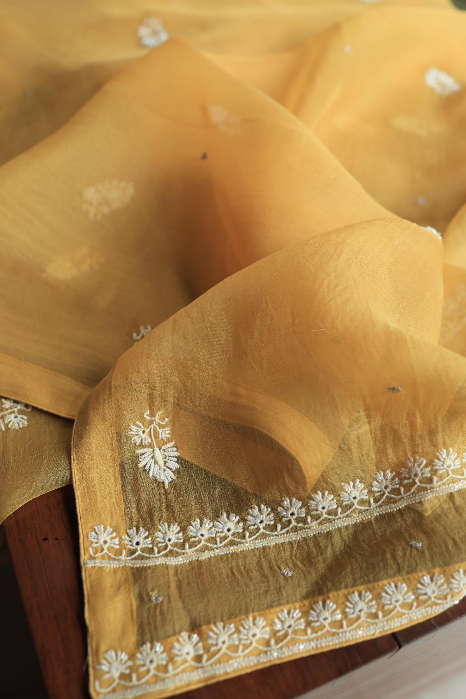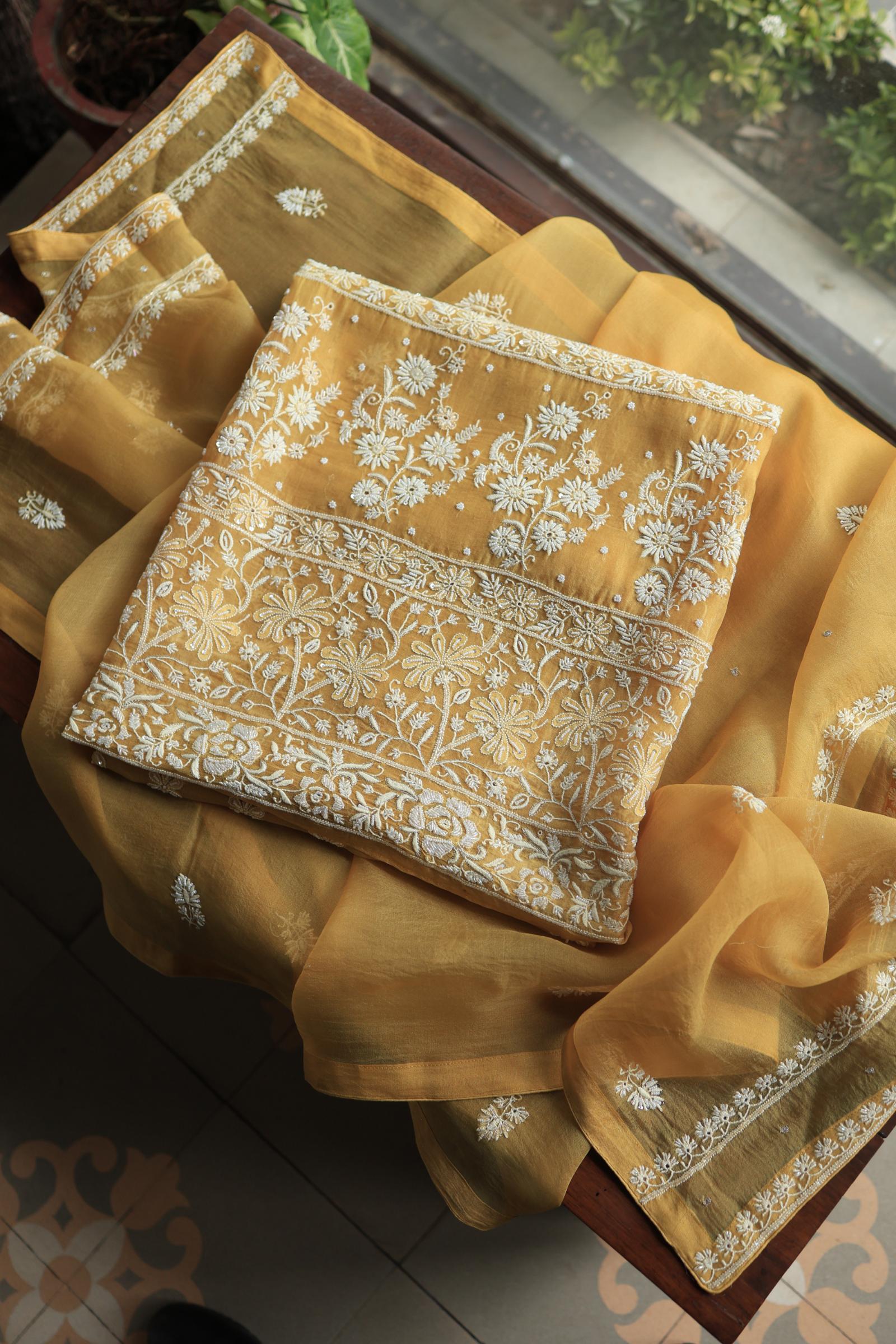 Butter Yellow Noor Organza Banarasi Silk Chikankari Unstitched Kurta Dupatta Set