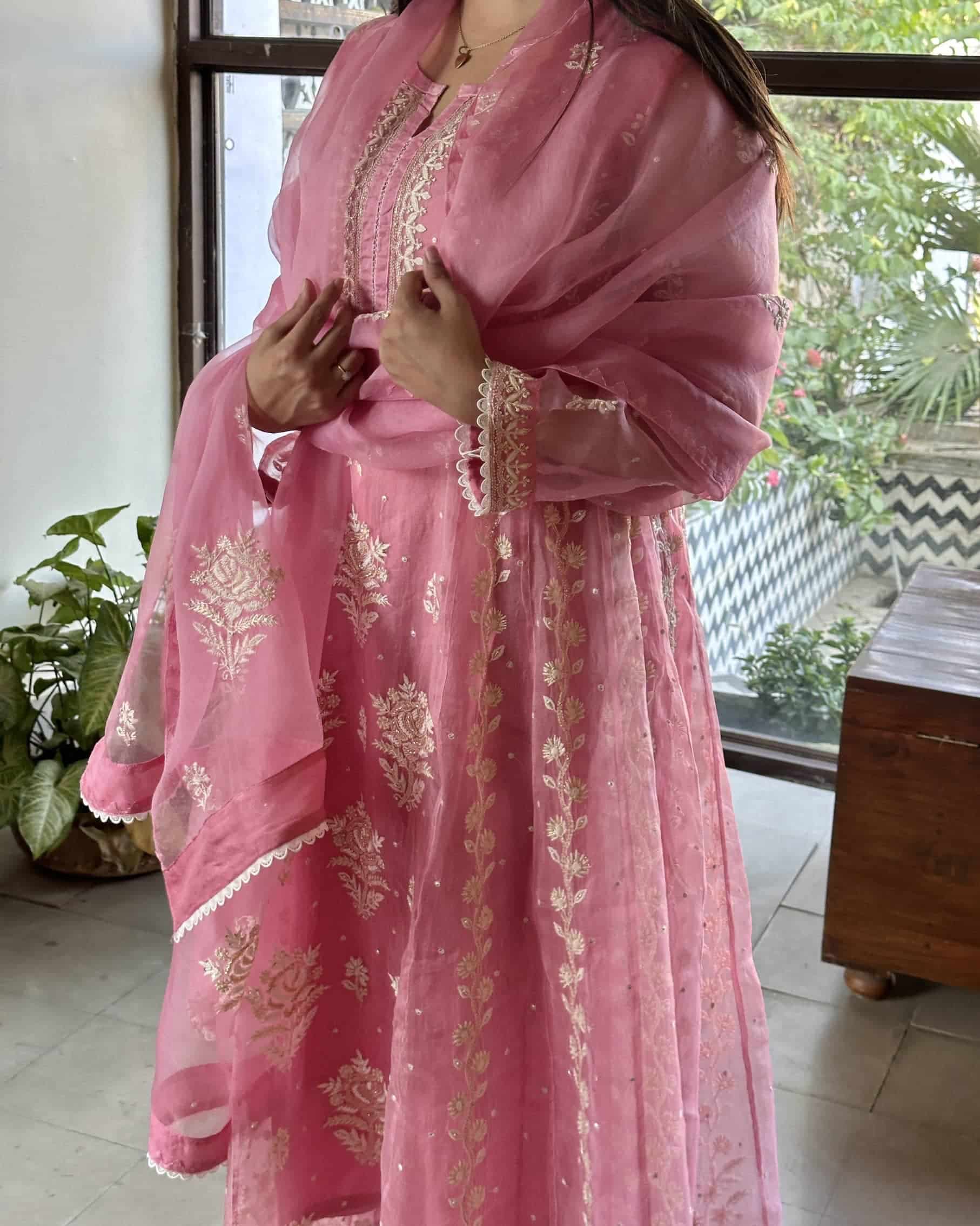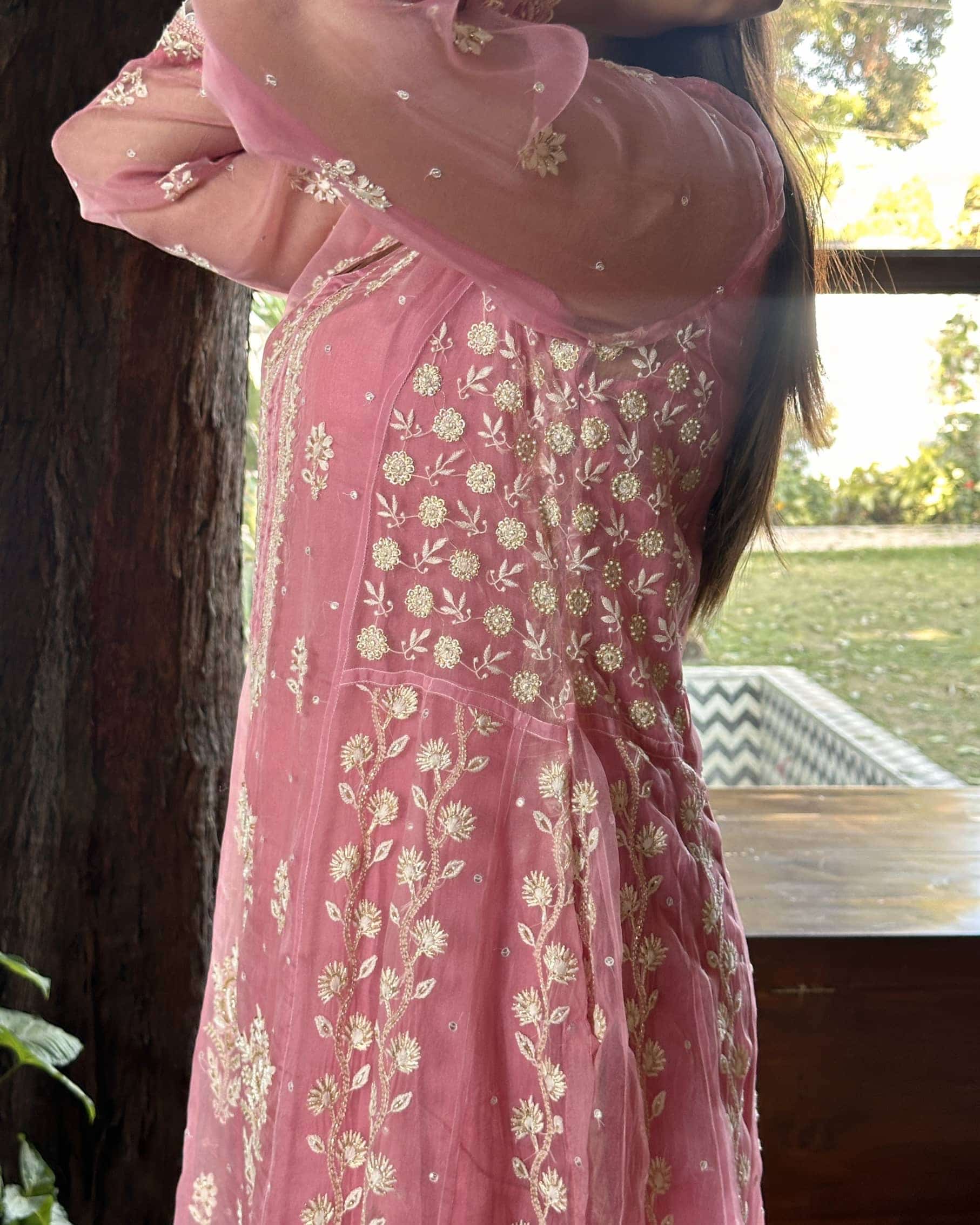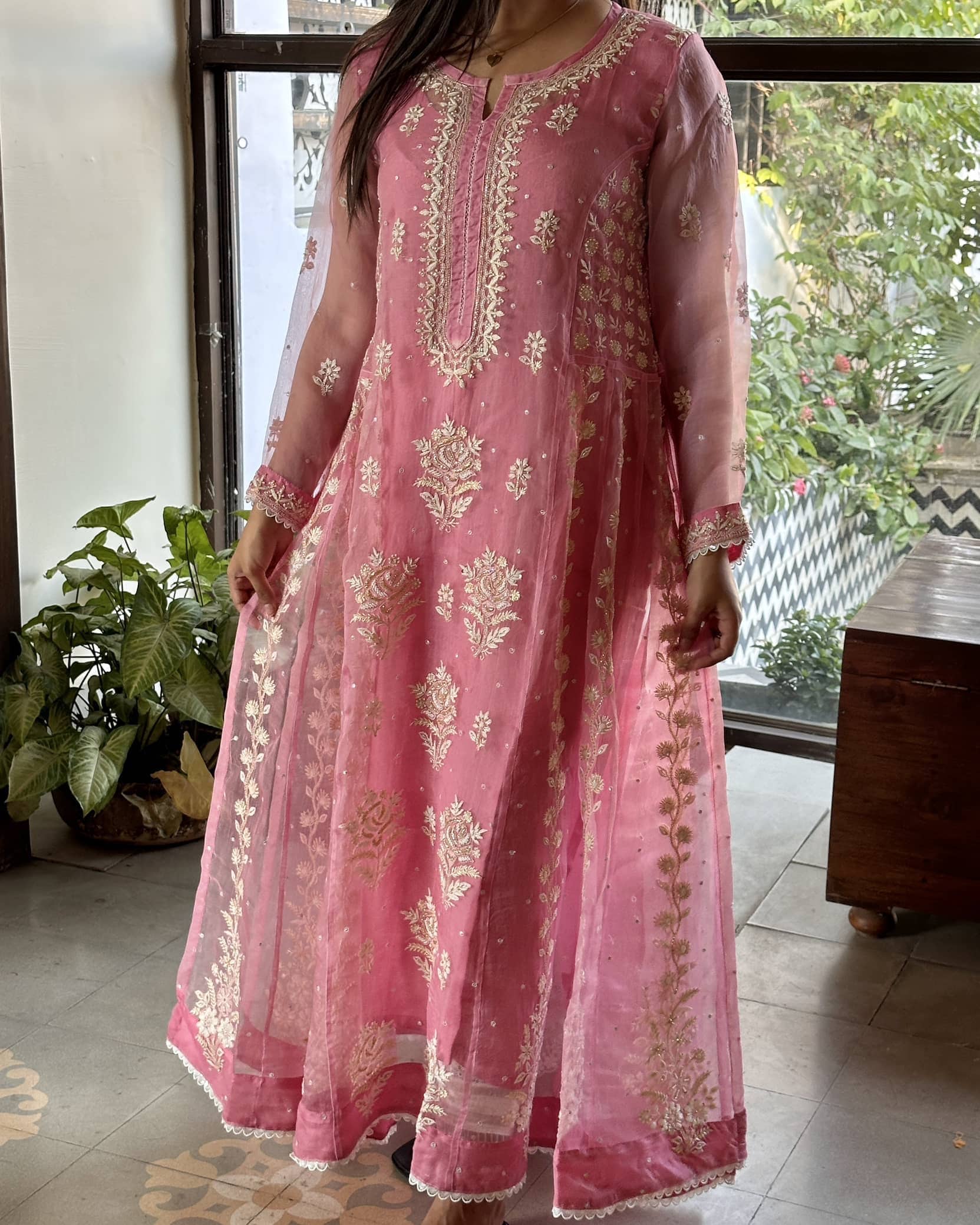 Candy Pink Noor Organza Chikankari Anarkali With Dupatta