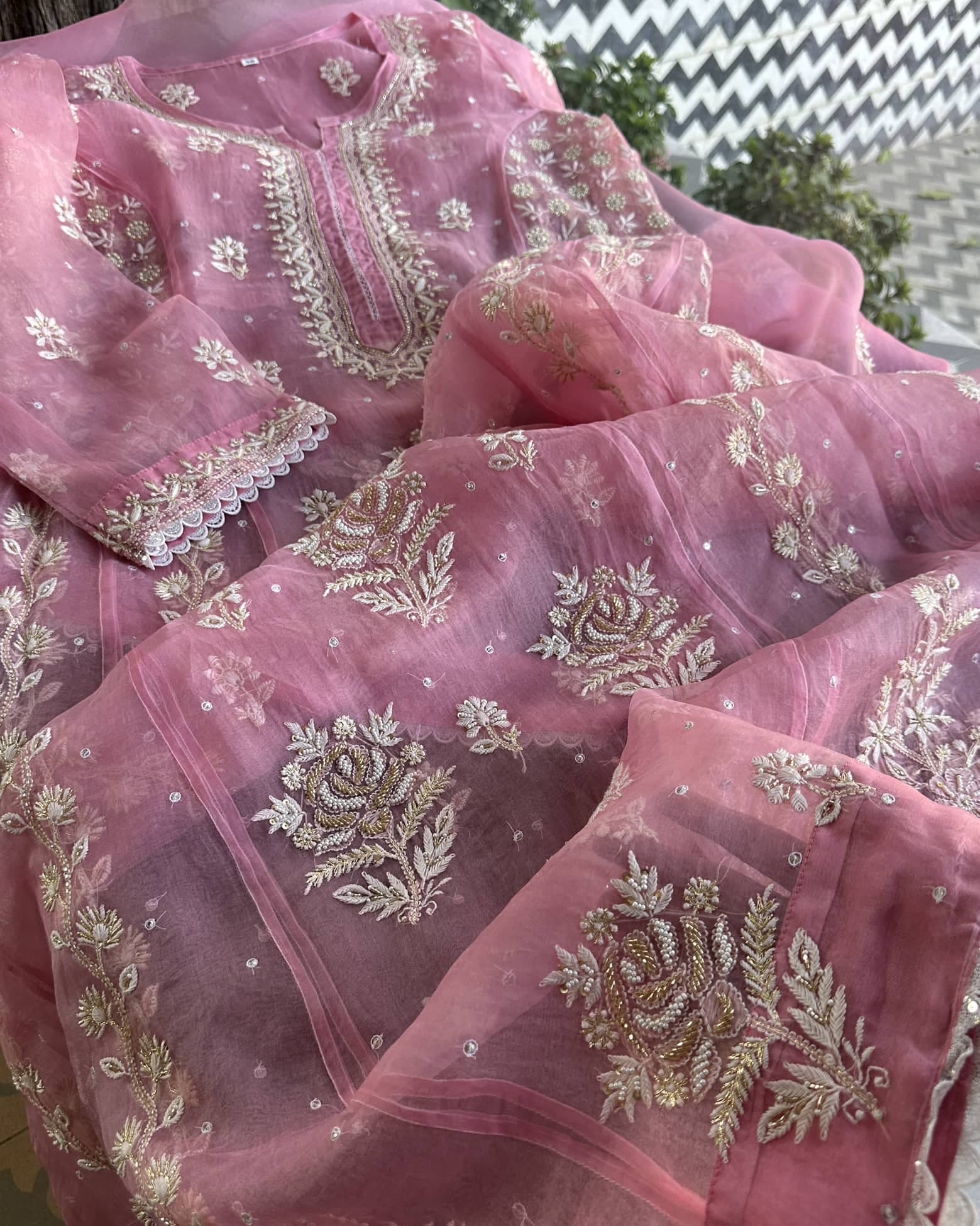 Silk organza Chikankari with subtle highlighting of ari/sequins comes in various sizes finished with floral lace on kurta and dupatta perfect for coming summer festivities.