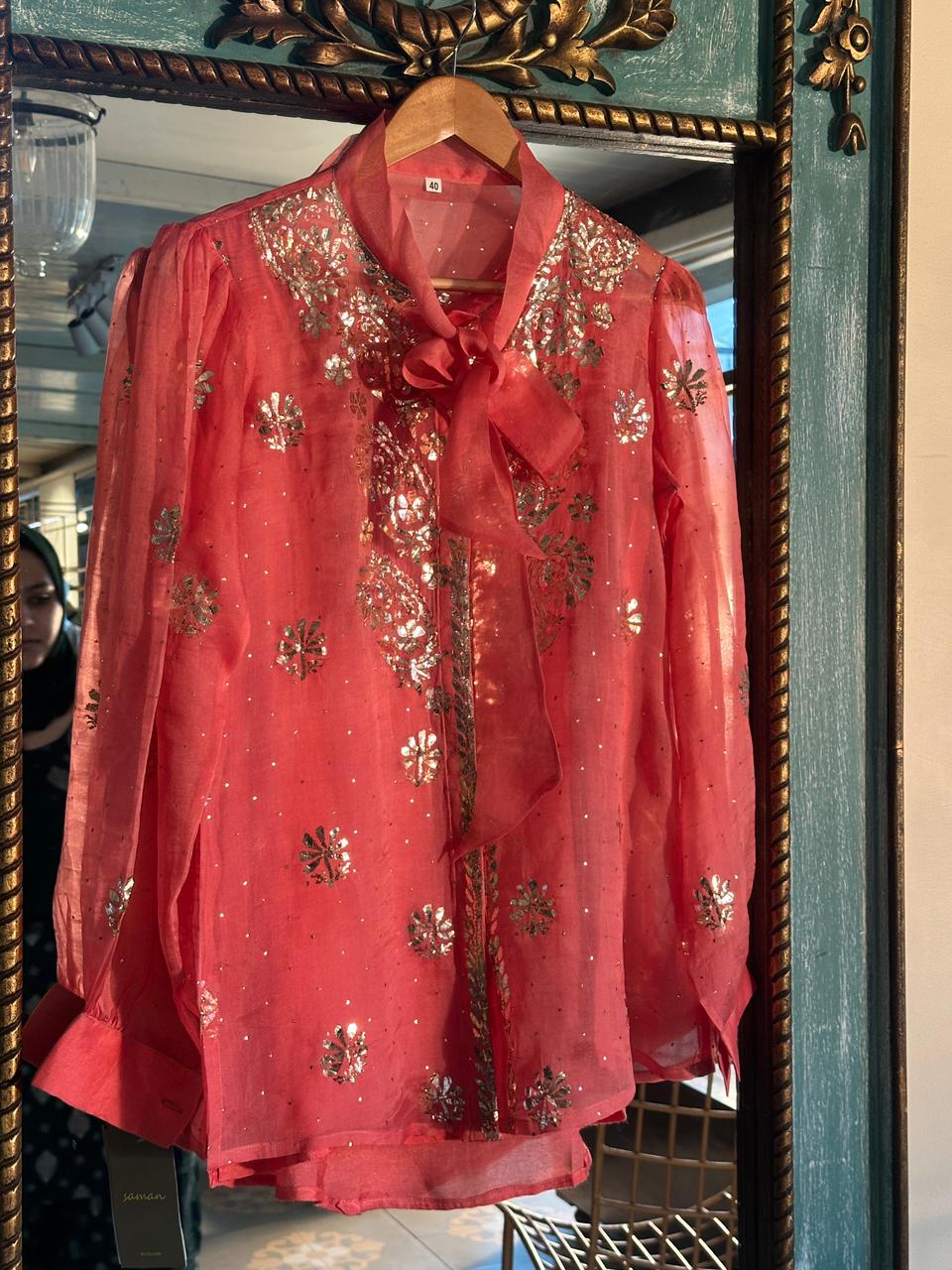 Carrot Pink Noor Organza Mukaish Badla Short Top With Bow Tie