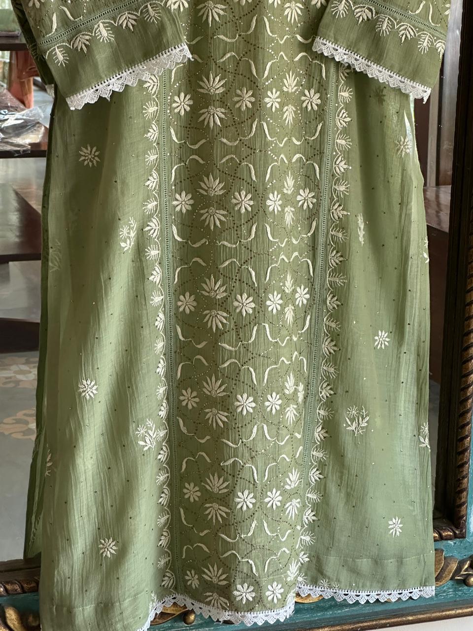 Clay Green Mul Chanderi Mukaish Kamdani Chikankari Stitched Kurta Dupatta Set