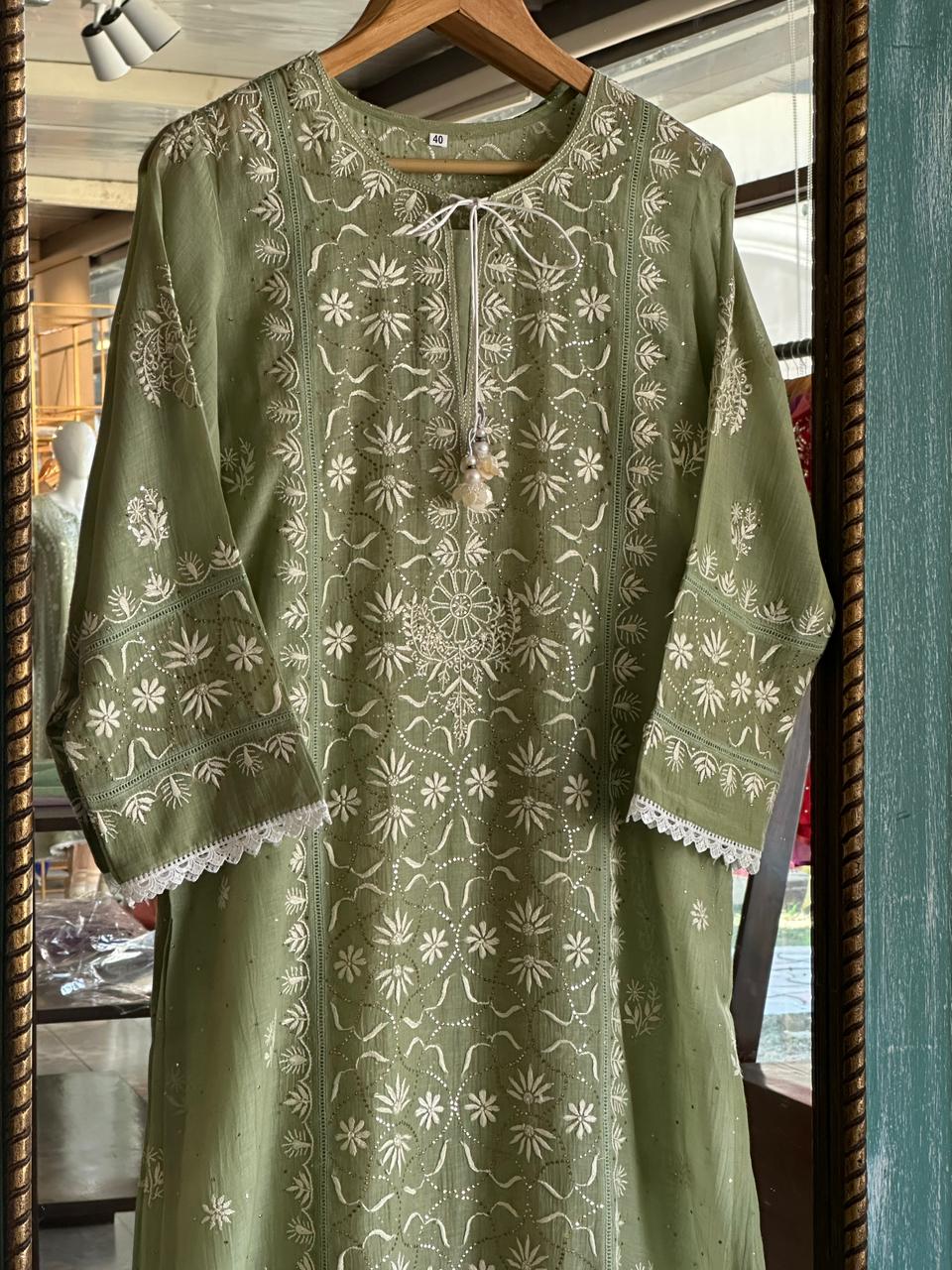 Each piece is crafted with intricate hand-embroidered Chikankari, featuring different traditional embellishments:
