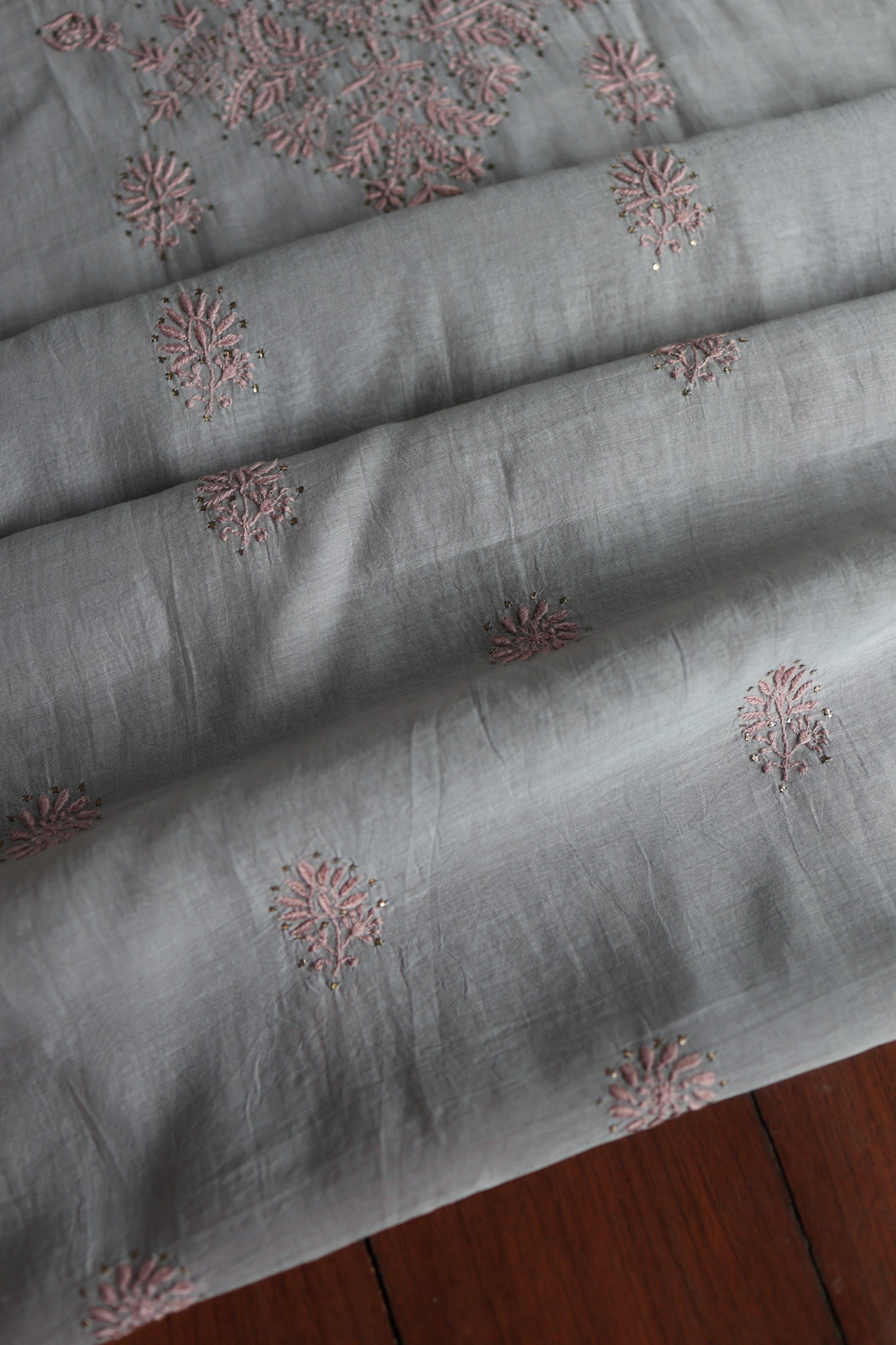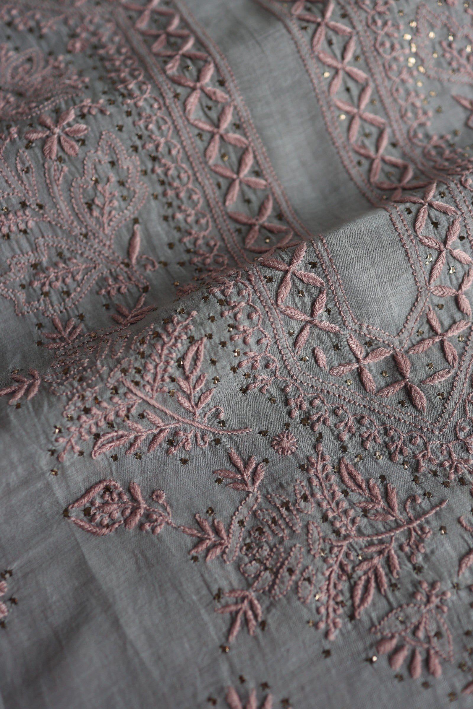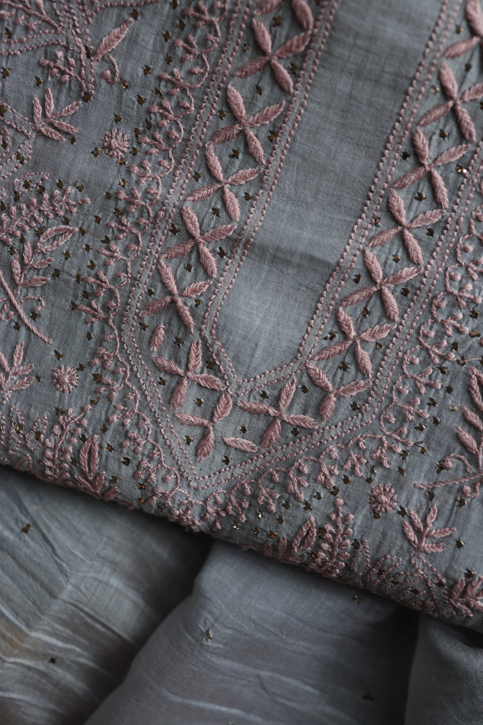 Cloud Grey Shade Mal Cotton Chikankari Unstitched Fabrics With Kamdani