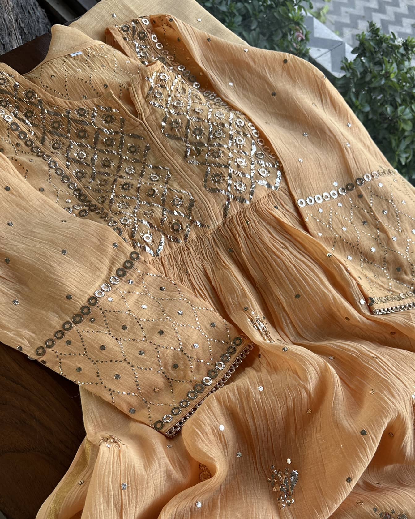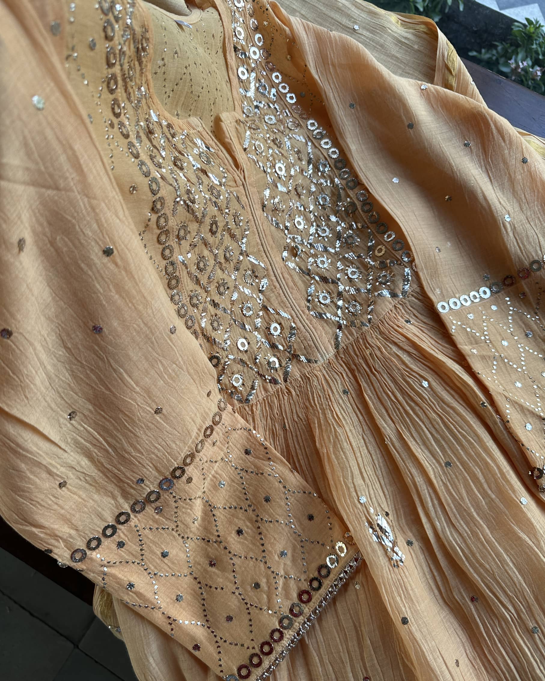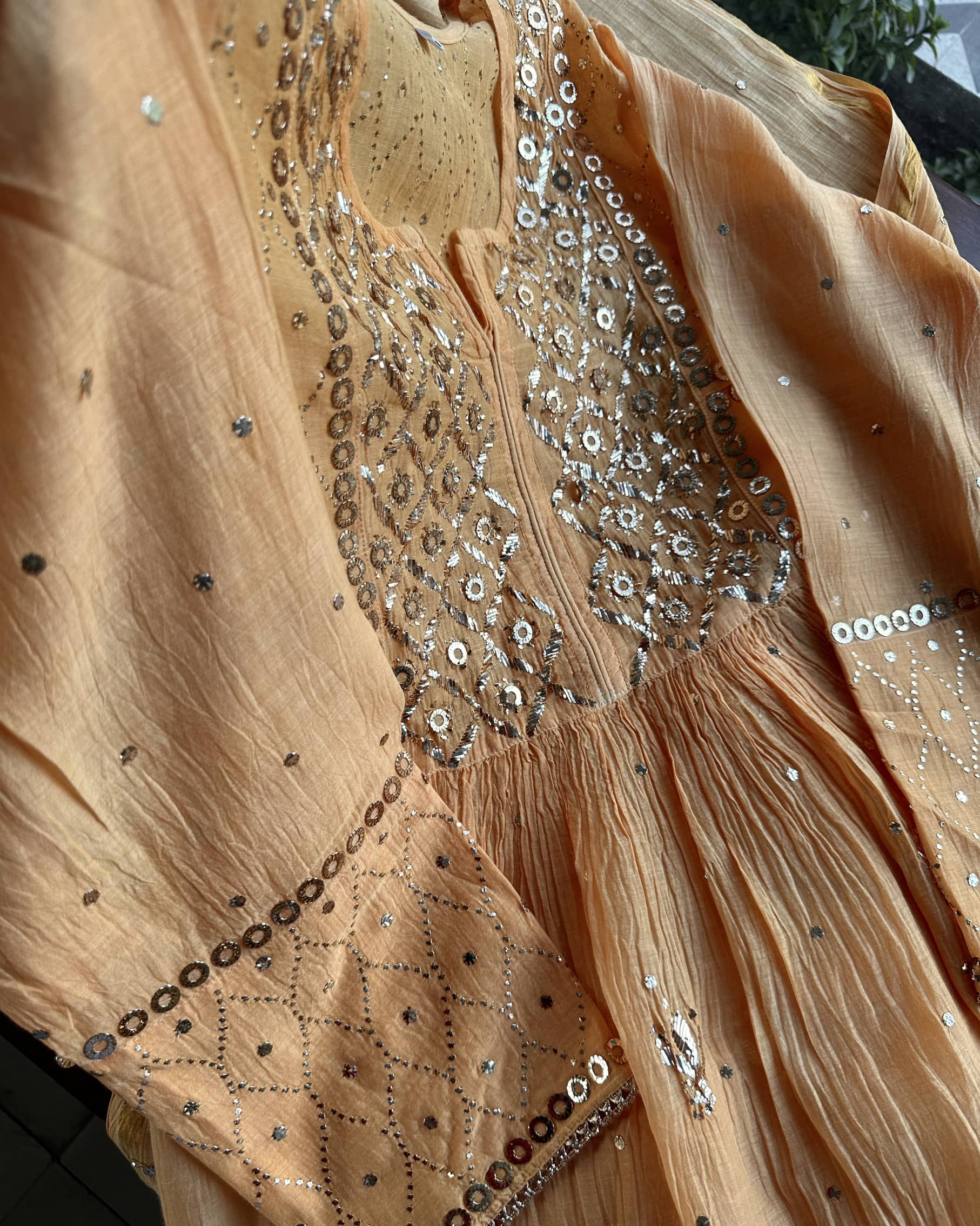 Coral Peach Mukaish Mul Chanderi Silk Dress