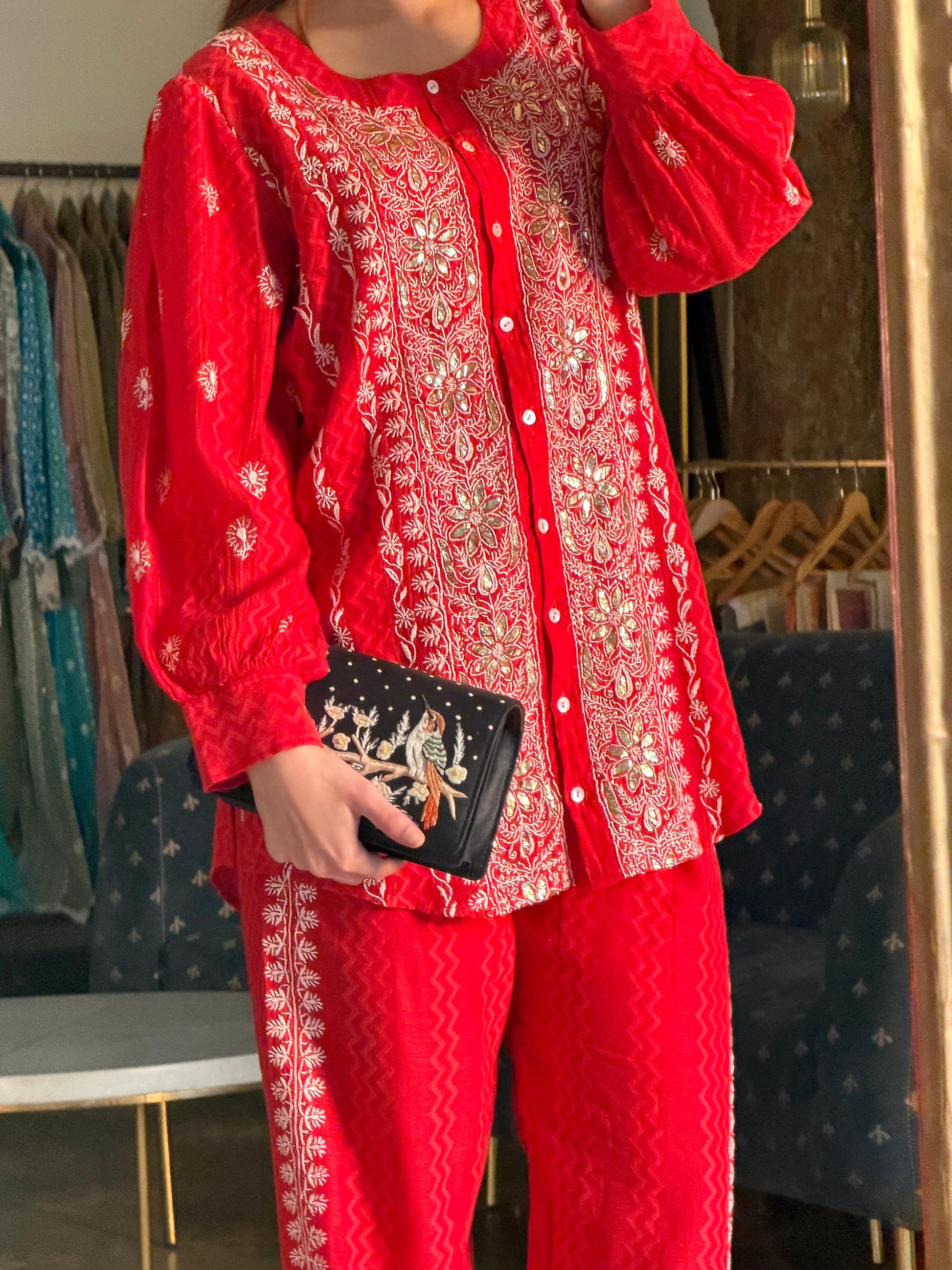 Crimson Red | Jacquard Sequins Chikankari Co-Ord Set