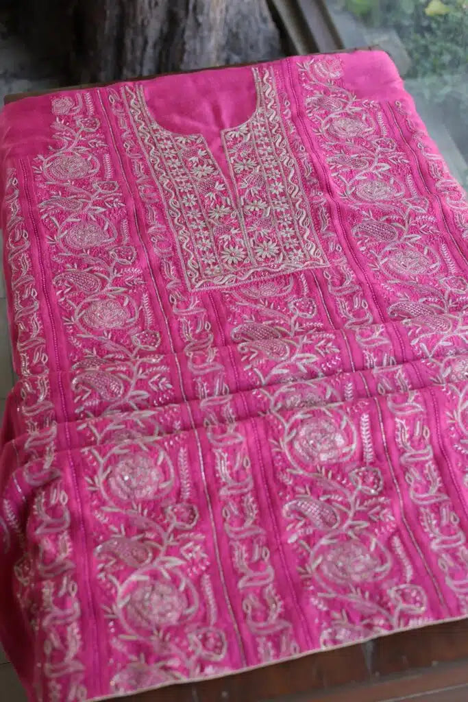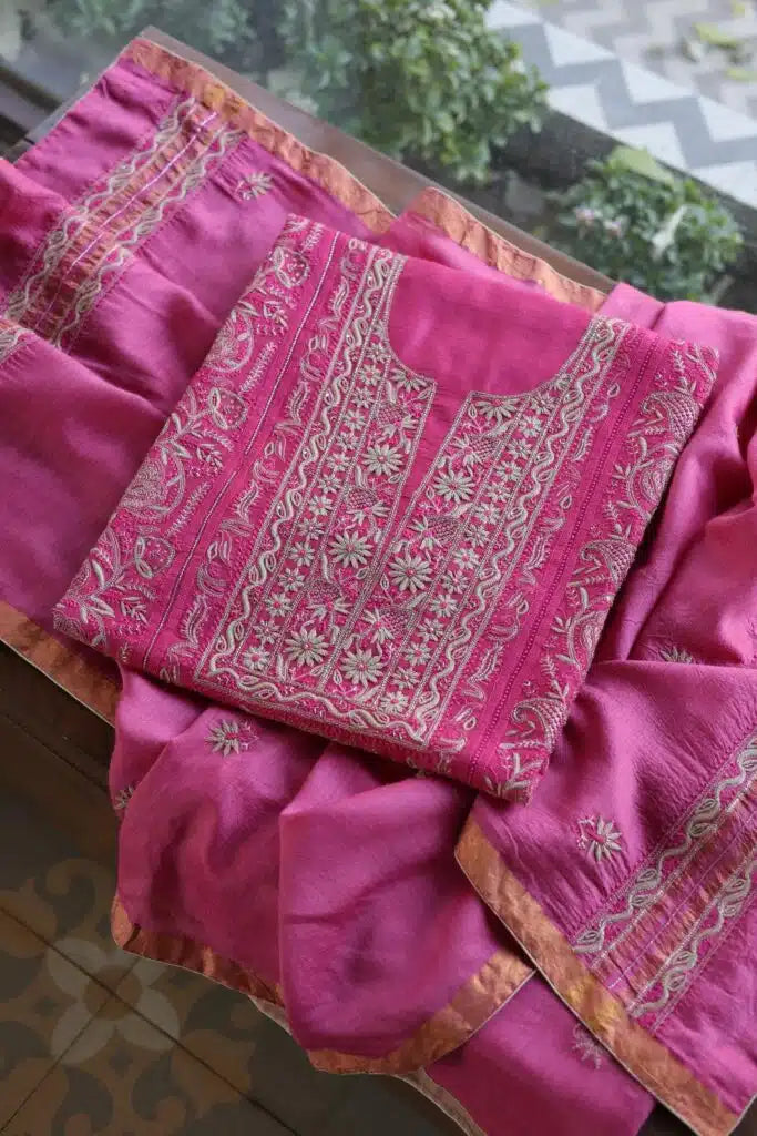 Dark Pink Moonga Silk Chikankari Unstitched Fabric