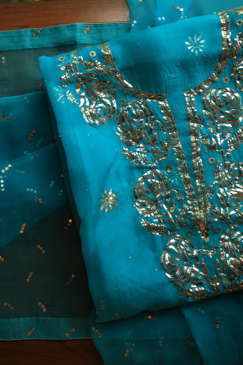 Deep Teal Shade Noor Organza Silk Chikankari Unstitched Kurta Dupatta Set