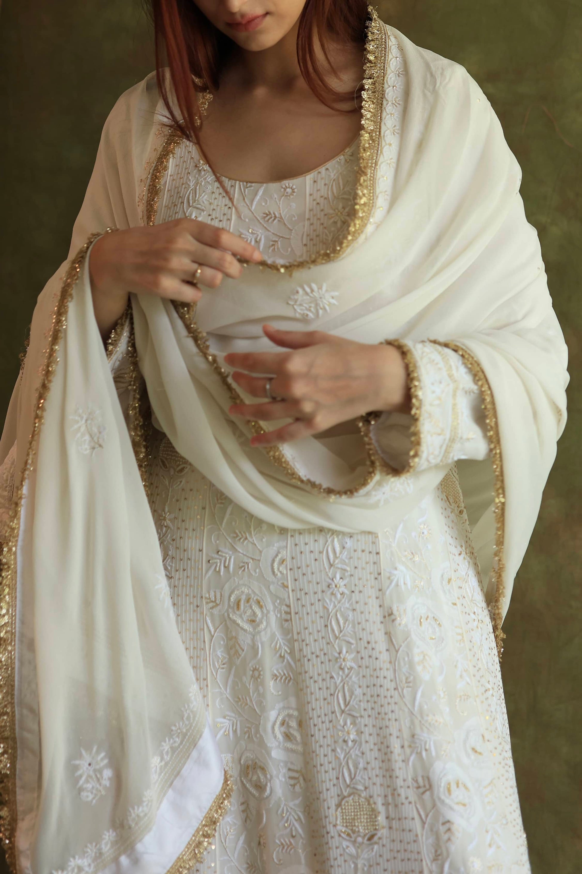 Intricate Chikankari with heavy load of ari sequins work done pure georgette fabric comes with an elegant motif dupatta finished with golden lace edging heavy Chikankari on front kurta for the dainty soirée.
